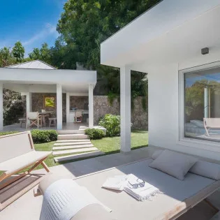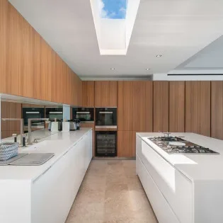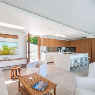 The interiors of Villa Palm are modern and chic, with a minimalist style encouraging you to unwind. The white walls are contrasted with rustic wooden accents, creating a dreamy, island vibe. A clean design features stylish vaulted ceilings, skylights, and warm, recessed lighting above.