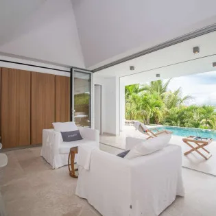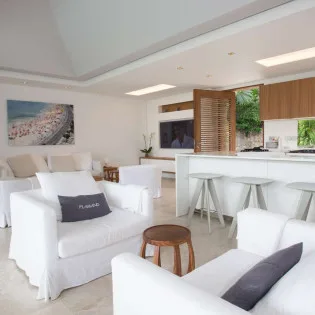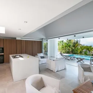 At the center of Villa Palm is the open-plan great room, home to the modern living room and kitchen. The entire wall at the far end opens to the outdoor terrace, letting in the salty ocean breeze. Greys, whites, and dappled natural sunlight all enhance the striking and modern design.