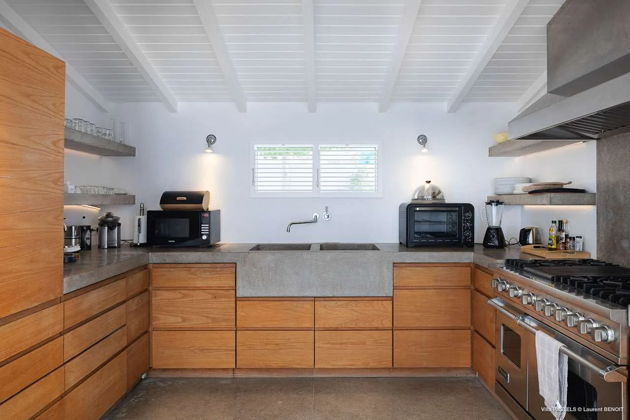 The chic kitchen at Villa Pastels features natural wood for its cabinetry, creating a tropical feel that’s inspiring when it comes to preparing your meals. High-end cooking appliances can also handle any culinary challenge you can think of.