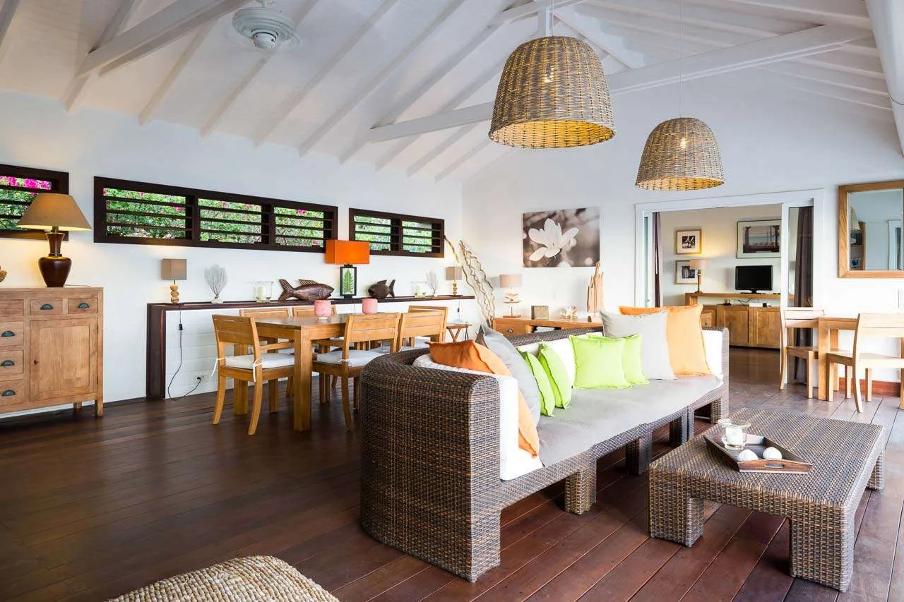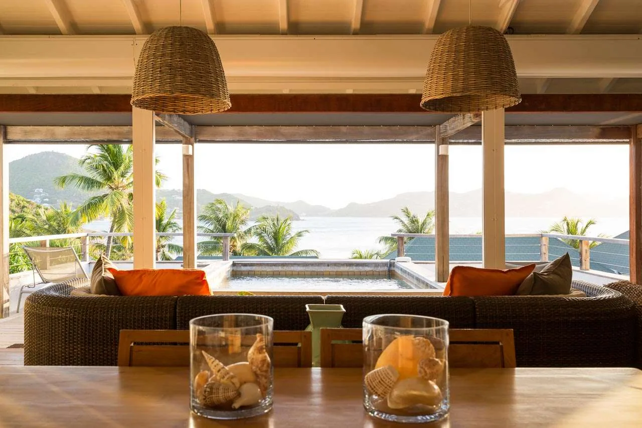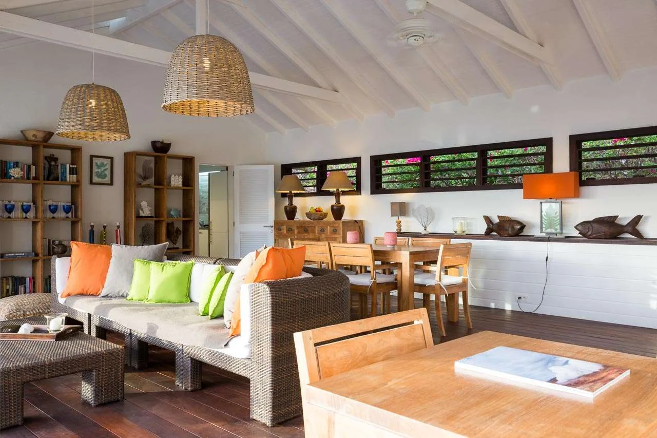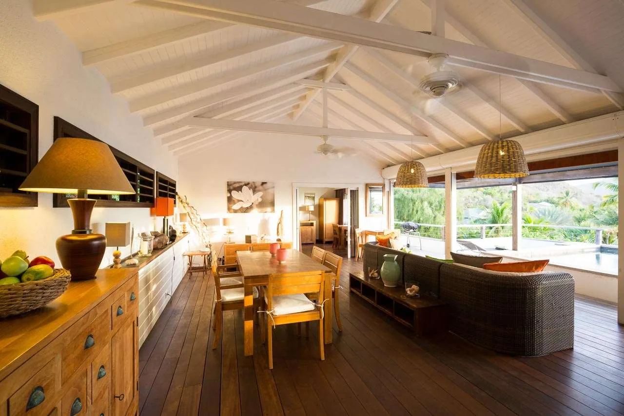 The living room features a large, soft sofa, overlooking the pool outside. It’s an ideal setting for a morning coffee, a slow day delving into a good book, or an evening cocktail. You could also spend your time simply admiring the undulating hills and coastline of St. Barts.