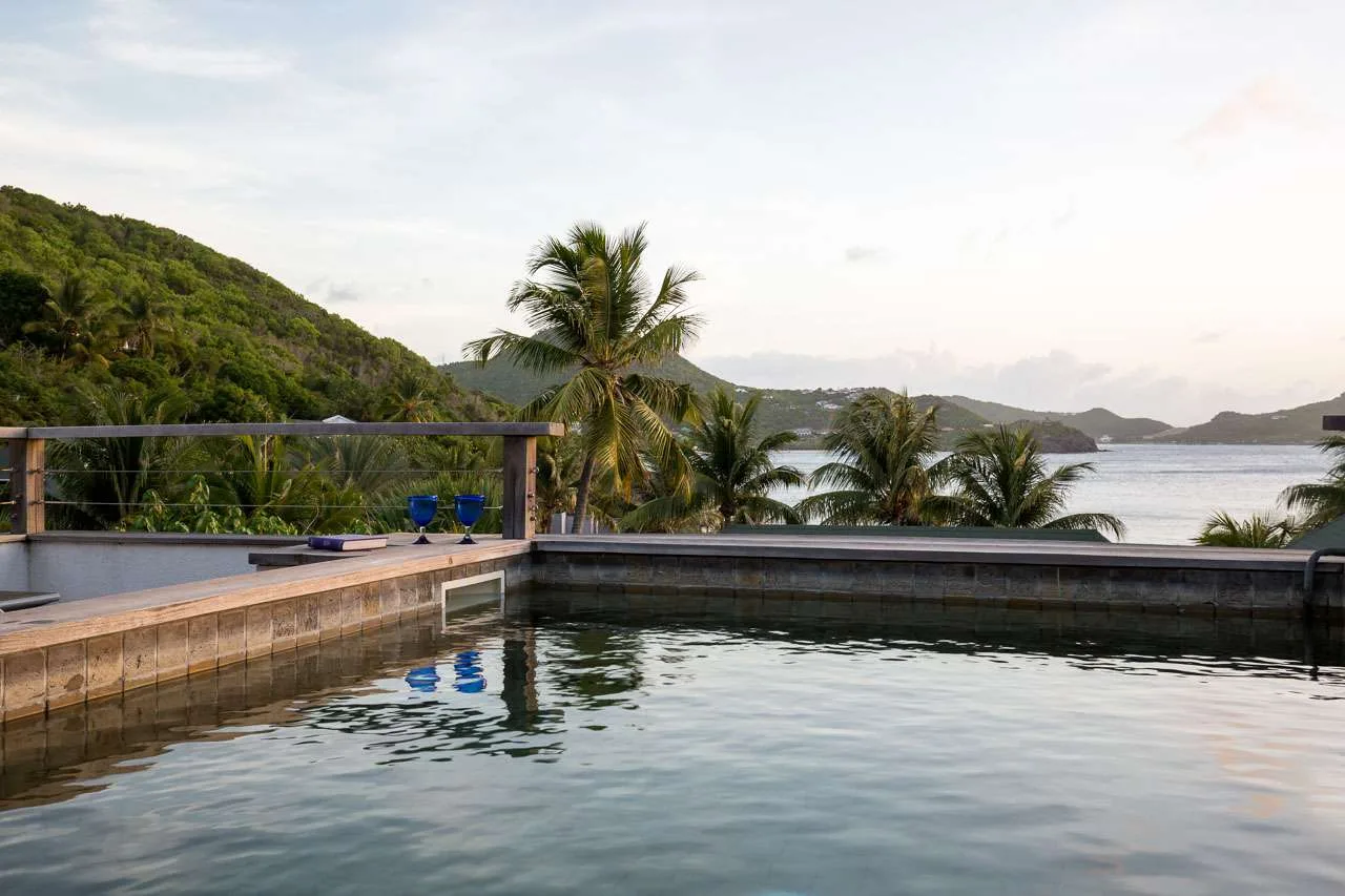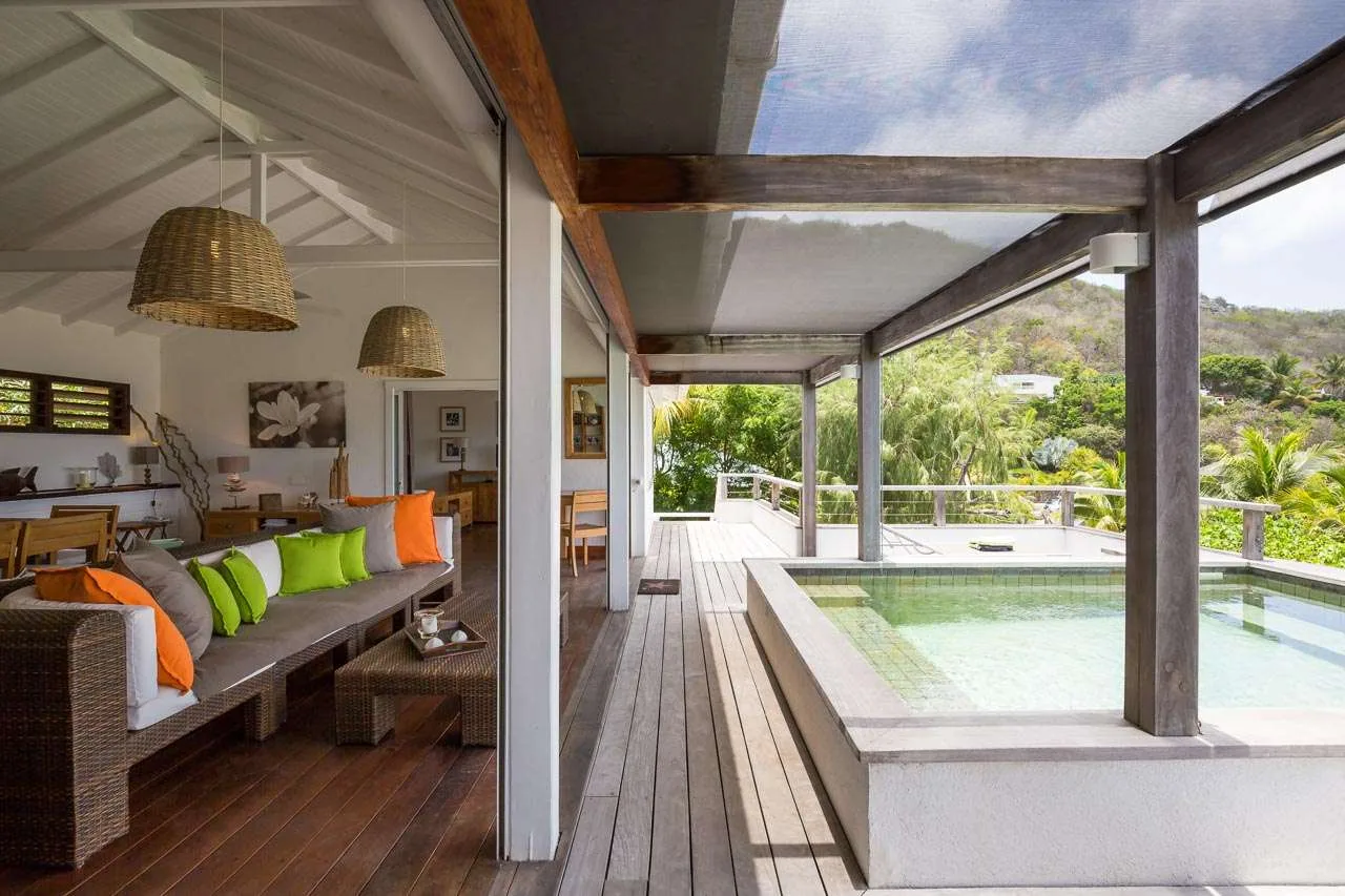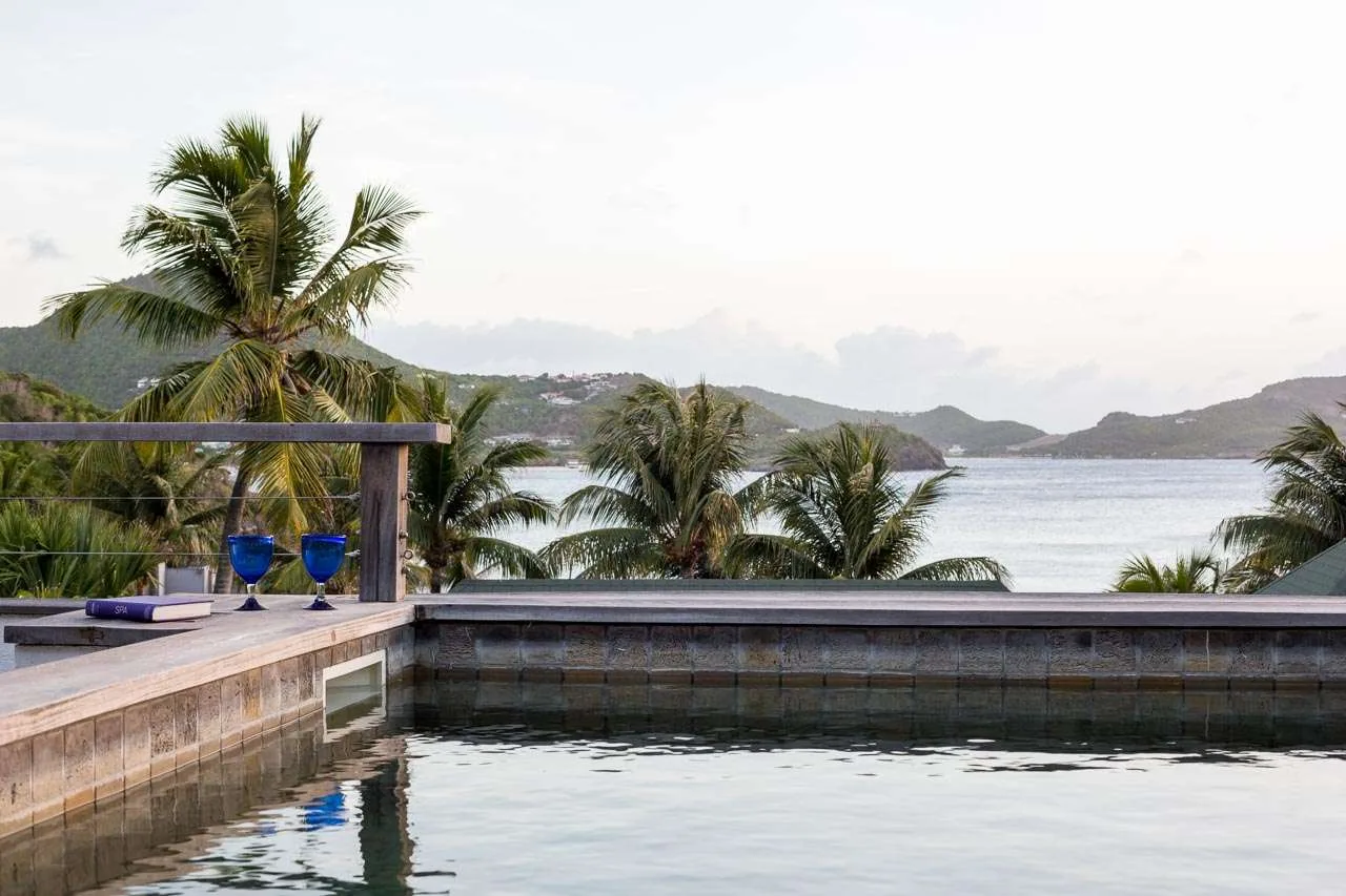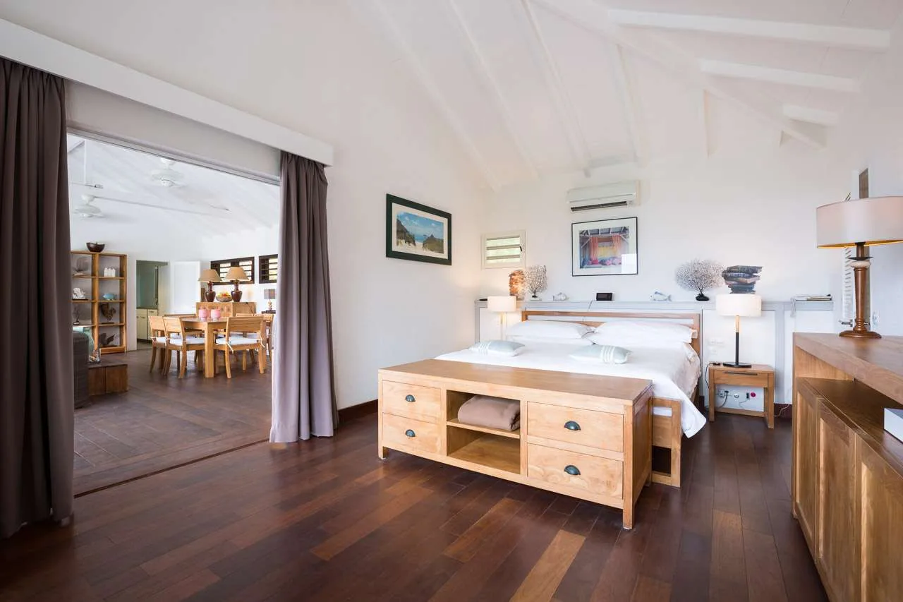 The living room features a large, soft sofa, overlooking the pool outside. It’s an ideal setting for a morning coffee, a slow day delving into a good book, or an evening cocktail. You could also spend your time simply admiring the undulating hills and coastline of St. Barts.