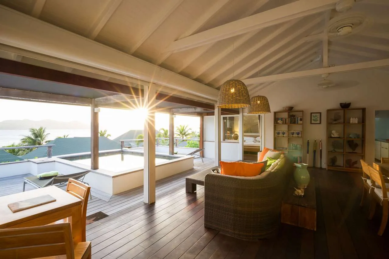 The main living space features a beautiful and thoughtful design, home to the living room and dining table. Island antiques, colorful pictures, and vibrant accents all combine to create a peaceful, beachy atmosphere. The entire space opens to the outdoor terrace, letting you enjoy spectacular island sunsets.