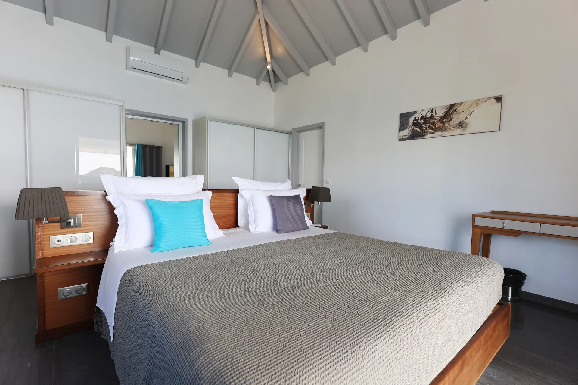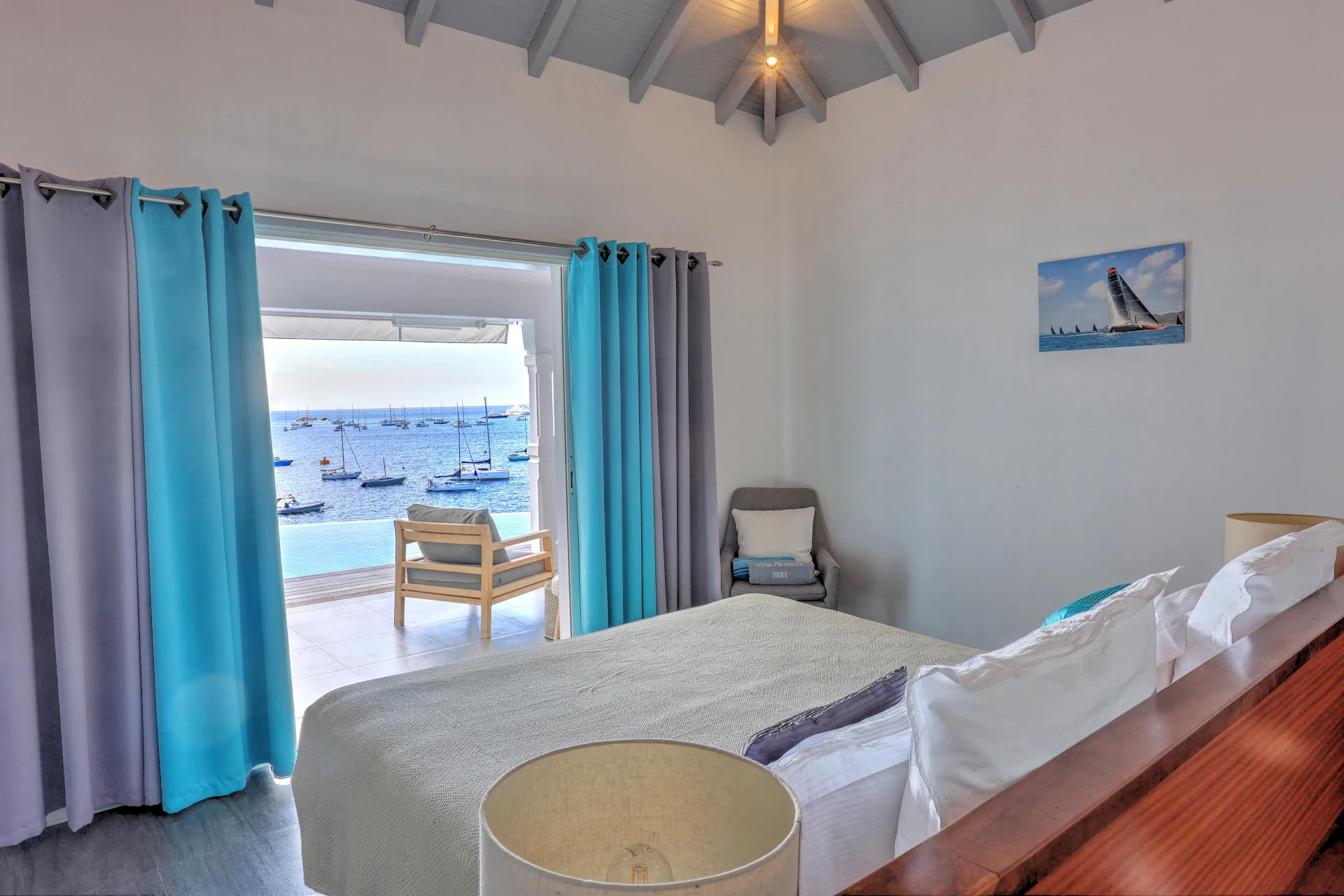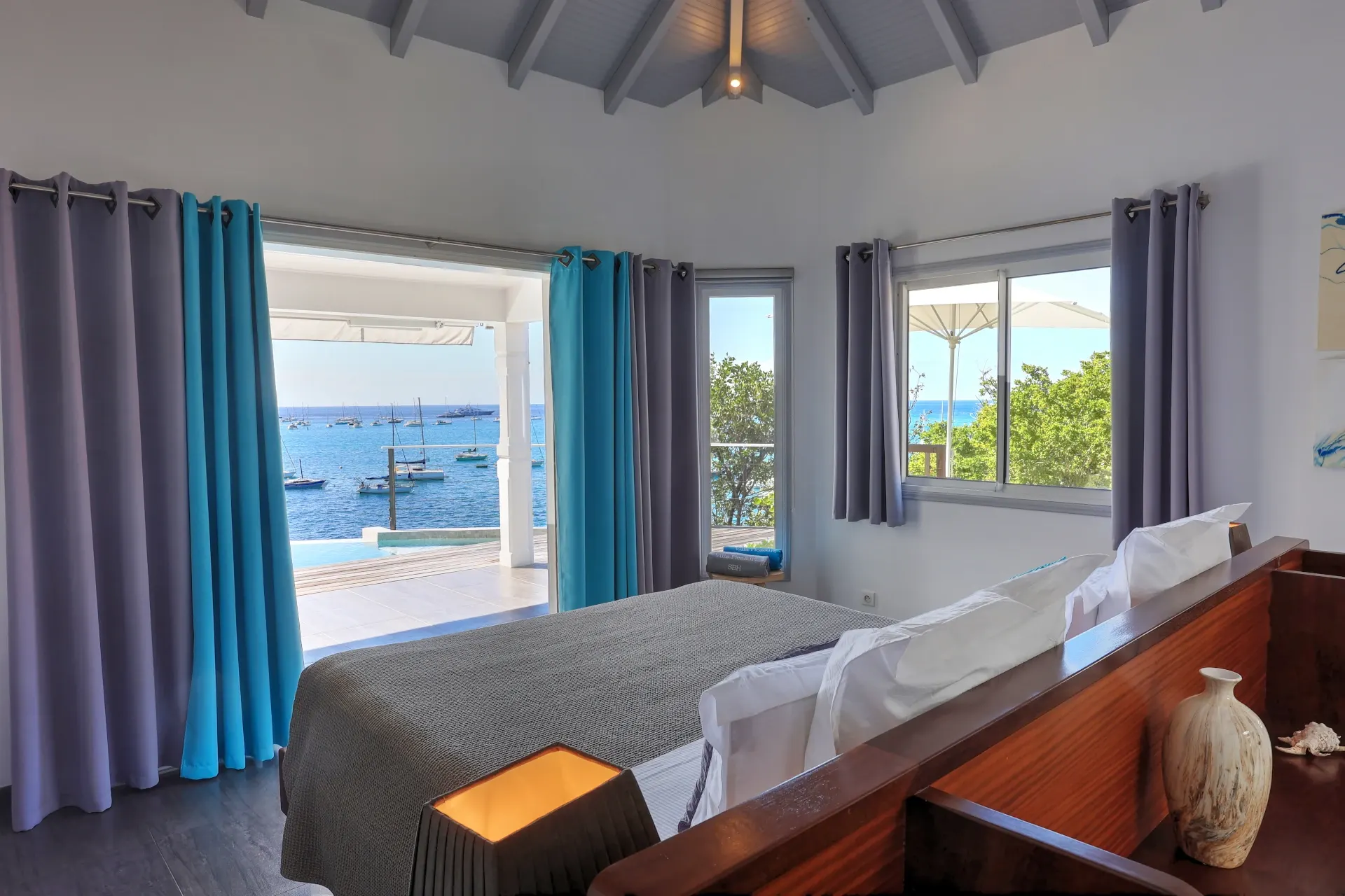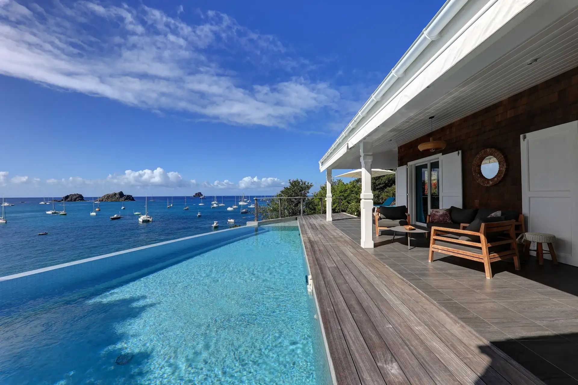 True to its name, Villa Pleasure (villa code: WV URE) offers a perfect blend of comfort and breathtaking landscapes. Overlooking the commercial port of Gustavia and the endless blue Caribbean Sea, this charming villa is inspired by traditional St. Barts cases, with wooden shingle façades and white shutters that invite you to slow down and savor every moment. From sunrise to sunset, the scenery constantly evolves, with yachts gliding into the harbor, planes approaching the iconic runway, and evenings crowned by spectacular sunsets.