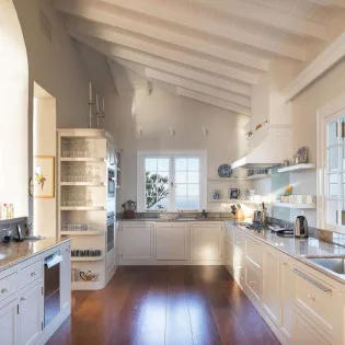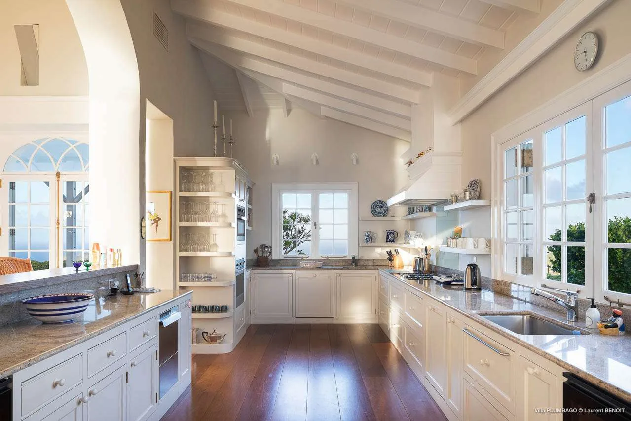 The kitchen at Villa Plumbago is a social space, designed for your group to spend time together while preparing a meal. The high-end appliances make cooking easy, while the breakfast bar with stools encourages breezy aperitifs while the food is being prepared.