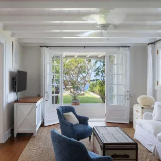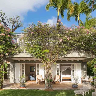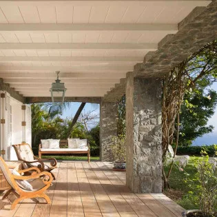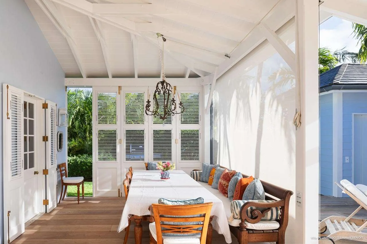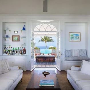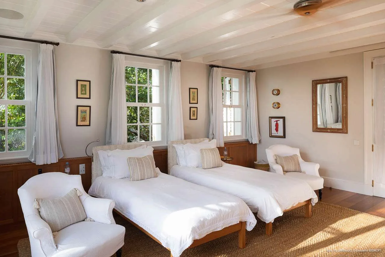 The main house keeps the wind away from the rear terrace, a sheltered spot to relax during the day. Yet another terrace overlooks Flamands Bay, providing incredible sunrise views.