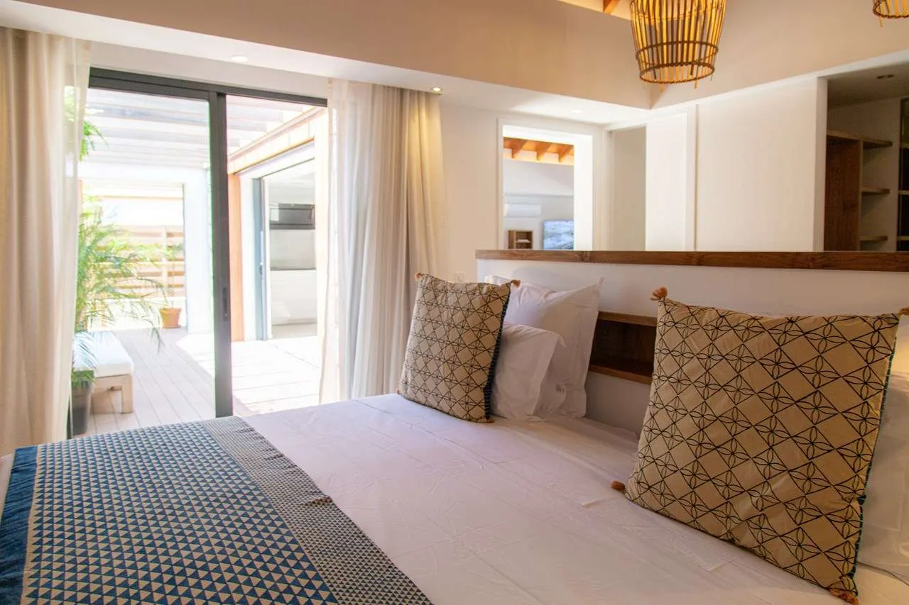 The villa is directly on the beach, but offers decent privacy thanks to its higher position, and the “private beach” with a daybed in between the terrace and the natural beach. With a plush daybed here and some loungers, it’s a great place to spend some time lounging by the Caribbean.