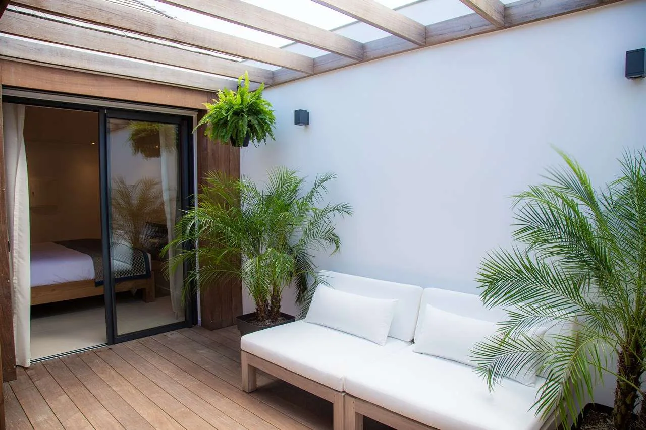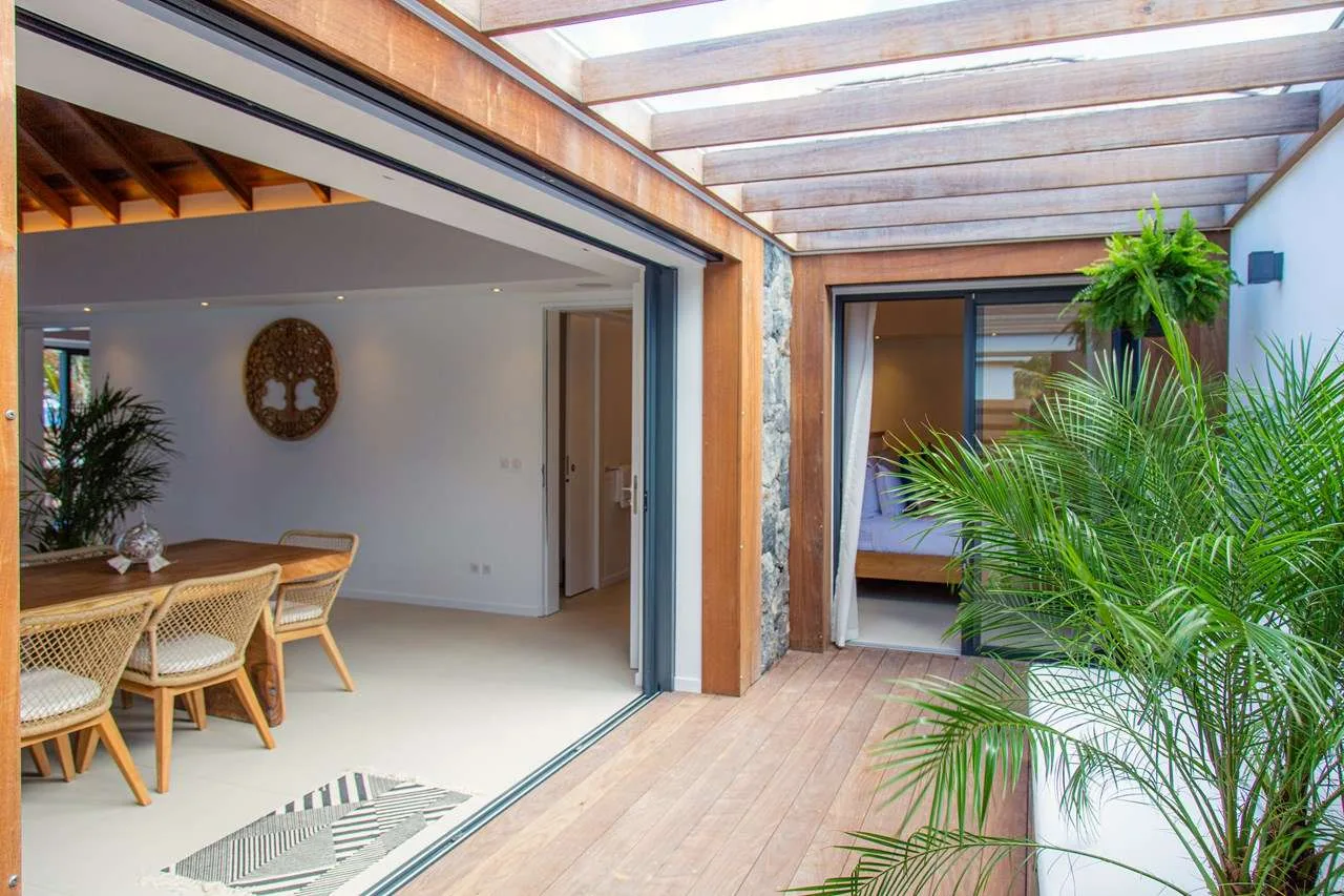 The shared living spaces inside Villa Prana are airy and bright. There’s a beautiful, vaulted ceiling in the main room, with the natural wood bringing an island warmth to the whole home. On both sides, doors slide open to the outdoor spaces; the terrace on one side and the inner courtyard on the other.