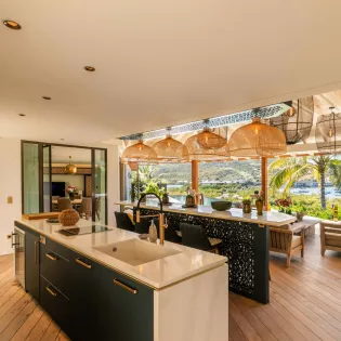 The outdoor living space, perfectly ventilated by the trade winds, opens onto a beautiful garden and a 16m infinity pool, inviting you to relax and enjoy conviviality. You can choose a moment of sharing leaning on the central island of its kitchen or comfortably installed on the sofa.