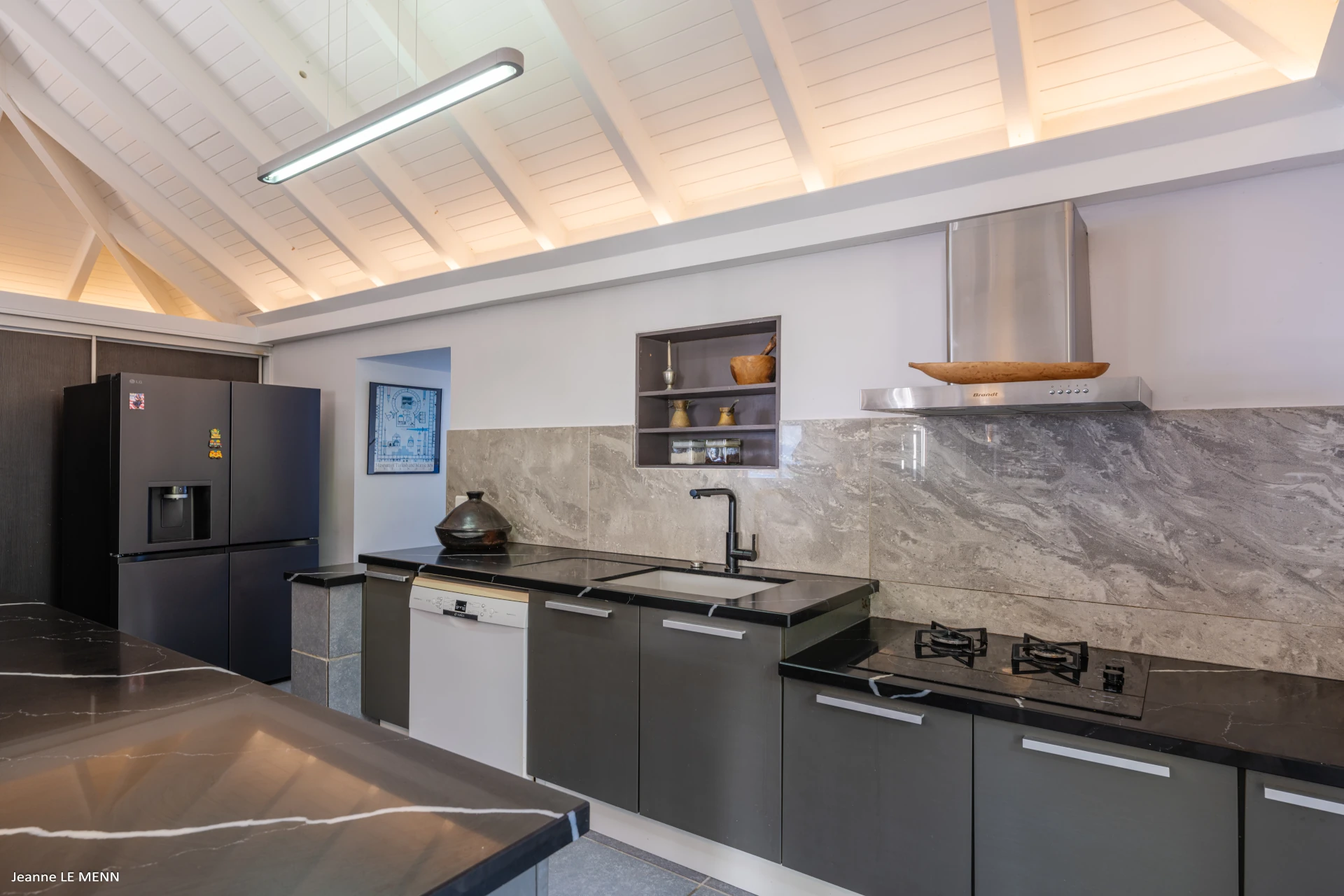 Villa Regatta’s living room also opens to the kitchen, where you’ll easily be able to whip up gourmet meals during your stay. High-end appliances and contemporary gray cabinetry make it a real pleasure to cook here. Our concierge is also happy to organize a grocery delivery, or for a special occasion, a private chef.