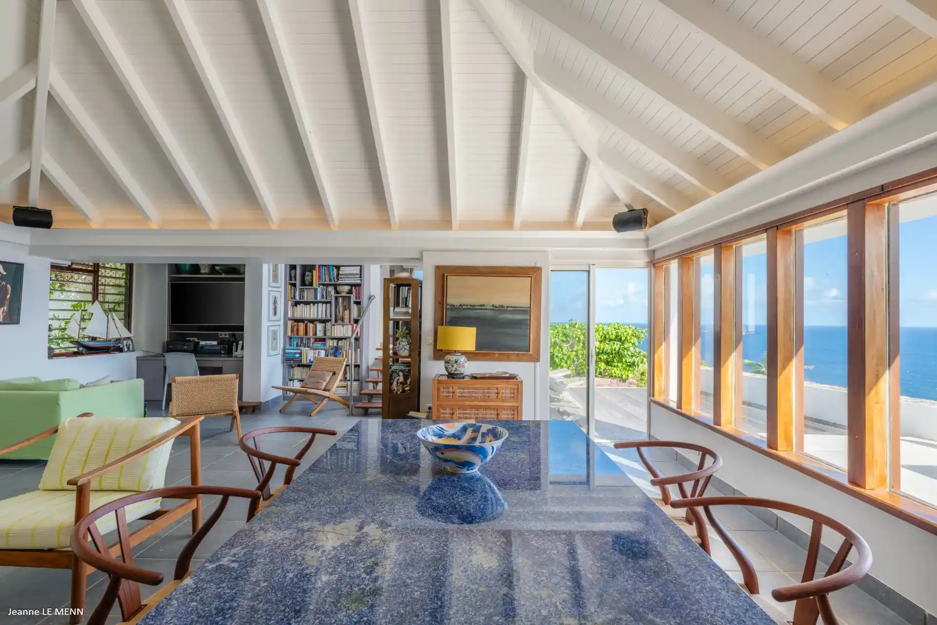 Inside at the heart of Villa Regatta is the spacious living room, with comfortable seating that’s ideal for relaxing. This will be the main gathering point of your stay, with shelves filled with interesting books, island artworks adorning the walls, and large windows that overlook the ocean. A large TV sits discreetly in a corner for entertainment.