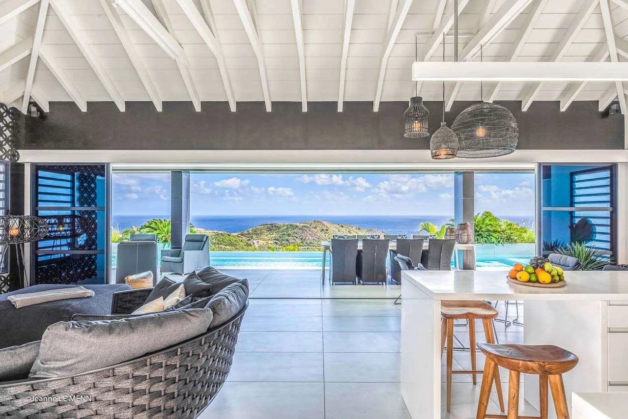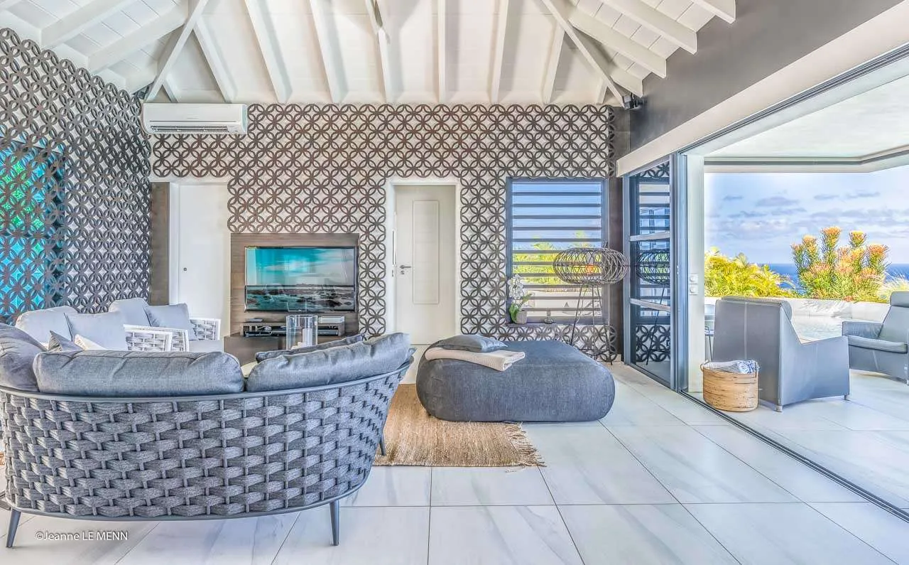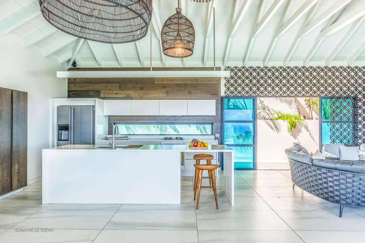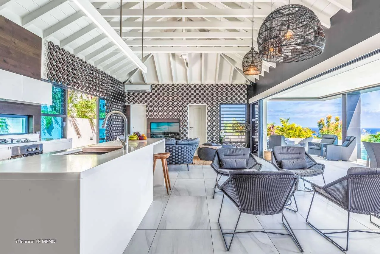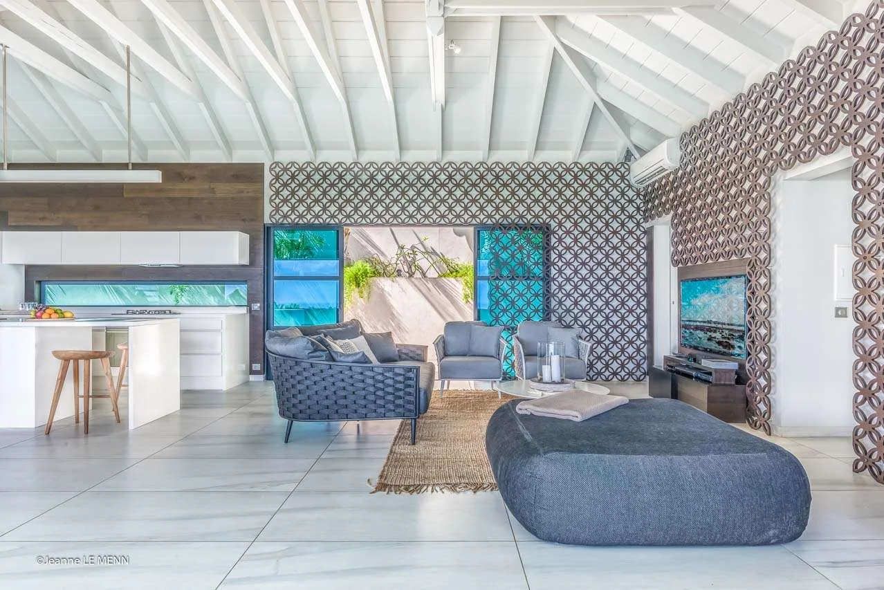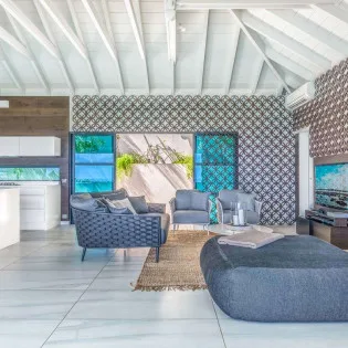 The interiors feature a contemporary mix of soothing gays, whites, and granite-black, exuding class and luxury. Geometric patterns in the décor and sleek light fixtures add a stylish and elegant island touch to the home, creating a home that enjoys the enviable St. Barts mix of playful luxury and rugged tropical beauty.