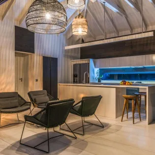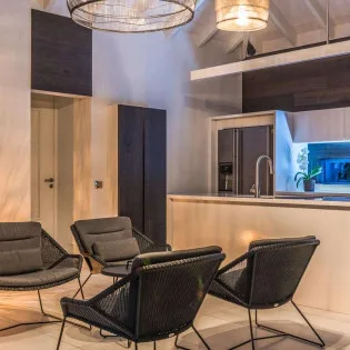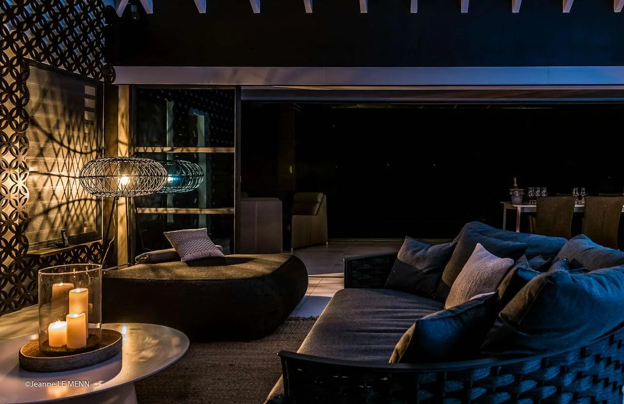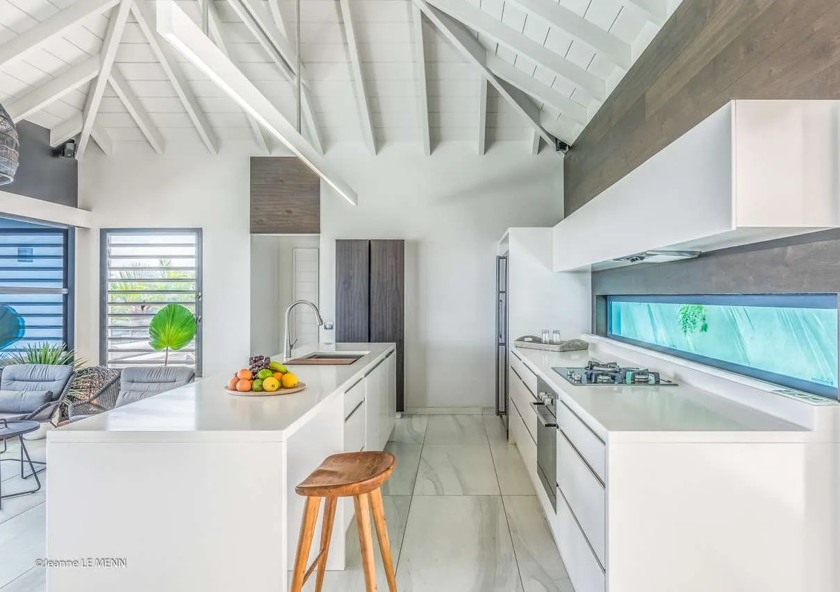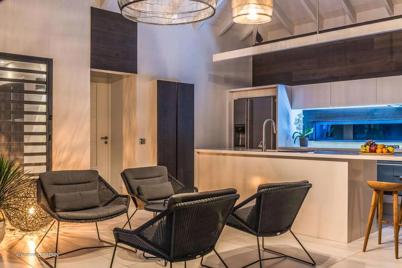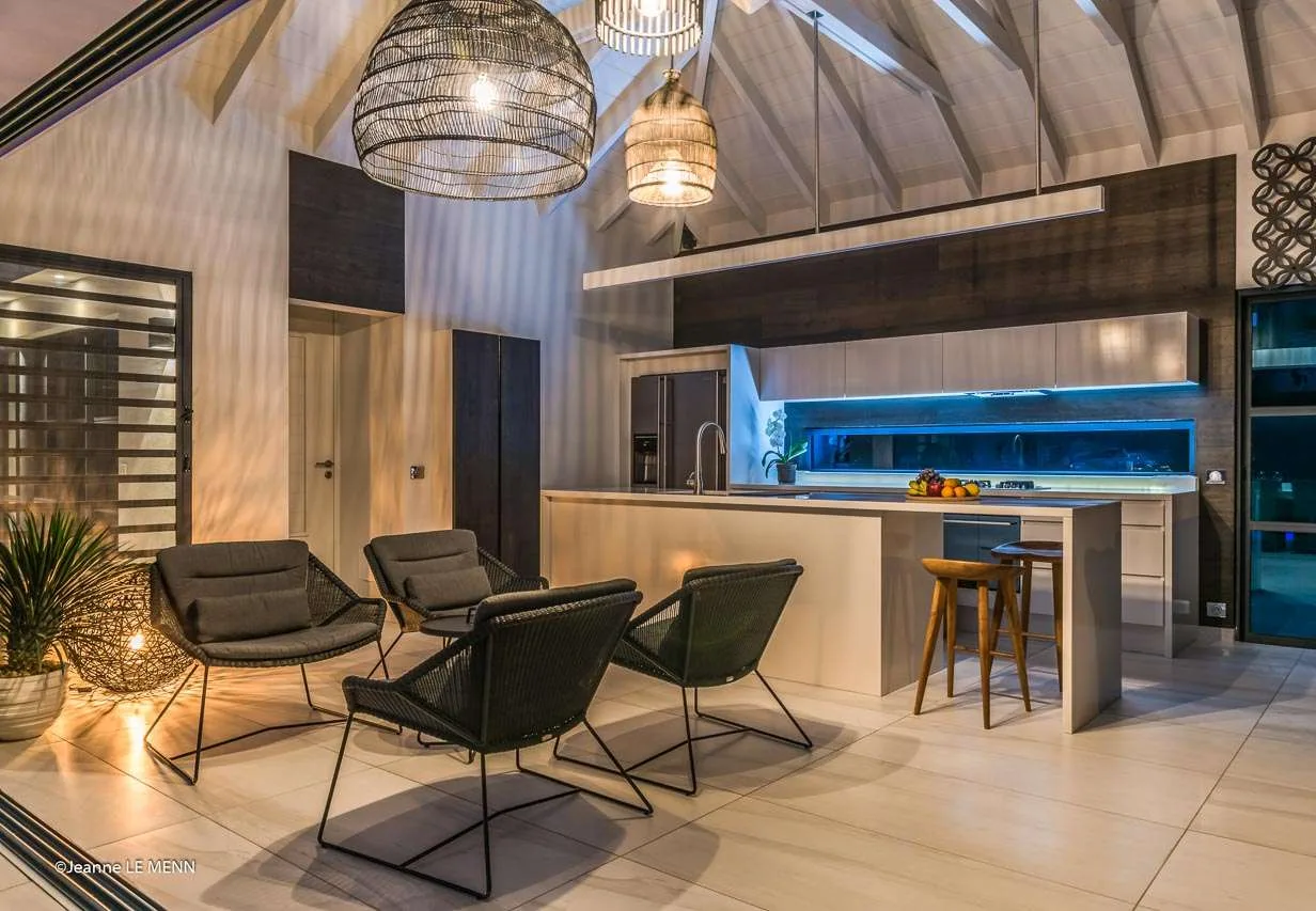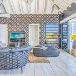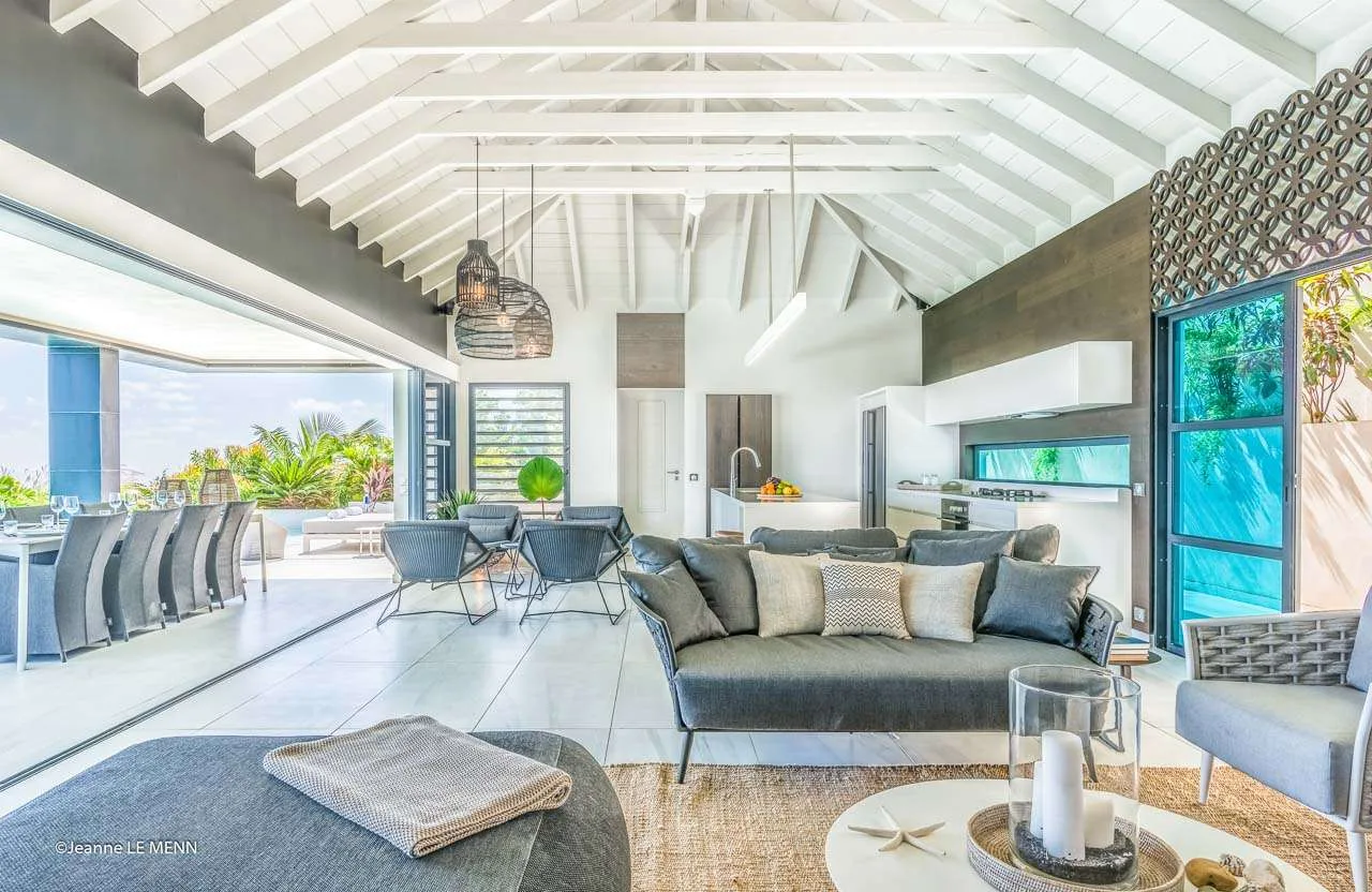 The interiors feature a contemporary mix of soothing gays, whites, and granite-black, exuding class and luxury. Geometric patterns in the décor and sleek light fixtures add a stylish and elegant island touch to the home, creating a home that enjoys the enviable St. Barts mix of playful luxury and rugged tropical beauty.