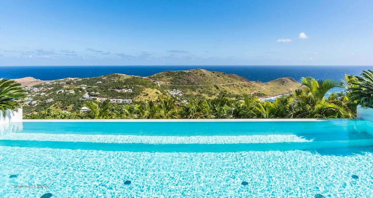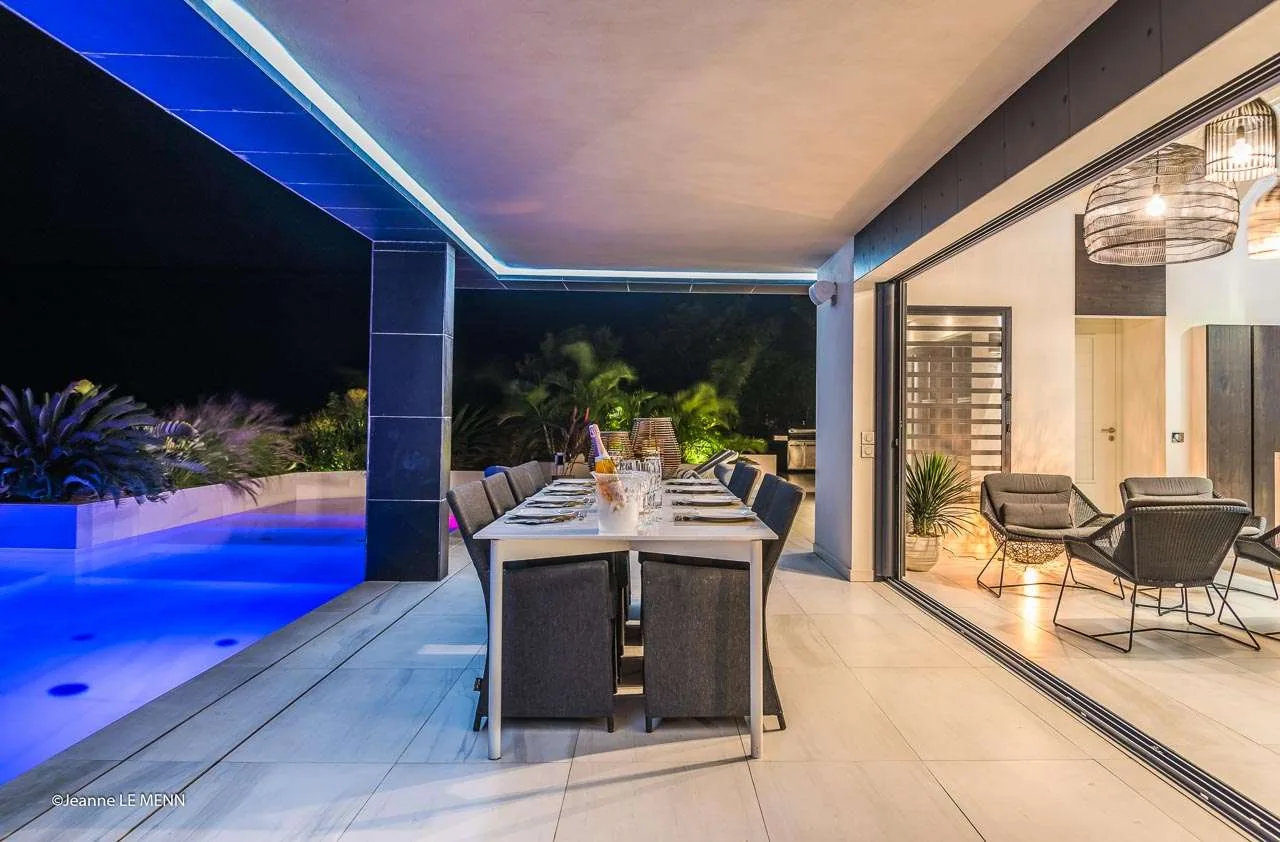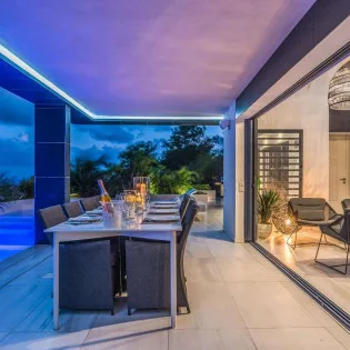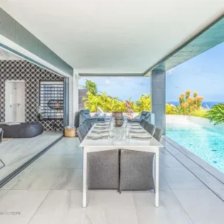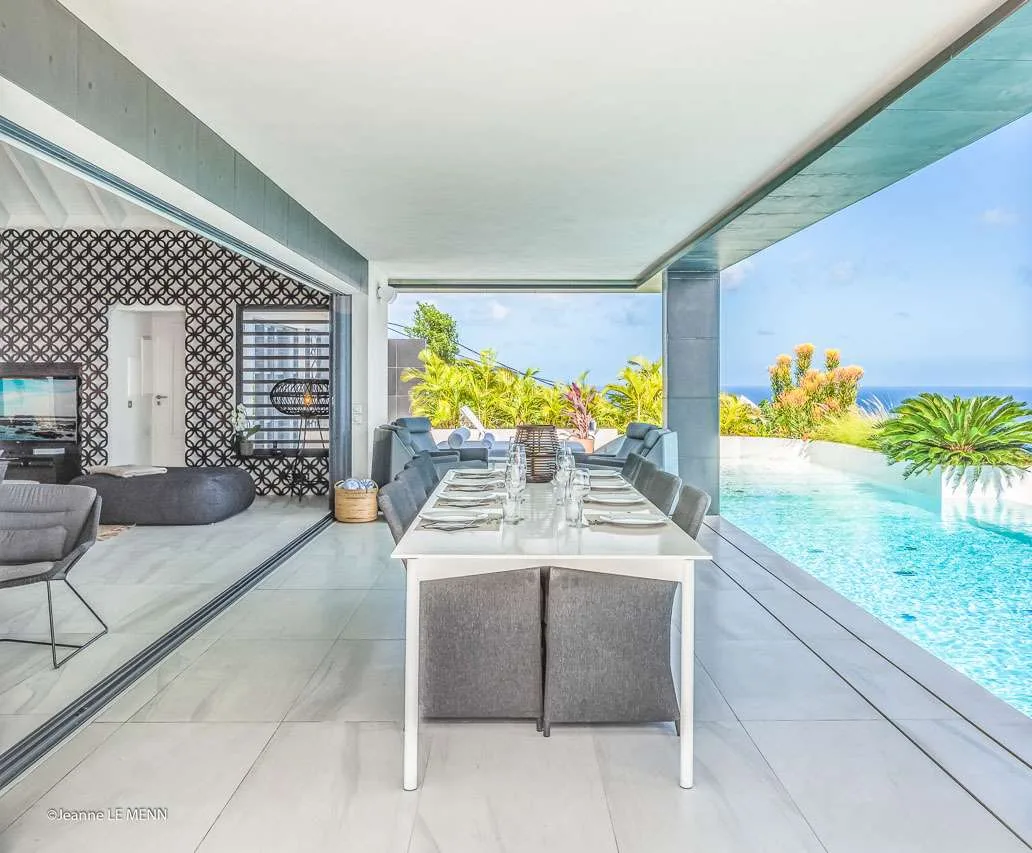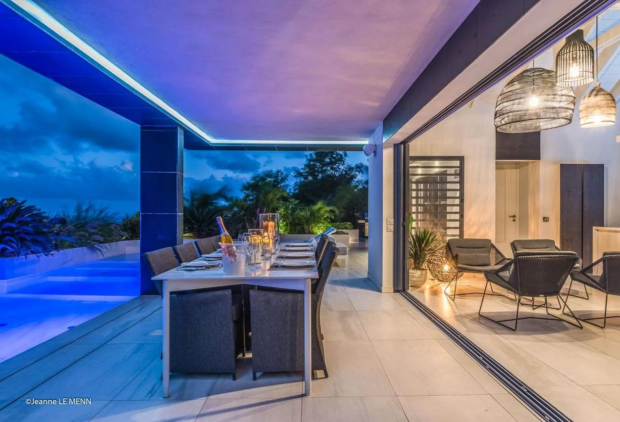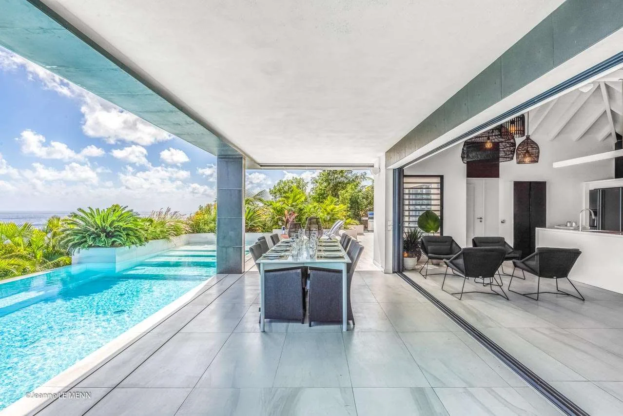 A dining table sits on the covered terrace, overlooking the pool and view beyond. From here, you’ll be able to pair a meal with the remarkable vistas, from Petit Cul de Sac all the way to Toiny Beach. It’s a captivating setting in which to enjoy some great food and wine.