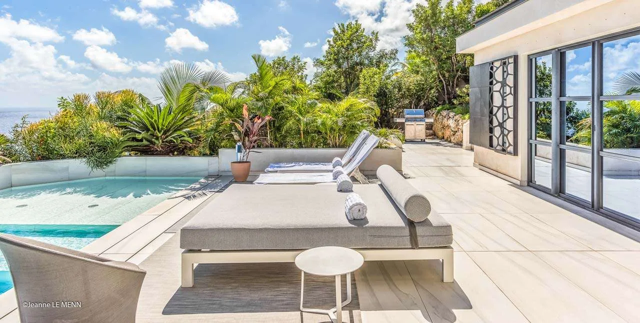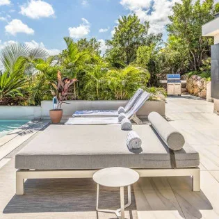 On either side of the covered terrace area are large, plush daybeds, comfortable spots to sink in with a good book or a cool drink while sunbathing. Languidly relaxing here all day is very tempting, yet the natural rugged beauty of St. Barts also coaxes you outside the villa. Within a short drive, you can reach Lorient Beach, a picturesque and pristine sweep of sand.