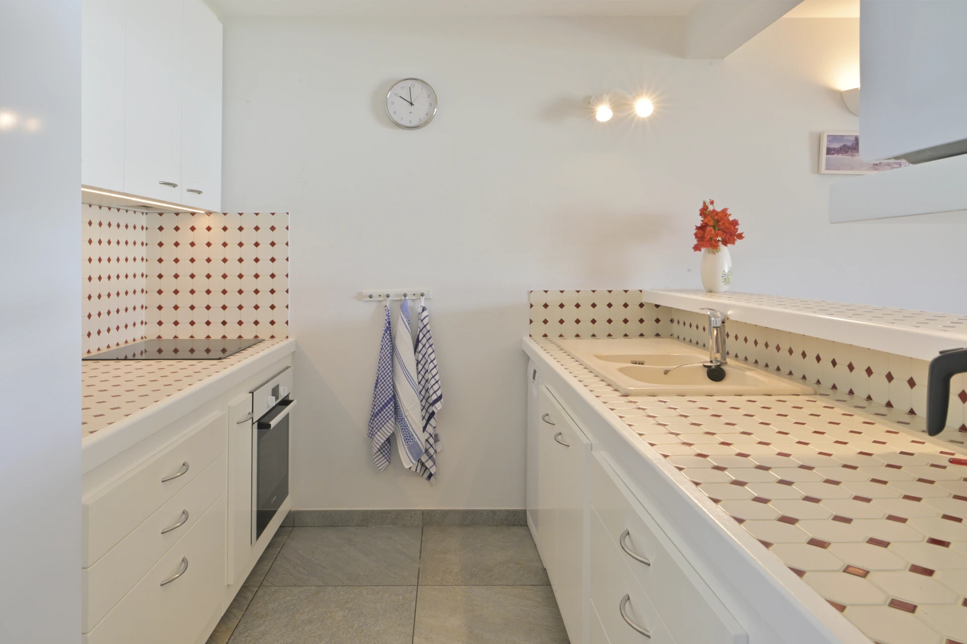 A well-equipped kitchen is adjacent to the living area with U.S. satellite TV and a dining area that opens to a covered terrace where alfresco meals can be enjoyed overlooking the Bay.