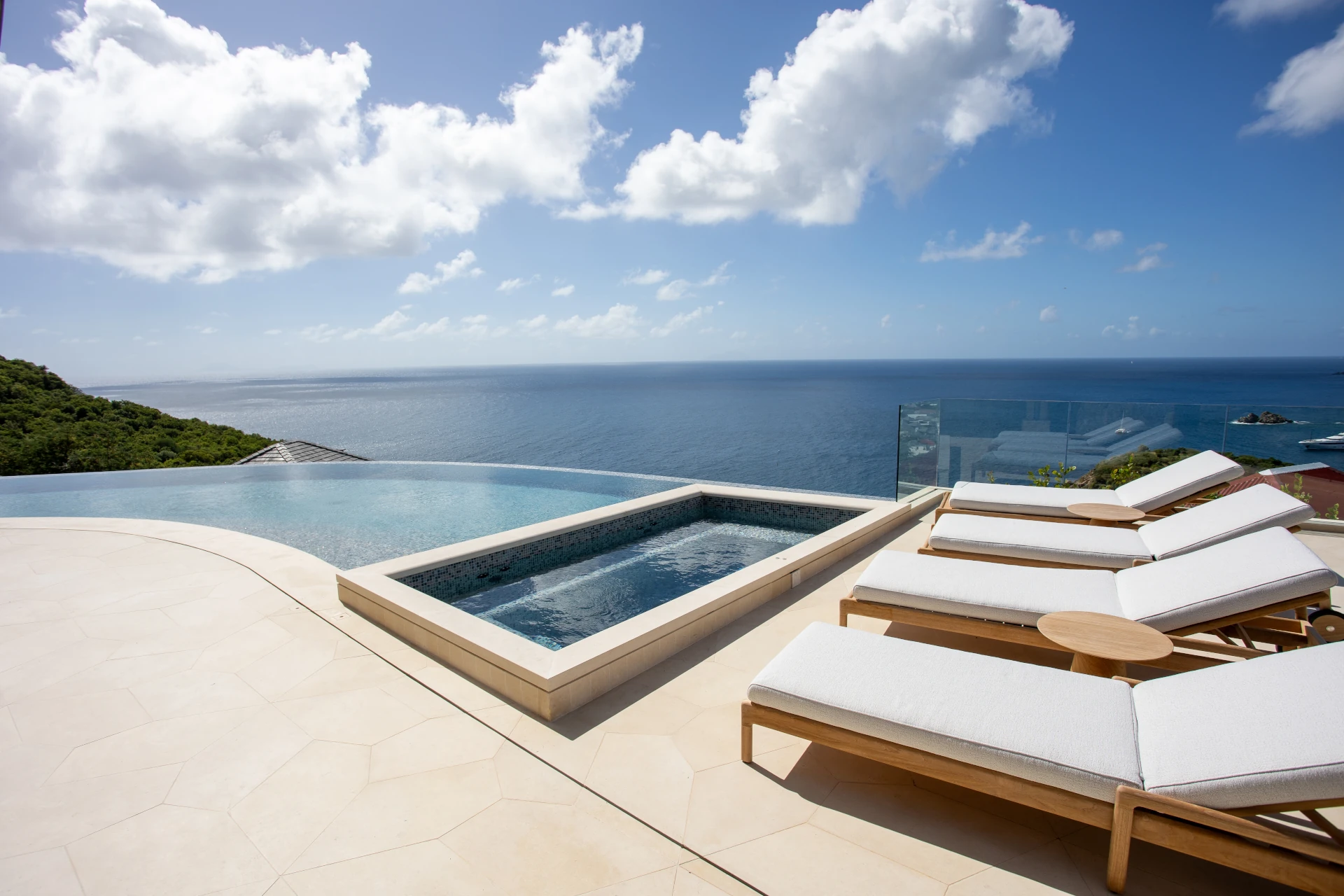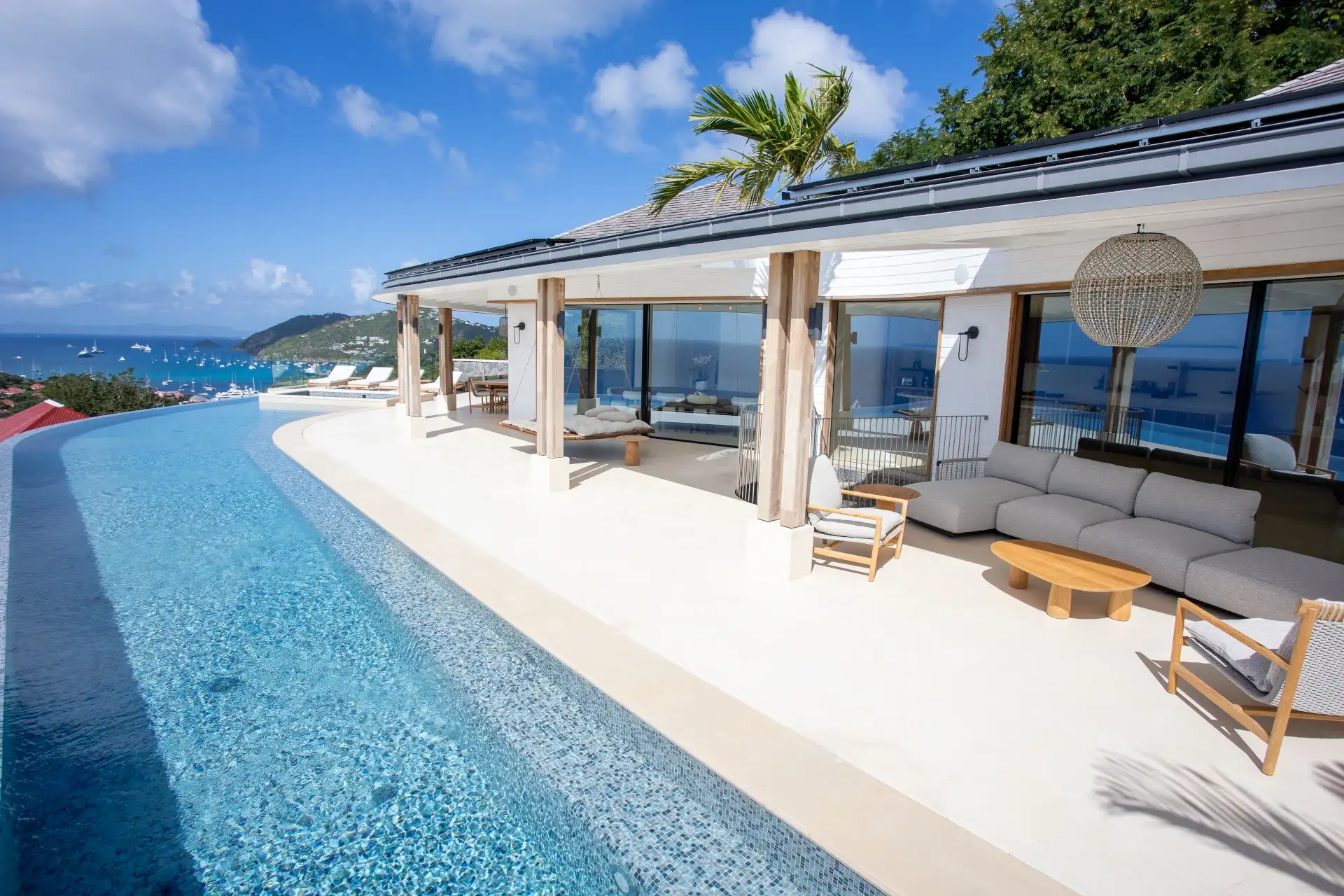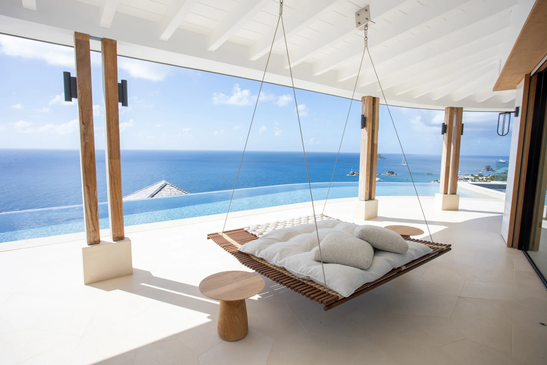 Outdoors, the setting is simply breathtaking. The infinity pool extends toward the horizon, complemented by a sun deck and a hot tub overlooking the sea and Gustavia—an idyllic vantage point for unforgettable sunsets. A suspended daybed on the terrace sways gently in the trade winds, inviting moments of quiet contemplation against a backdrop of panoramic ocean views.