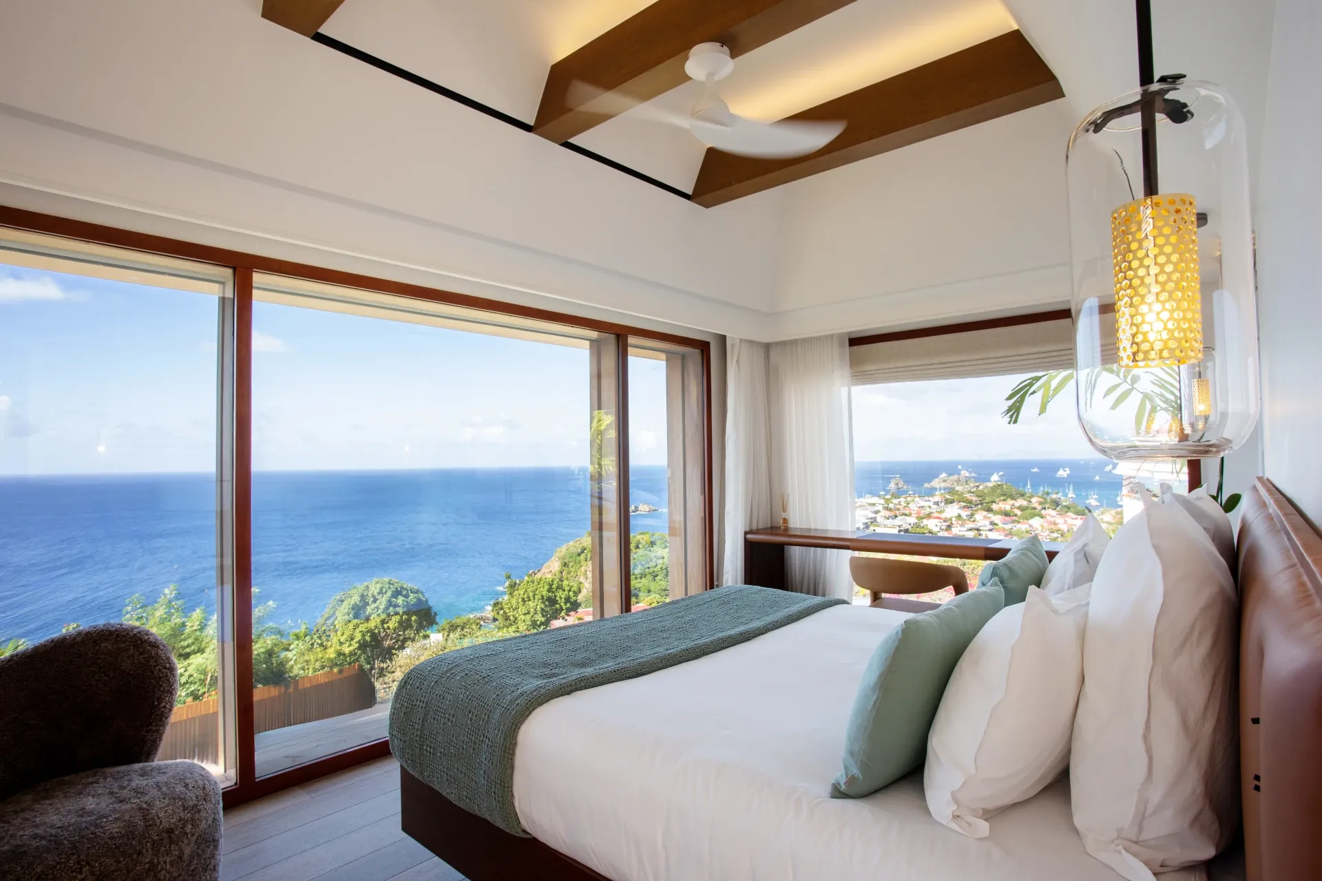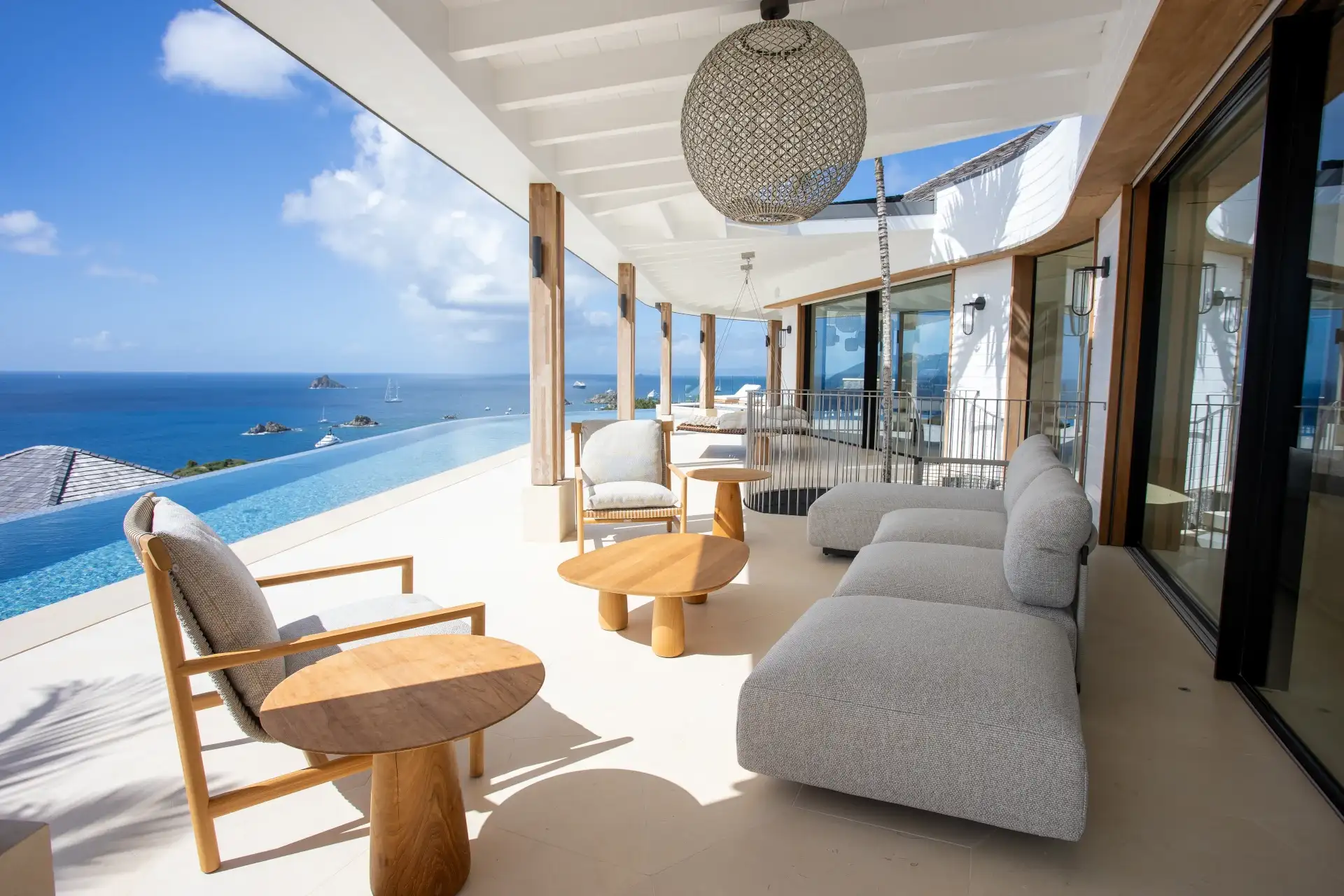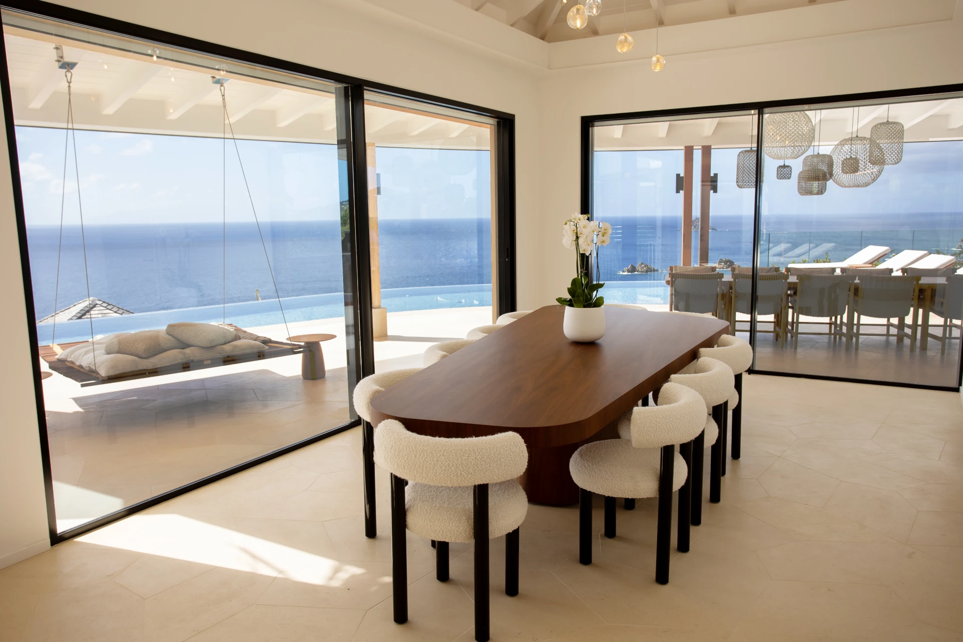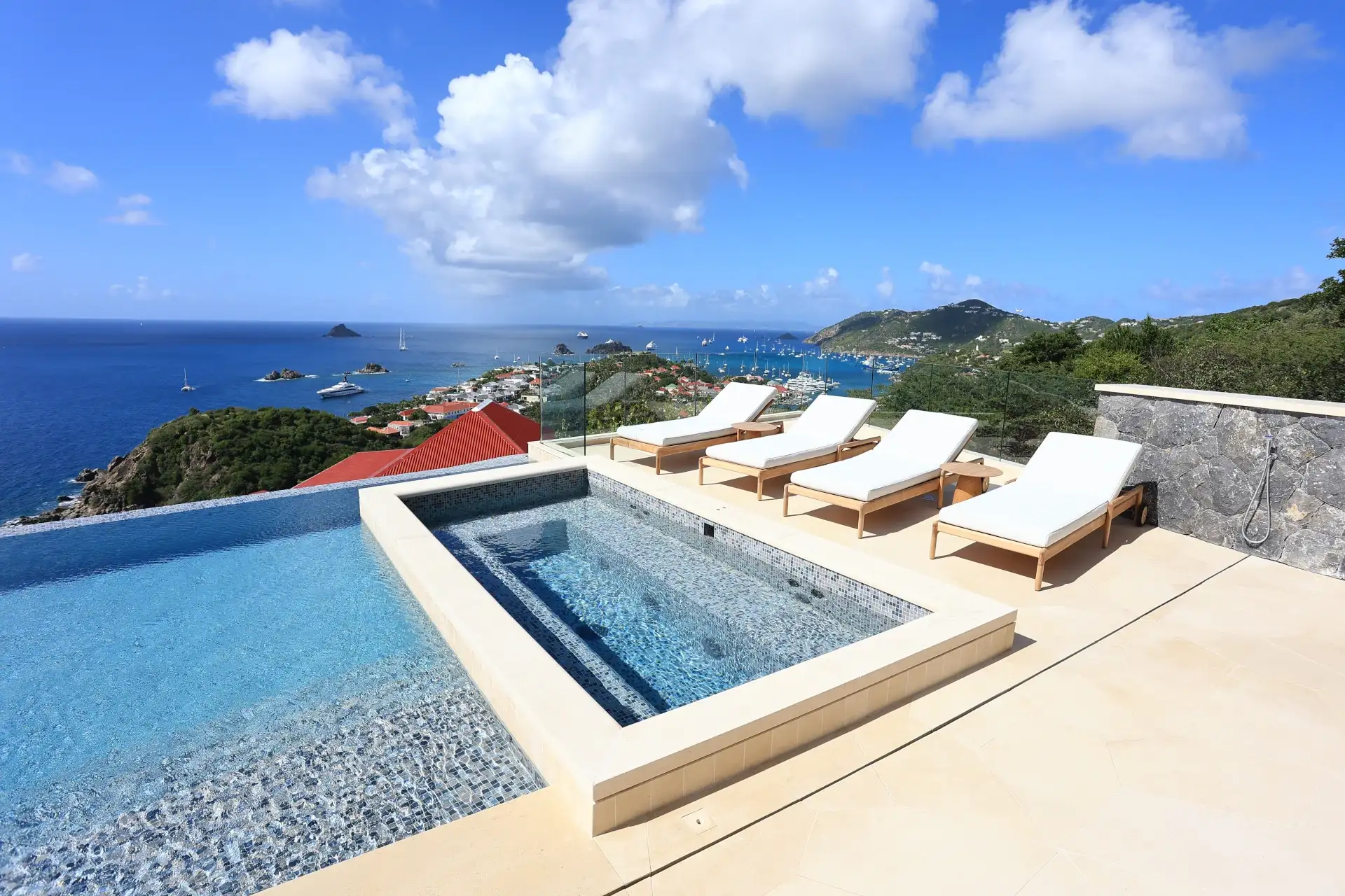 Outdoors, the setting is simply breathtaking. The infinity pool extends toward the horizon, complemented by a sun deck and a hot tub overlooking the sea and Gustavia—an idyllic vantage point for unforgettable sunsets. A suspended daybed on the terrace sways gently in the trade winds, inviting moments of quiet contemplation against a backdrop of panoramic ocean views.