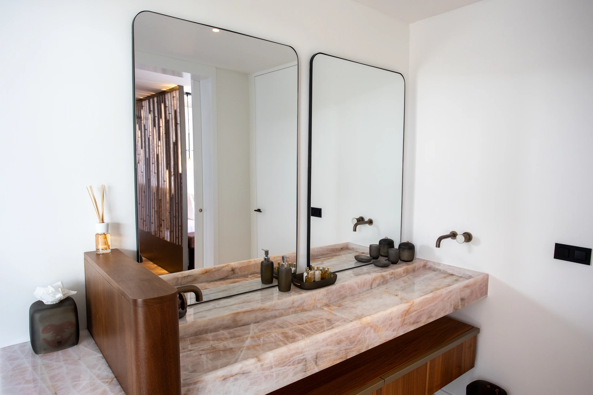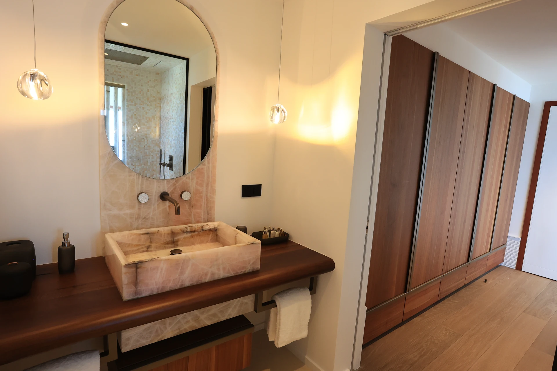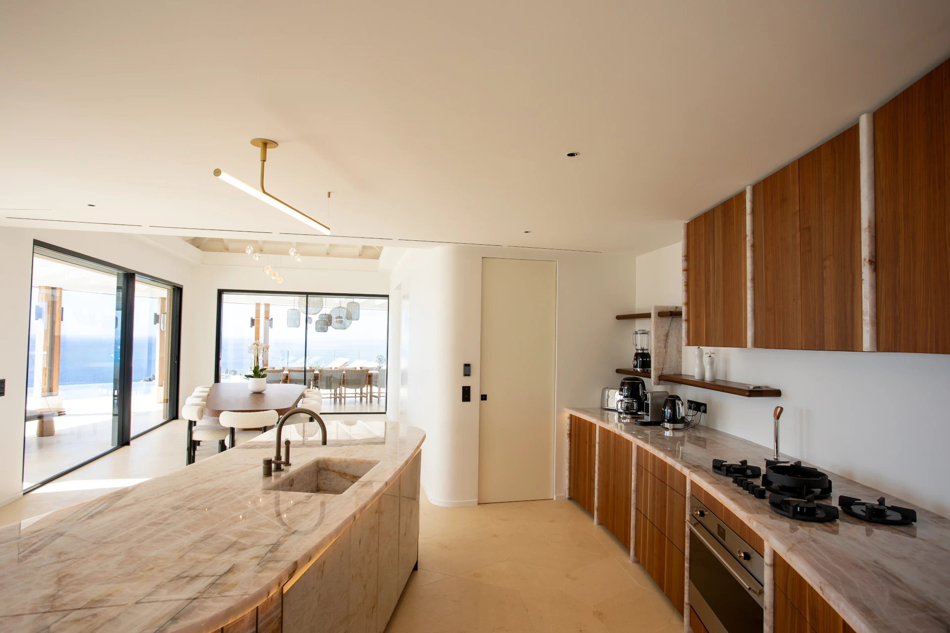 At the heart of Villa Sel lies a spectacular, light-filled living area, where the living room, dining space, and kitchen flow seamlessly beneath an impressive vaulted ceiling. Fully air-conditioned, this open-plan space is designed for both relaxation and convivial moments. The sleek, fully equipped kitchen is anchored by a striking pink onyx central island—a true statement piece that blends modernity, softness, and refined elegance.