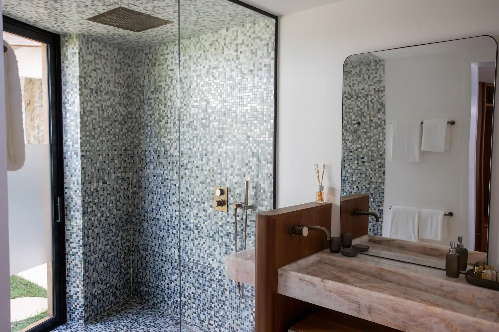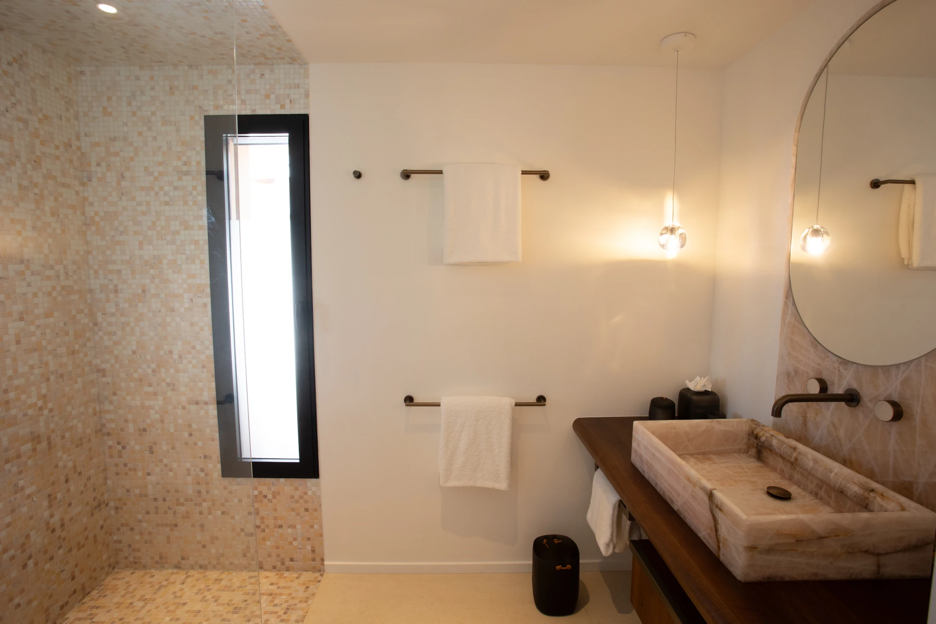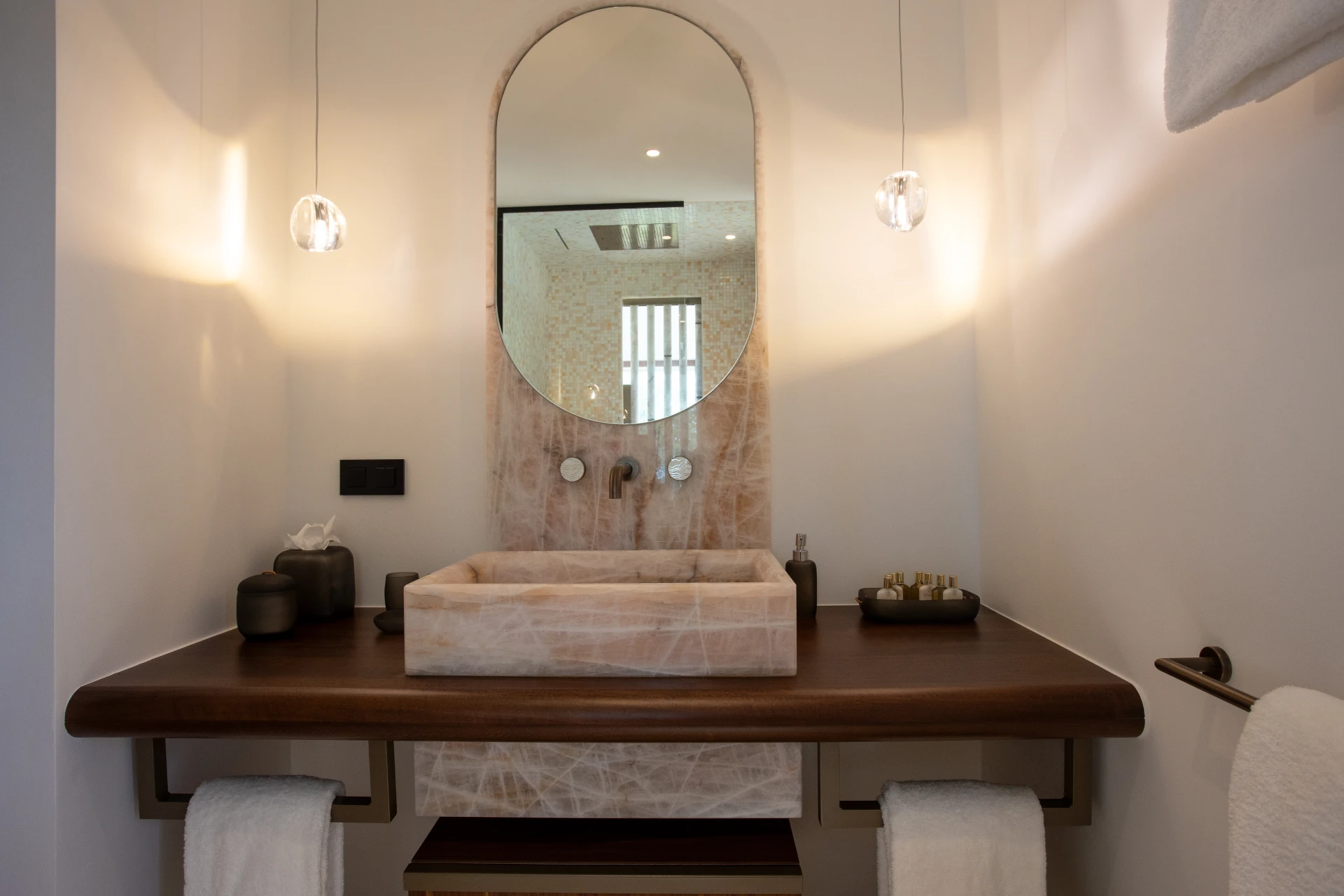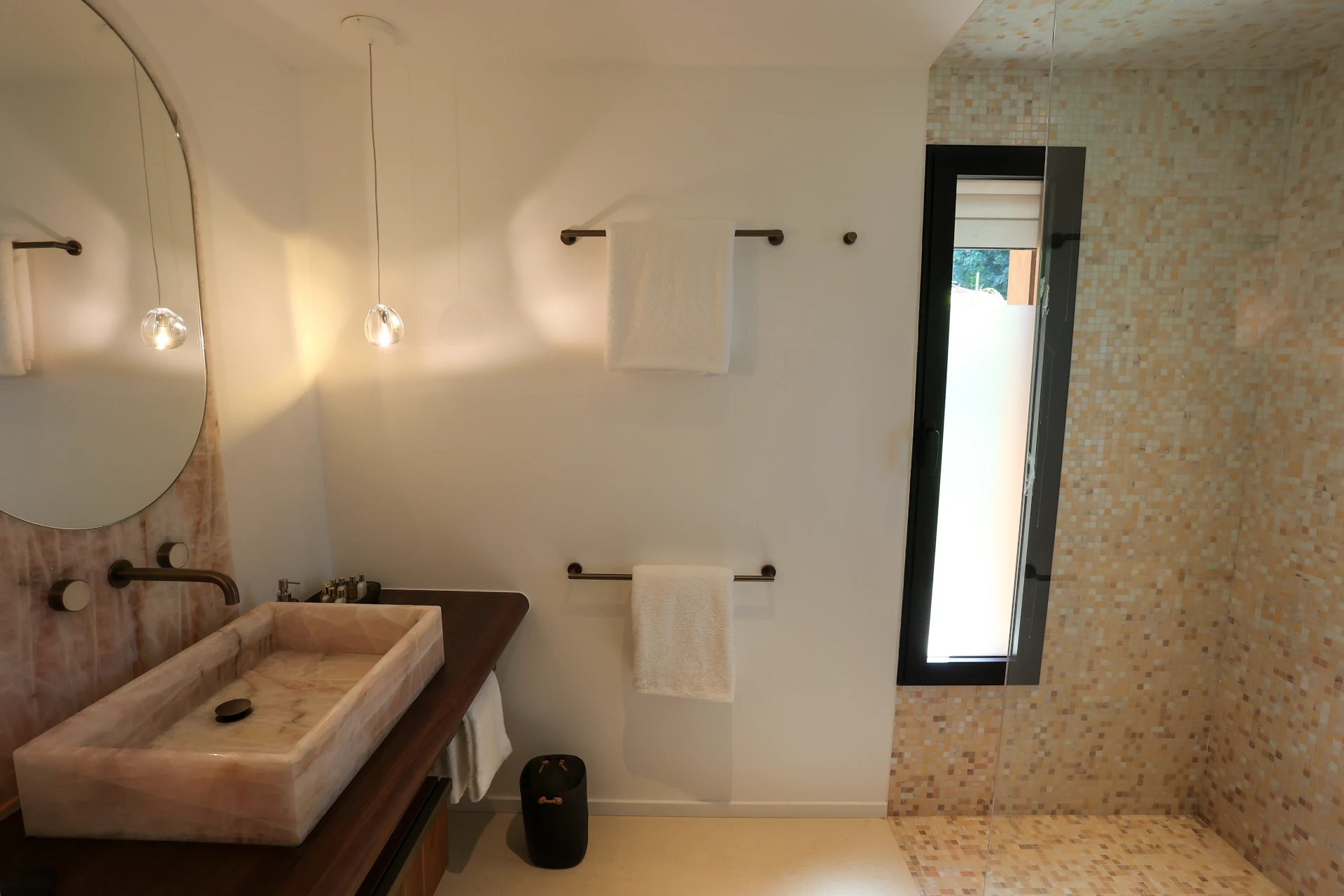 At the heart of Villa Sel lies a spectacular, light-filled living area, where the living room, dining space, and kitchen flow seamlessly beneath an impressive vaulted ceiling. Fully air-conditioned, this open-plan space is designed for both relaxation and convivial moments. The sleek, fully equipped kitchen is anchored by a striking pink onyx central island—a true statement piece that blends modernity, softness, and refined elegance.