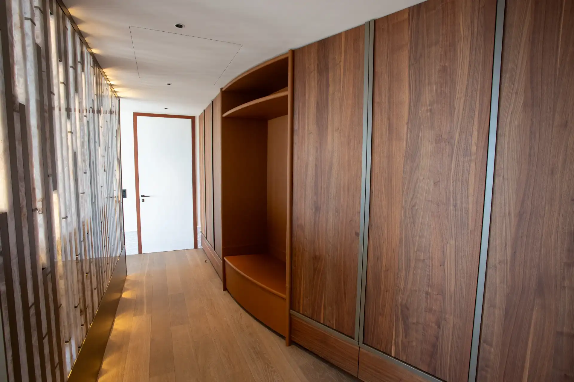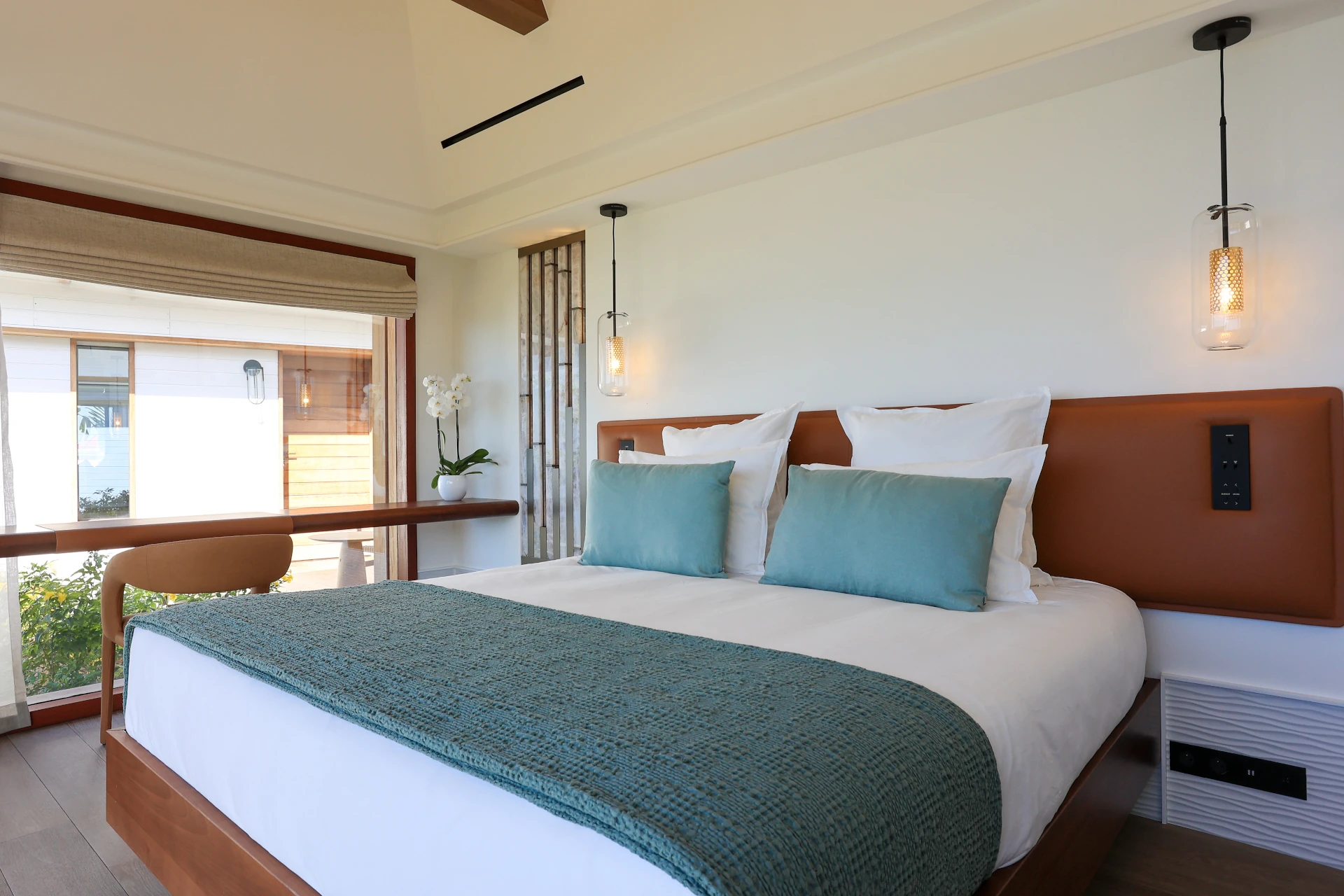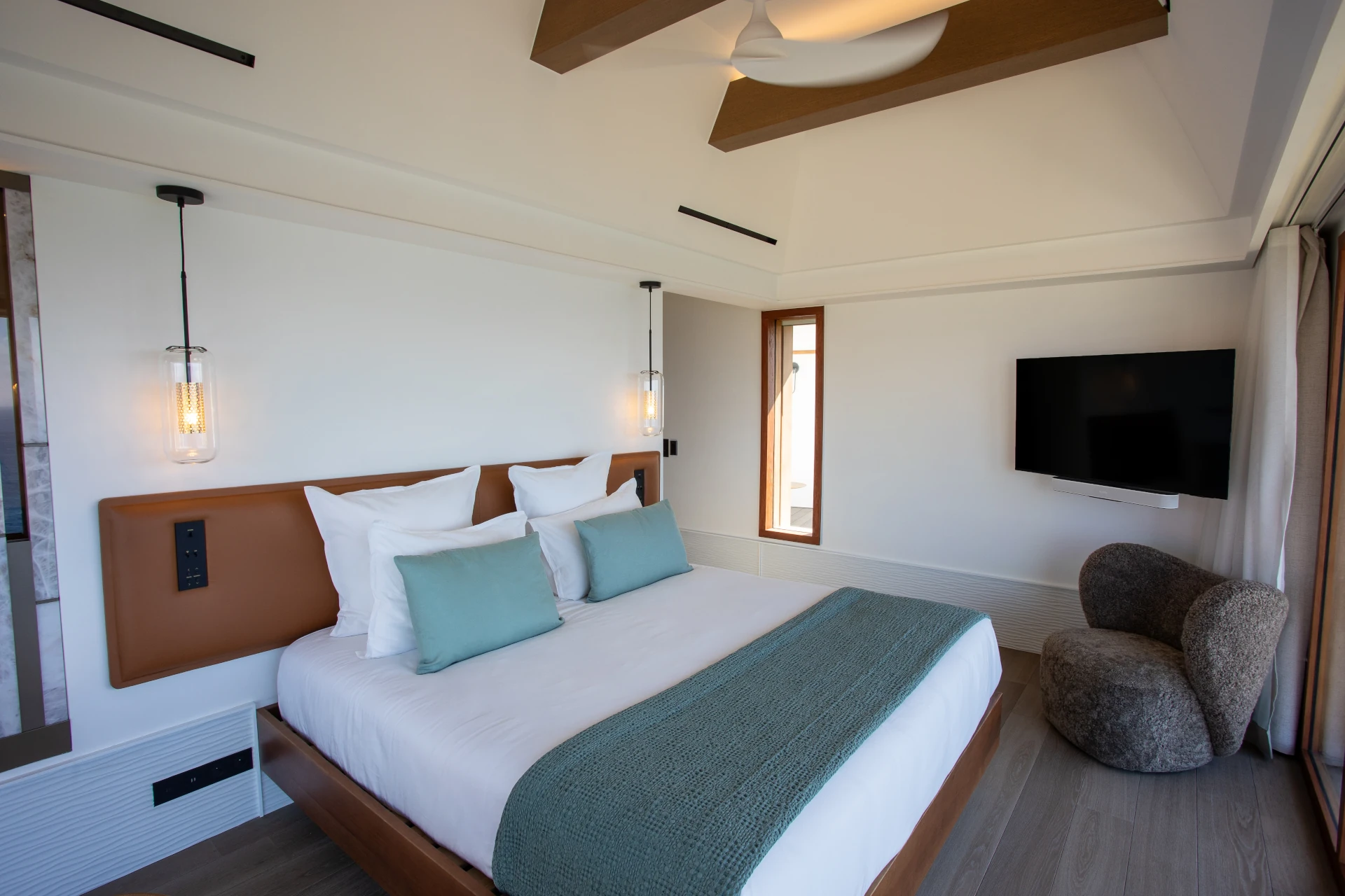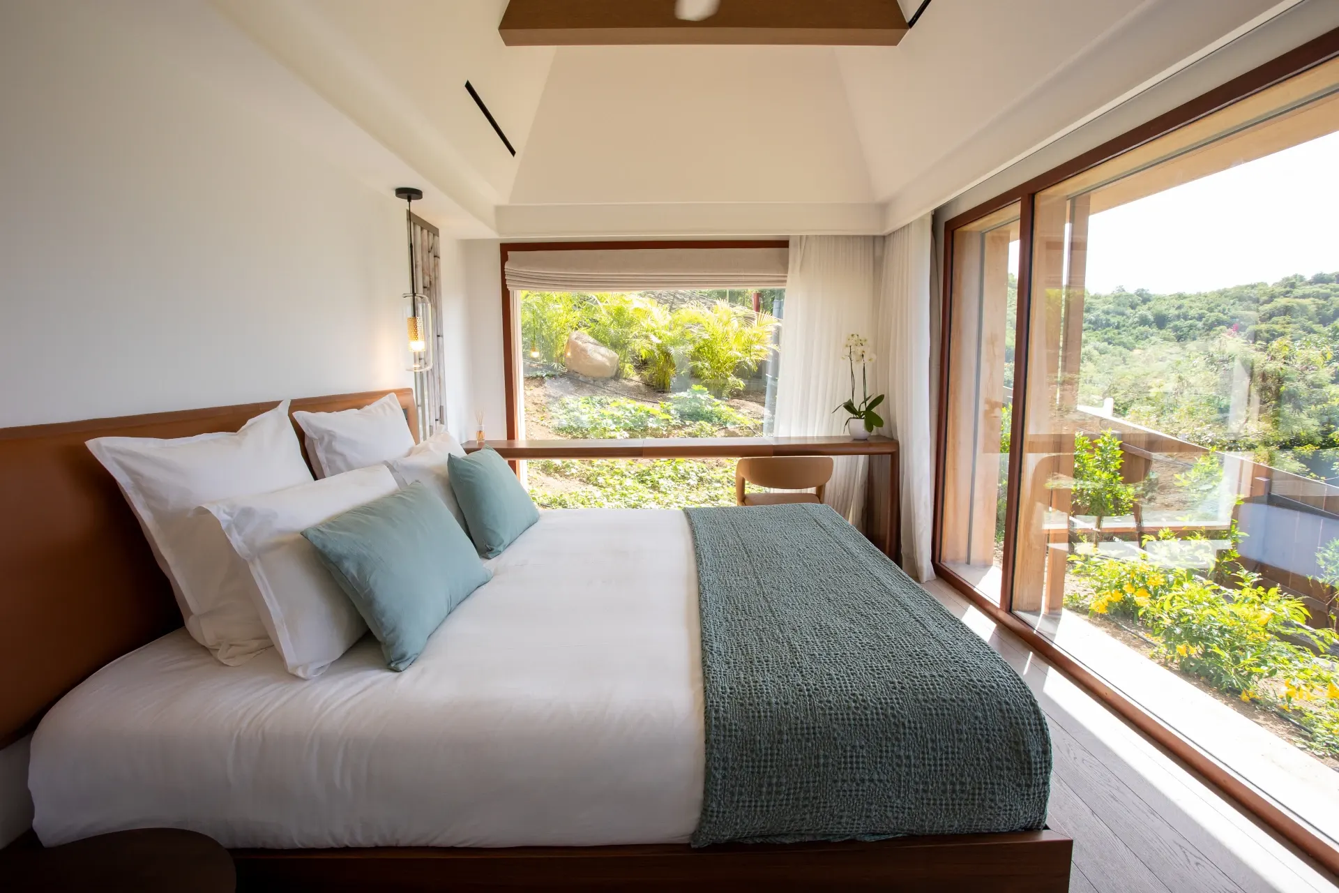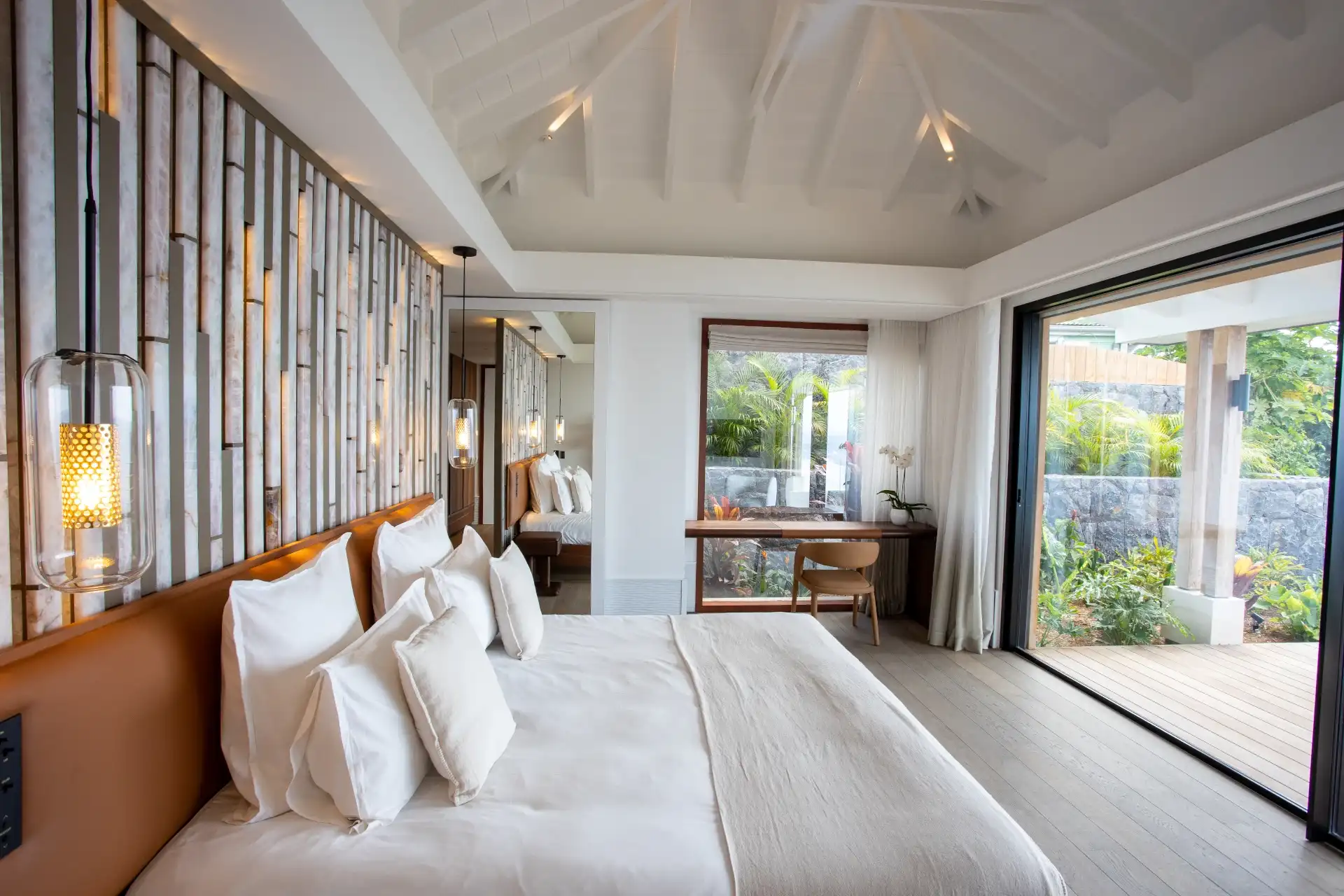 The villa features four spacious bedrooms, each with its own ensuite bathroom, thoughtfully arranged within independent bungalows to ensure privacy and tranquility. The master suite occupies the main level, while three additional bedrooms, set slightly below, offer generous volumes and an elegant, calming décor. Noble materials, soft color palettes, and carefully selected designer furnishings create an ambiance of effortless sophistication.