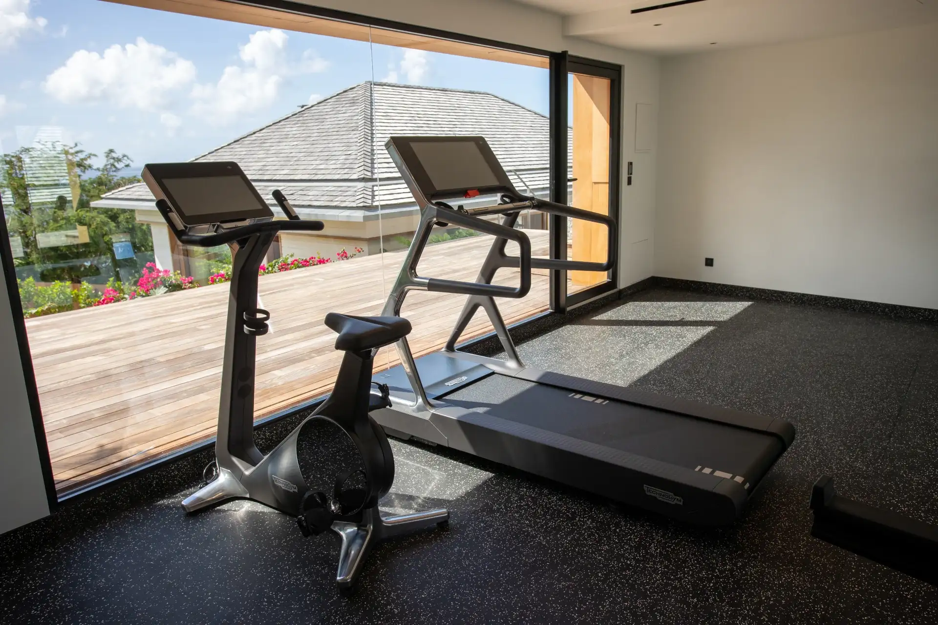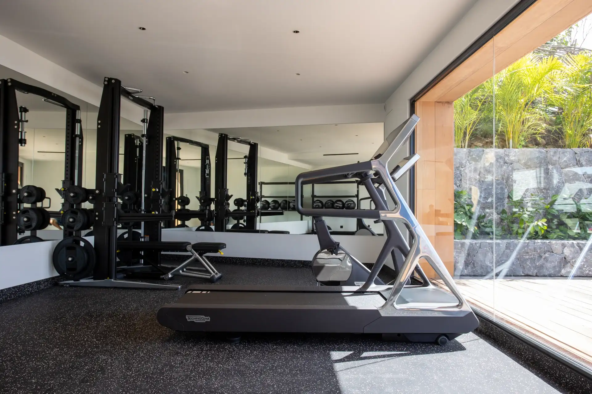 Completing this exceptional offering, Villa Sel features a fully-equipped fitness room with specialized shock-absorbing flooring for optimal comfort. The garage itself is a remarkable architectural feature, equipped with a 360-degree rotating platform for effortless maneuvering, as well as an elevator providing direct access to the main living level. An elegant stone staircase also leads to the terrace, gradually unveiling a spectacular ocean panorama.