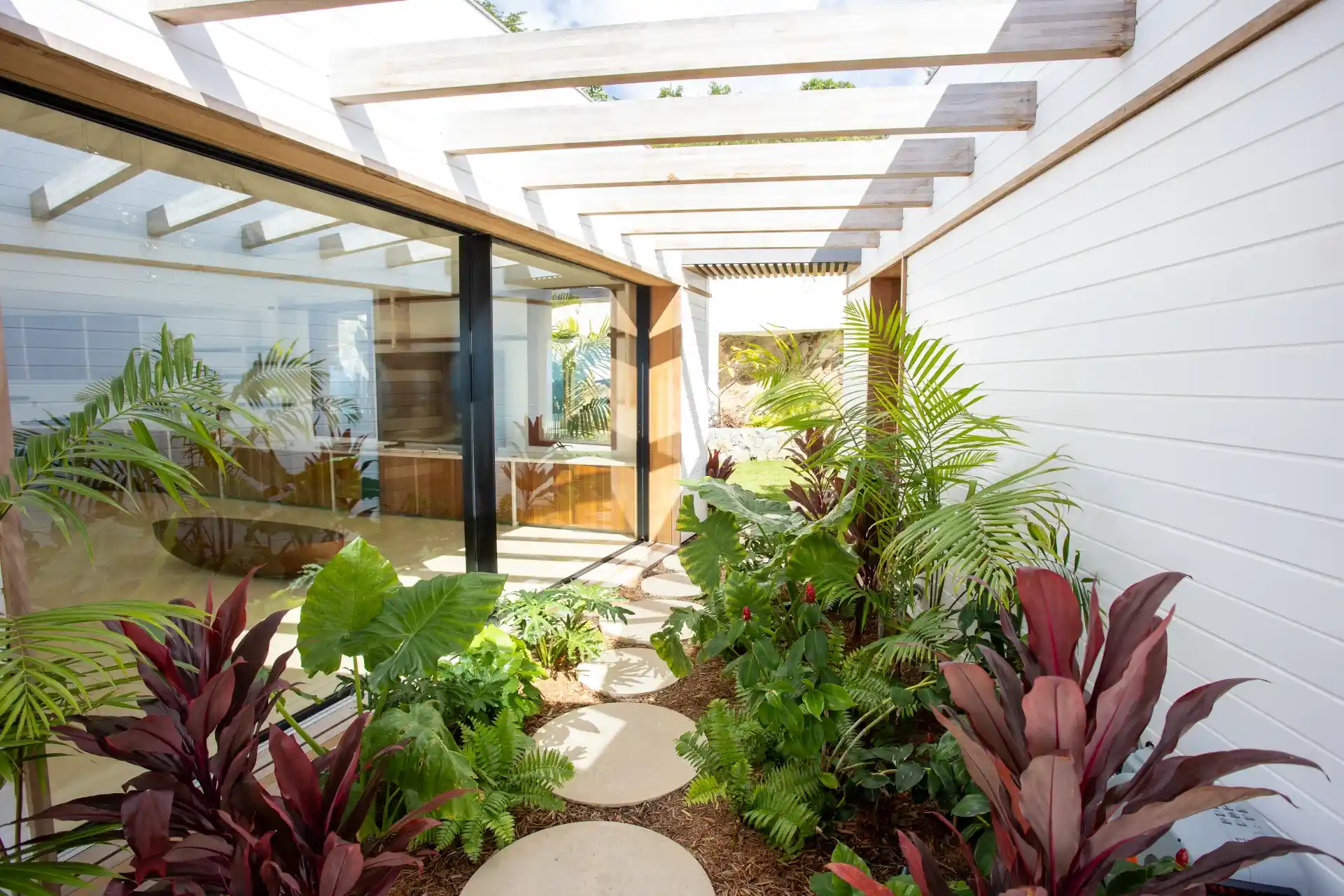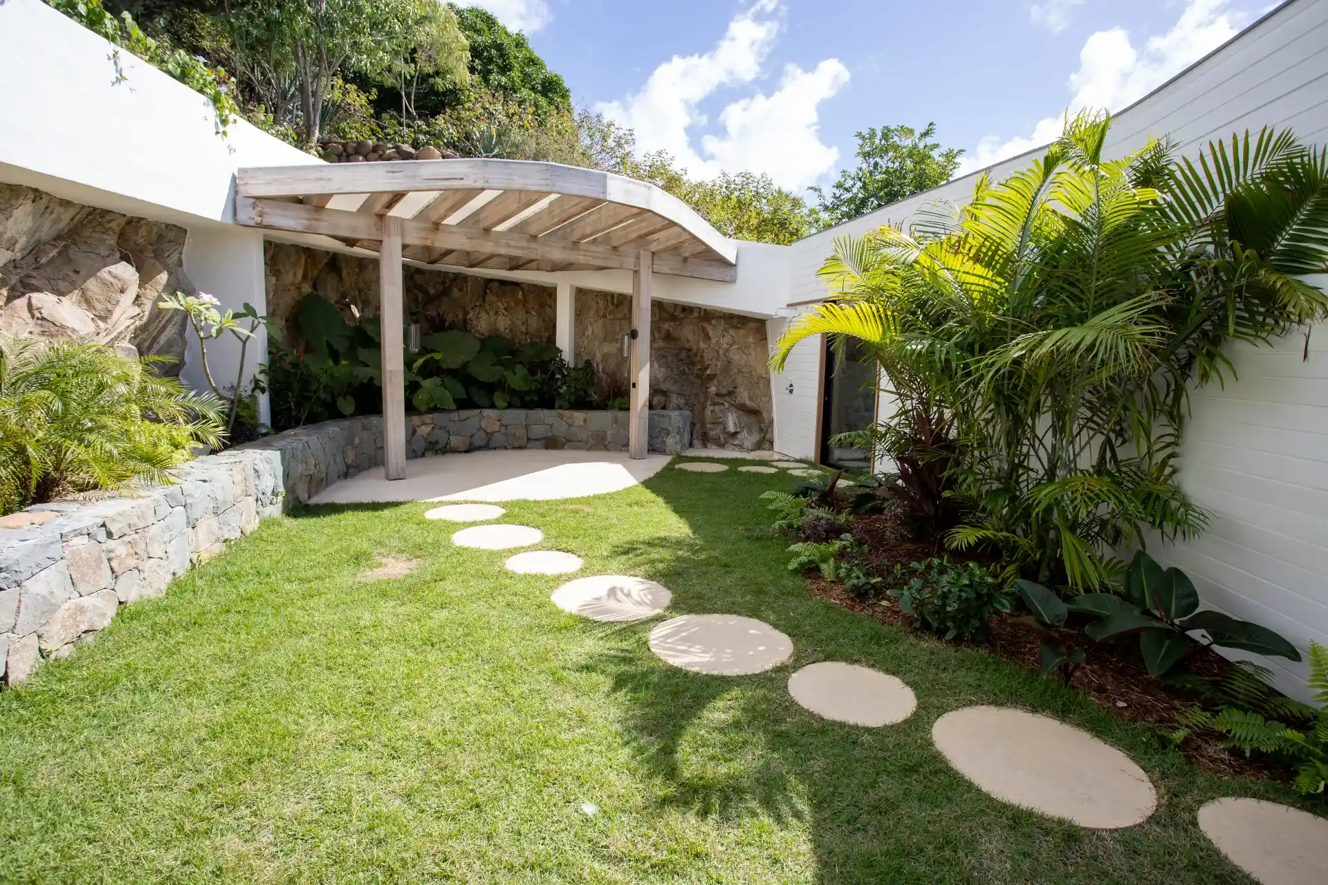 At the rear of the property, a lush, flowering garden reveals a secluded pergola—an intimate sanctuary ideal for private wellness moments, such as massages, sheltered from view and accompanied by the soothing sounds of nature.