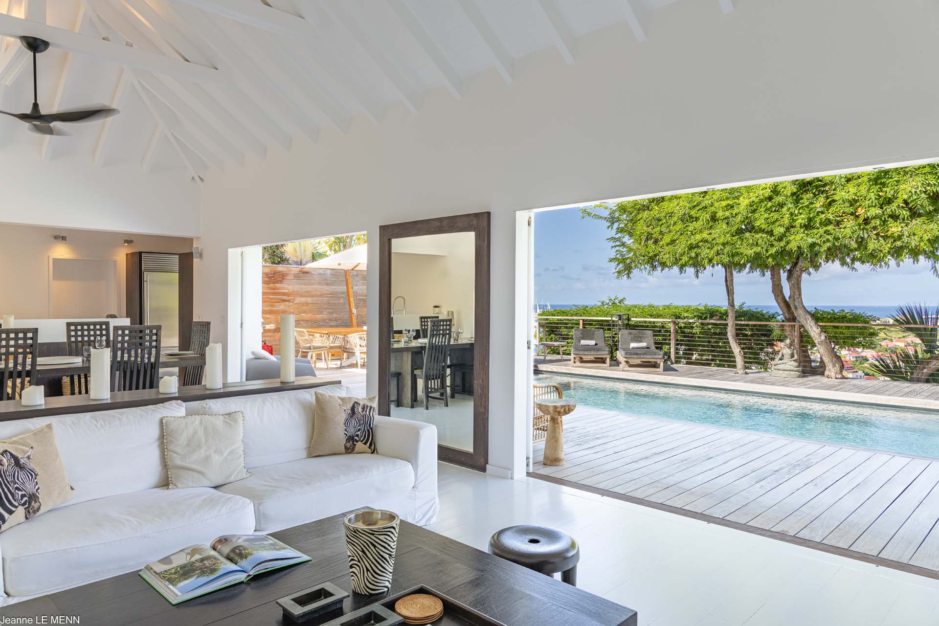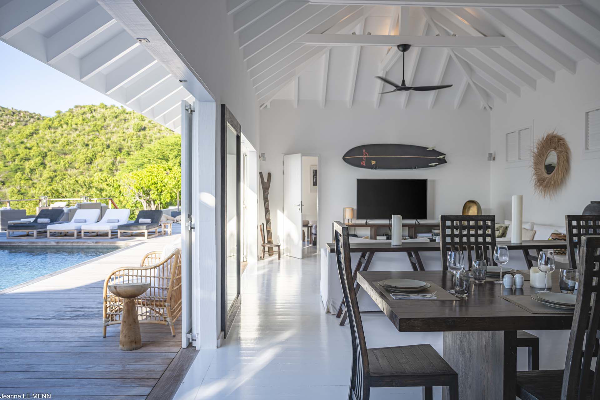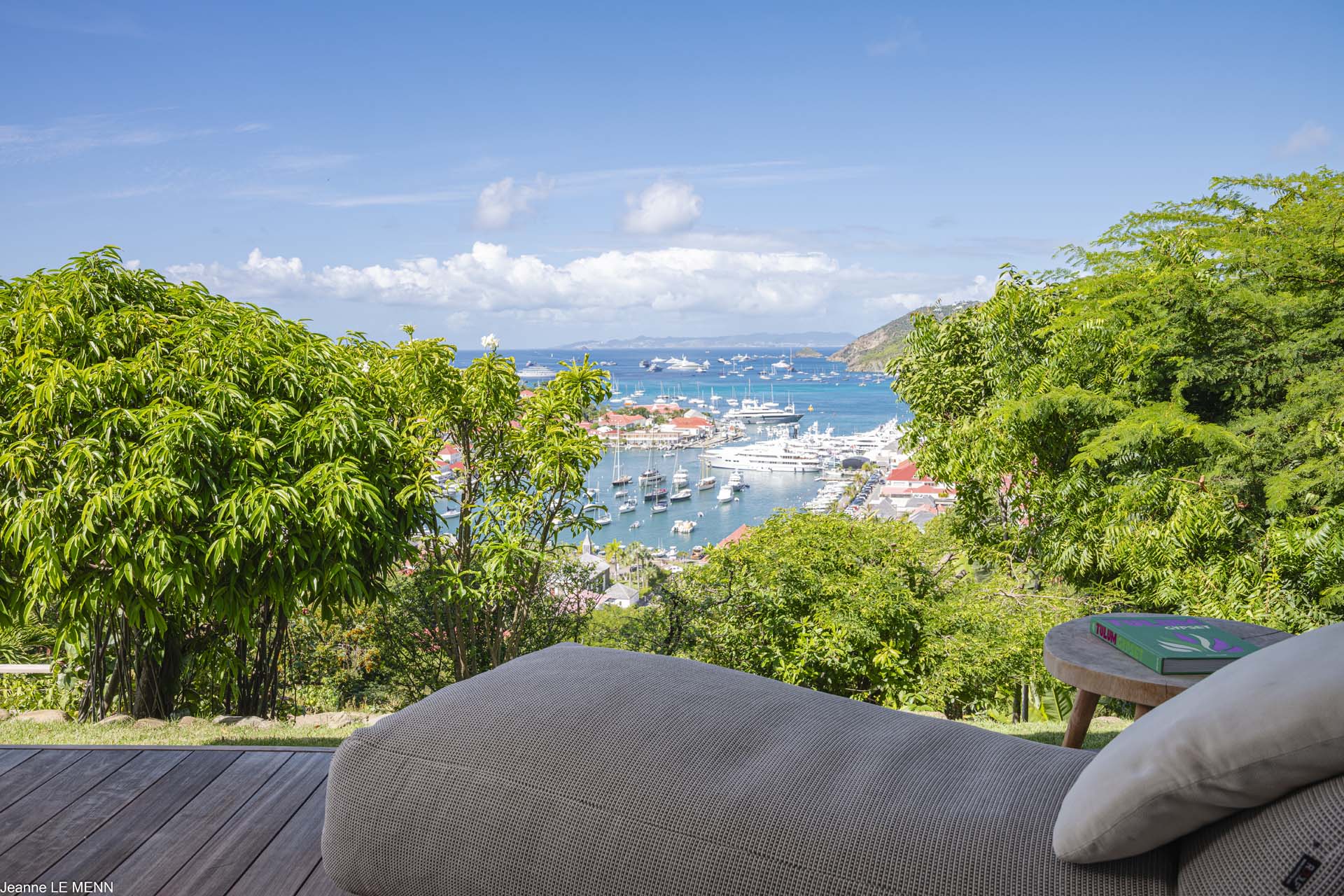 The layout of Villa Serenity is long and thin, with each of the separate spaces of the home accessed from the outdoor terrace. This unique style means that wherever you are in the home, a quick glance reveals those incredible views over the red roofs of Gustavia, with luxury yachts at anchor in the harbor.