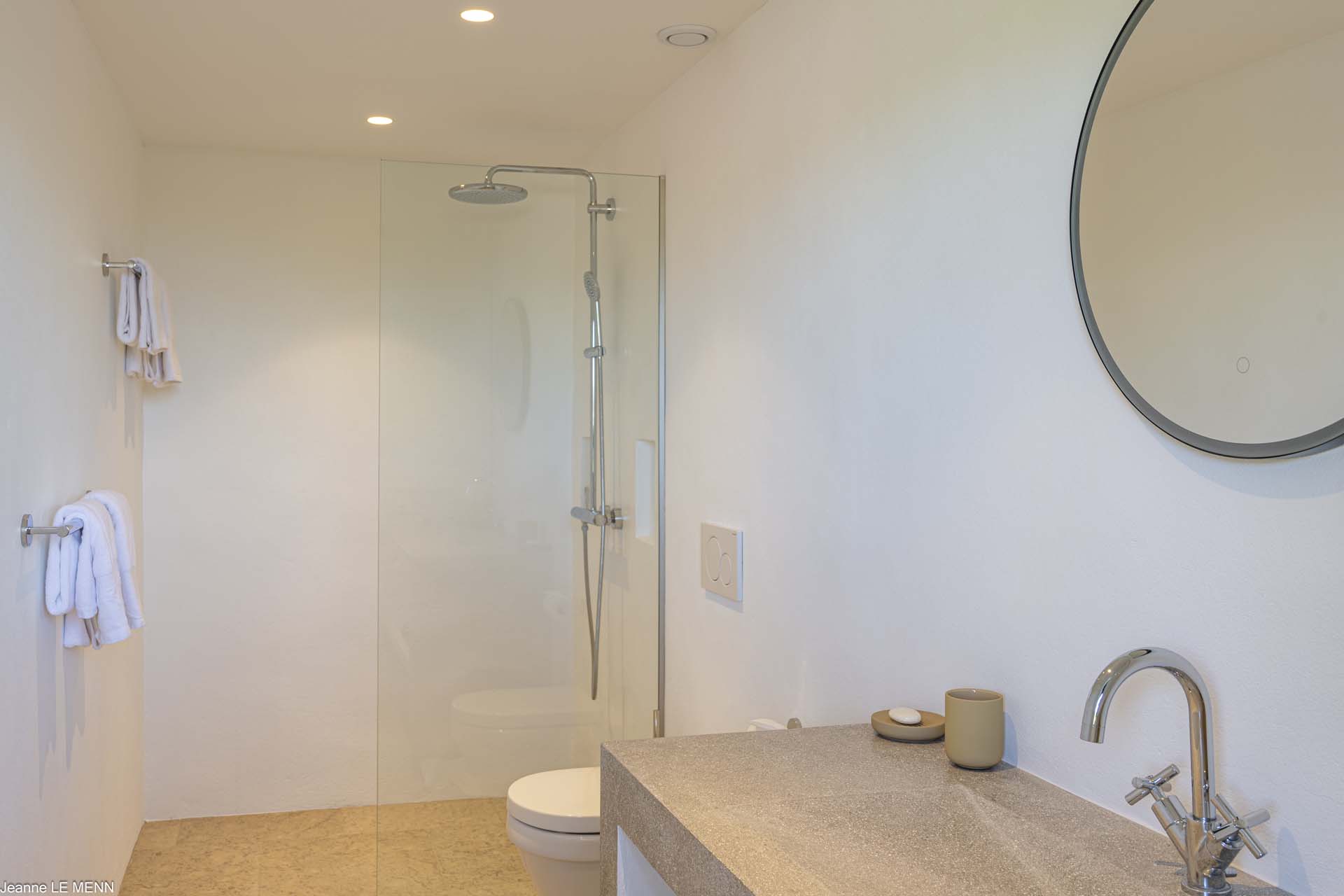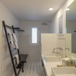 Wandering further along the terrace brings you to the other two bedrooms, located in a guesthouse that is separated from the main villa by a small garden area. Each of these rooms has a pair of twin beds that can be configured into a king. A private terrace out the front of these rooms overlooks the harbor. The fourth bedroom is located on the lower level.