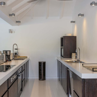 To the other side of the great room is Serenity’s large, gourmet kitchen. Cooking meals here is a pleasure, with space enough for the whole group to get involved. Our concierge can even organize a grocery delivery, or for a special occasion, a private chef.