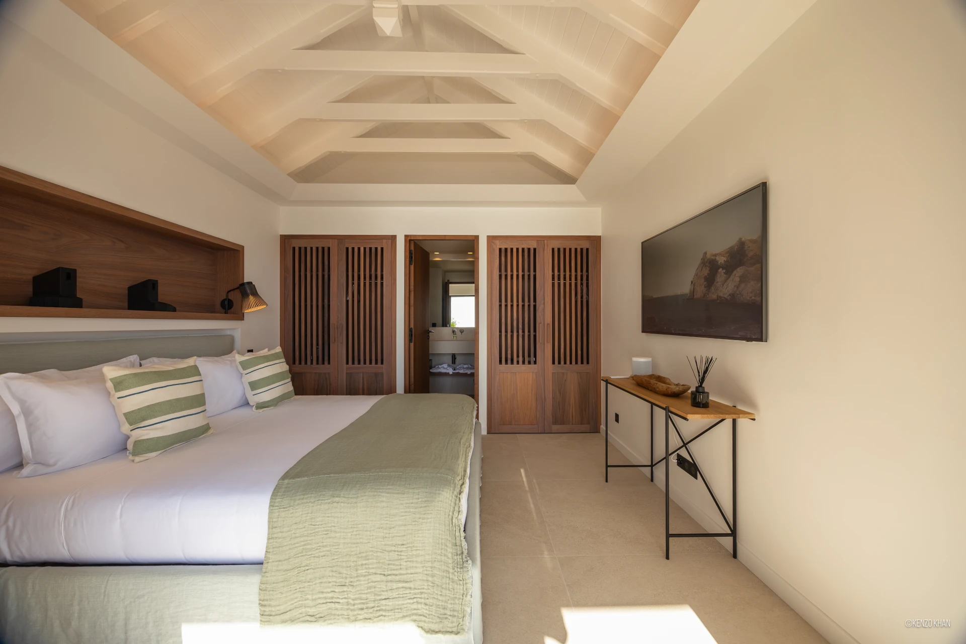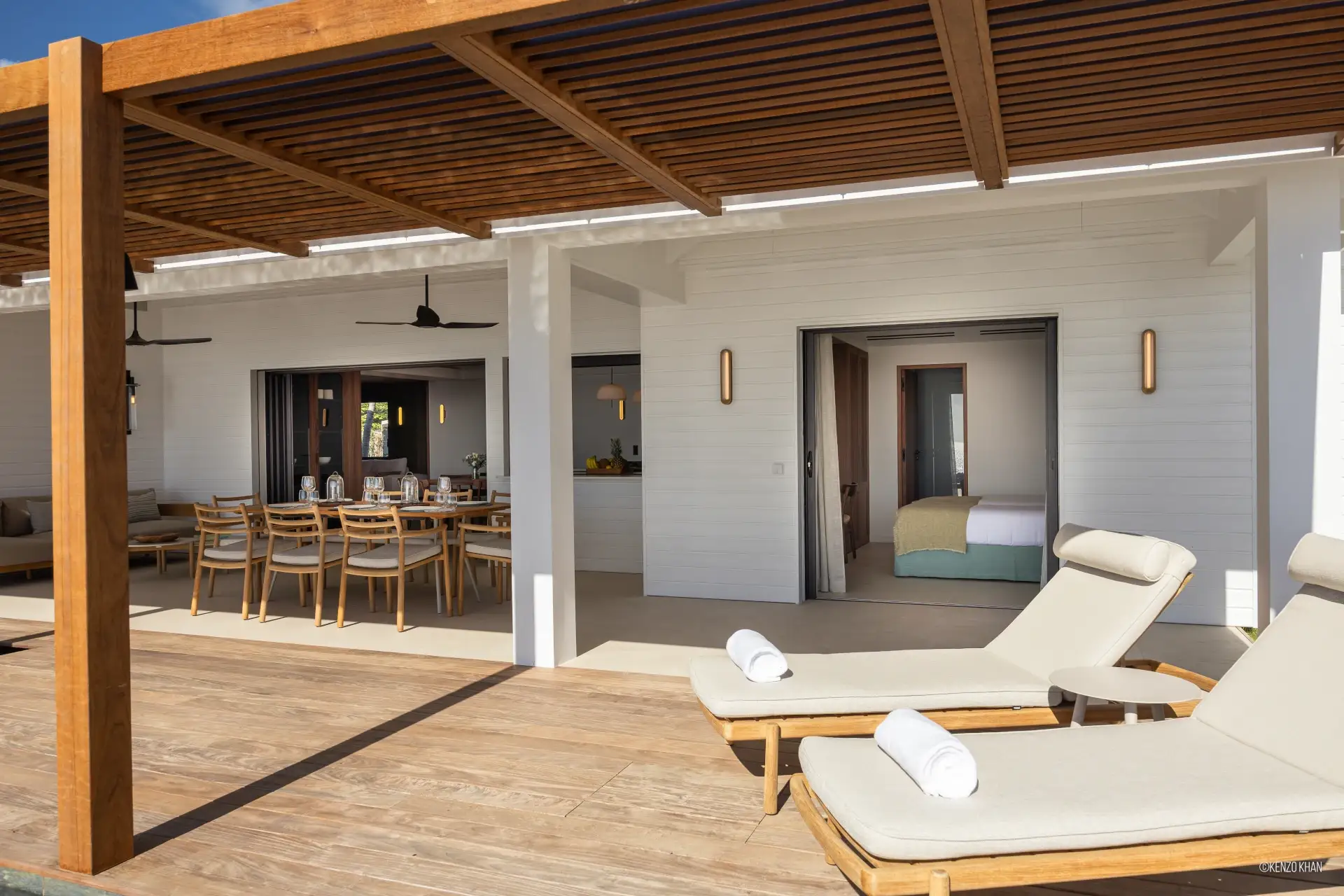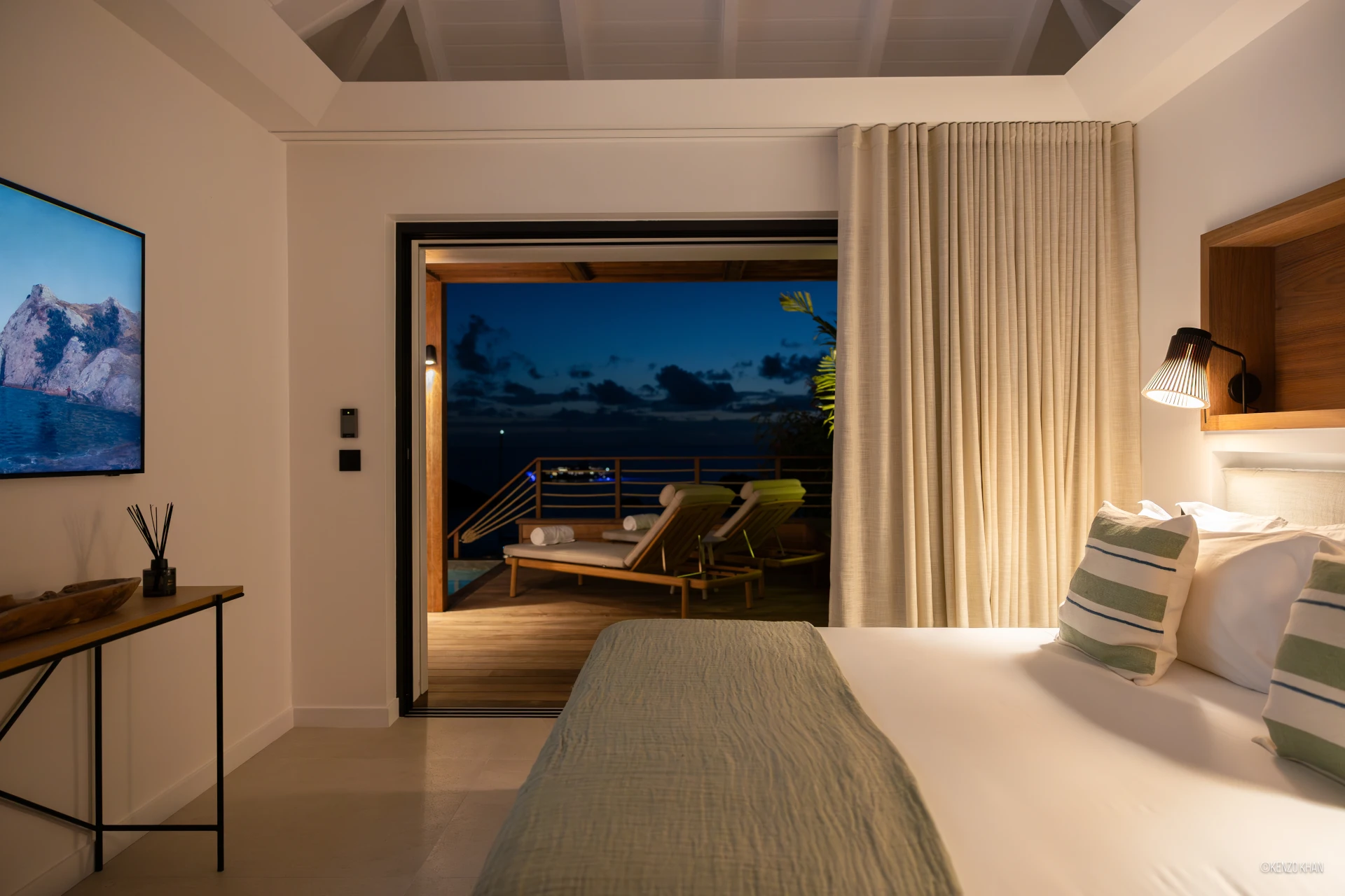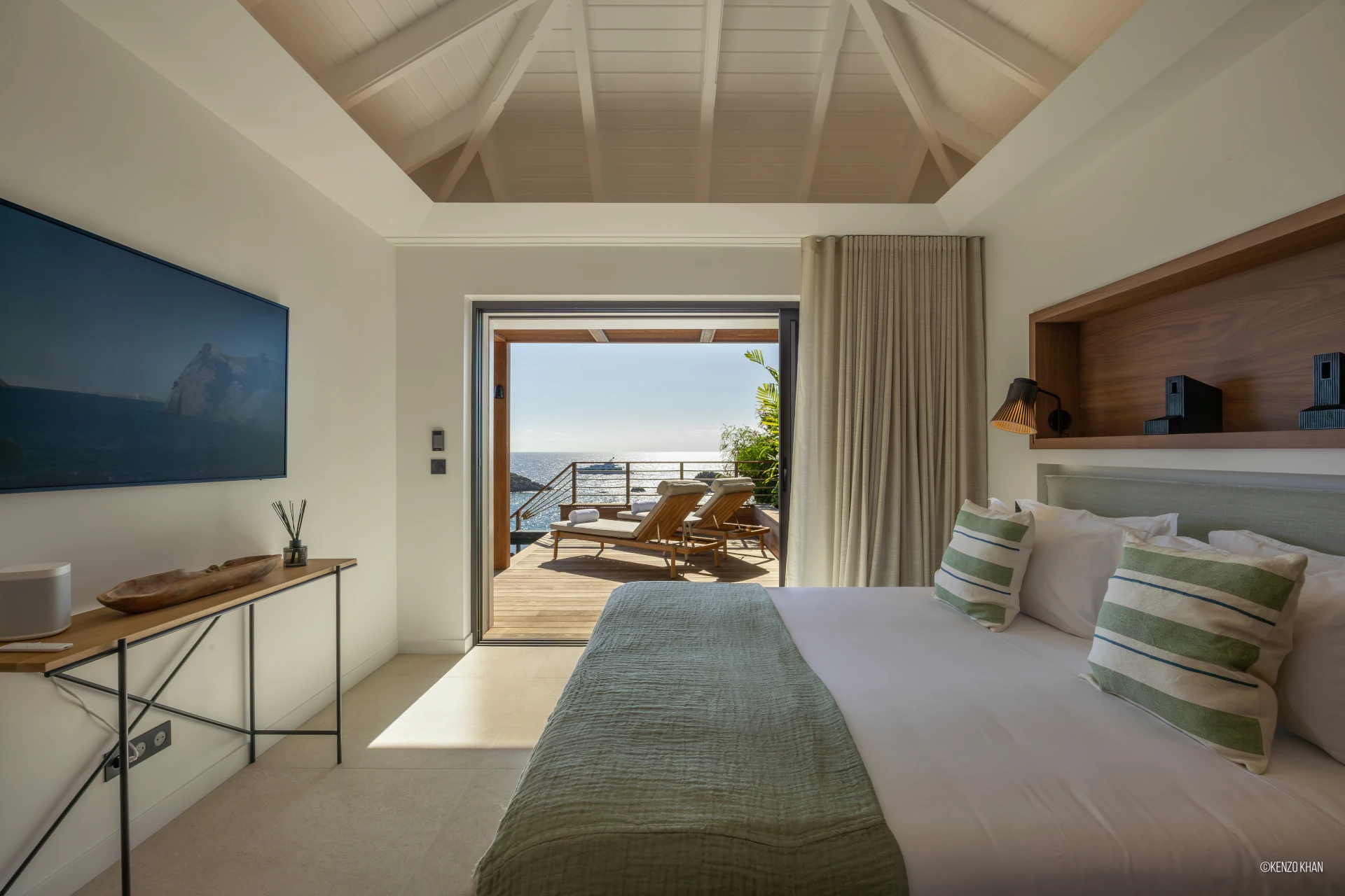 The villa features two equal-size bedrooms, one with a king bed and the other with a king or 2 twin beds, and each have their own ensuite bathroom, both facing the ocean. Each bedroom has an independent exterior access, ensuring comfort and privacy for every guest. Fully air-conditioned throughout, the living spaces include a bright living/TV room open to the kitchen, creating a warm and convivial setting ideal for sharing relaxed moments together.
