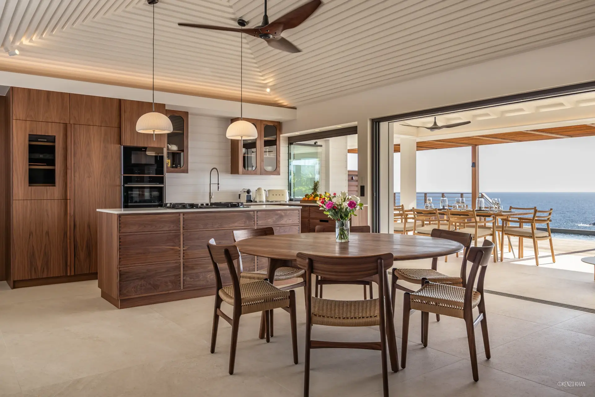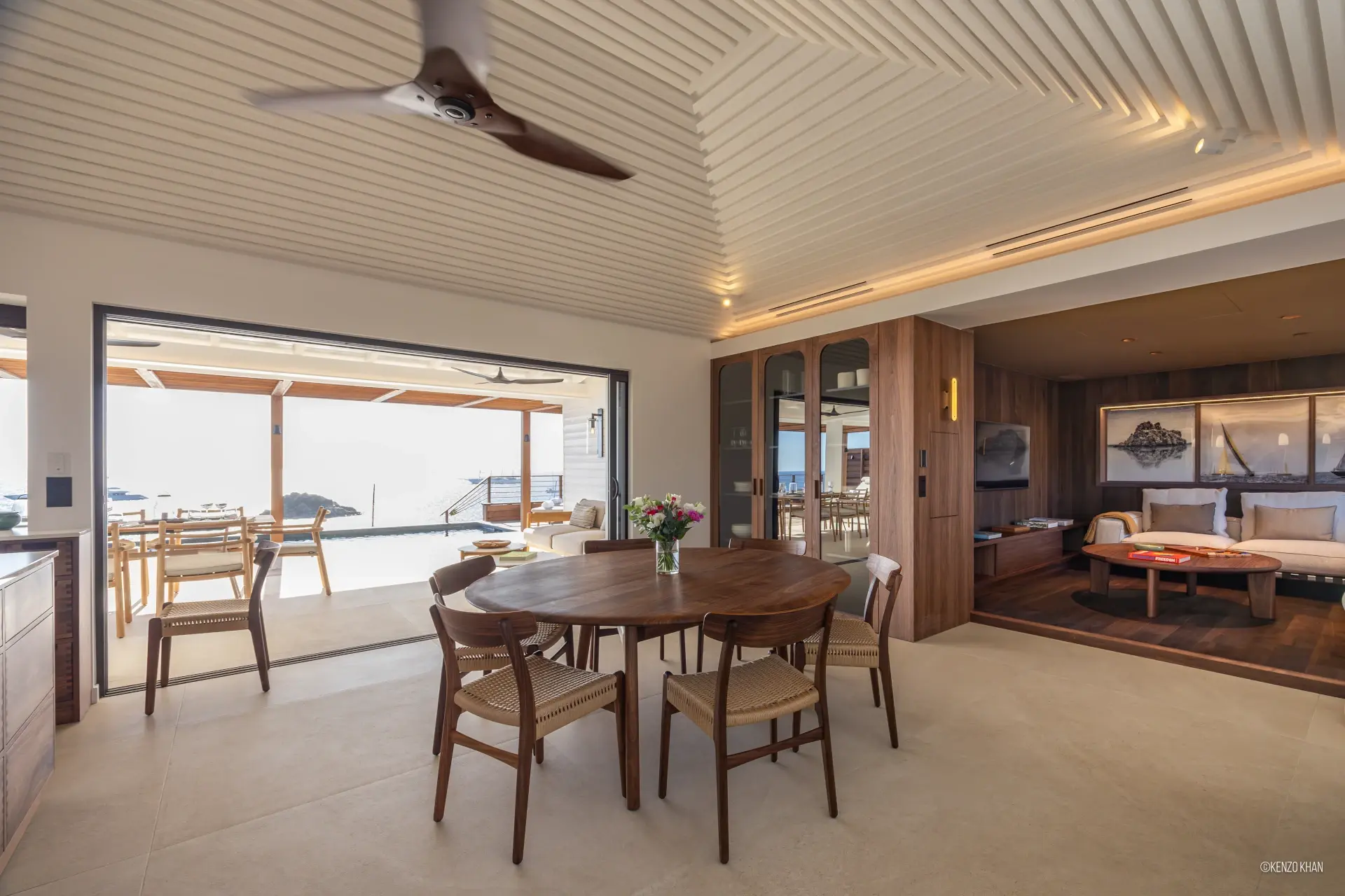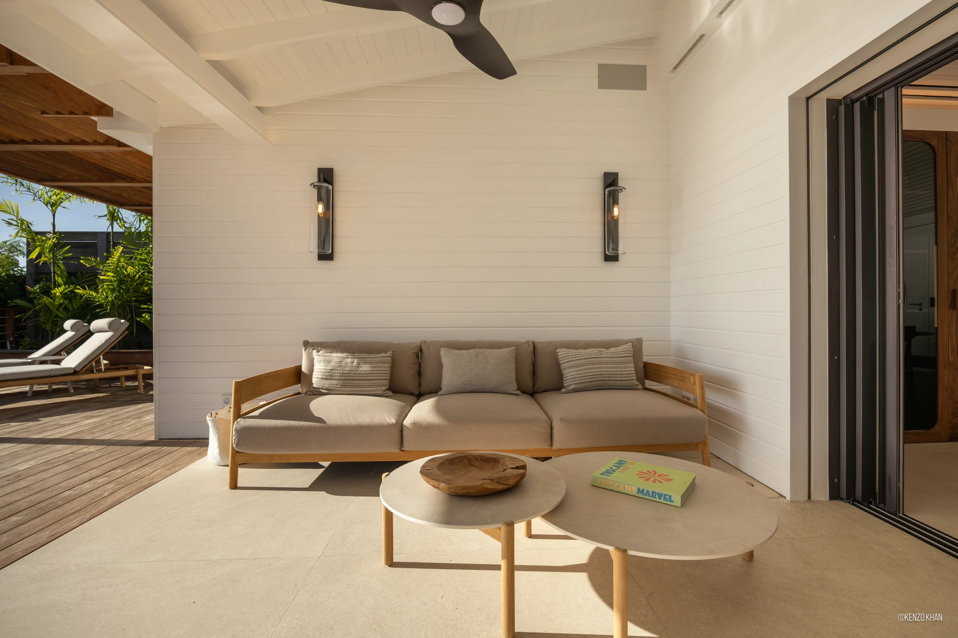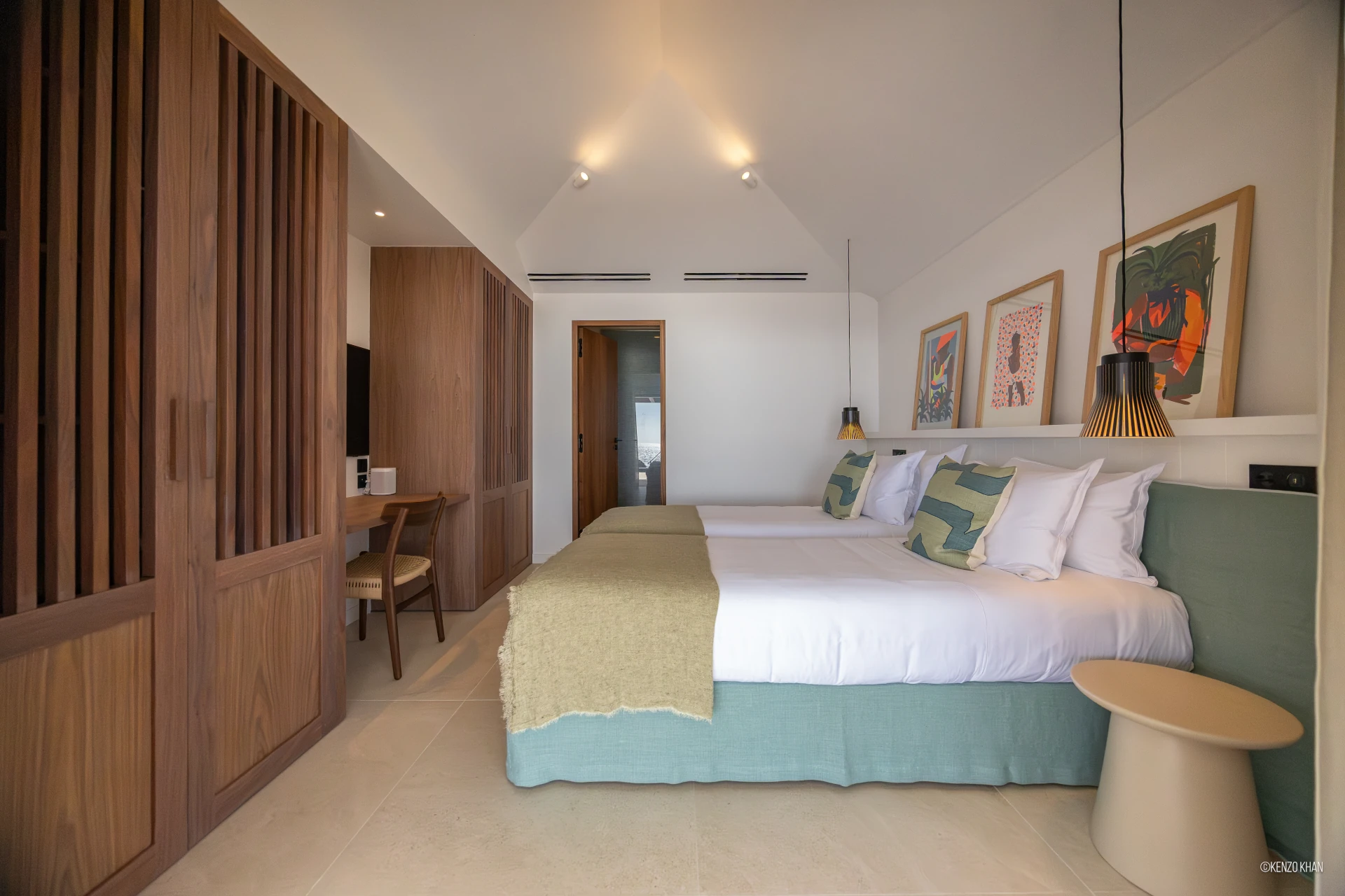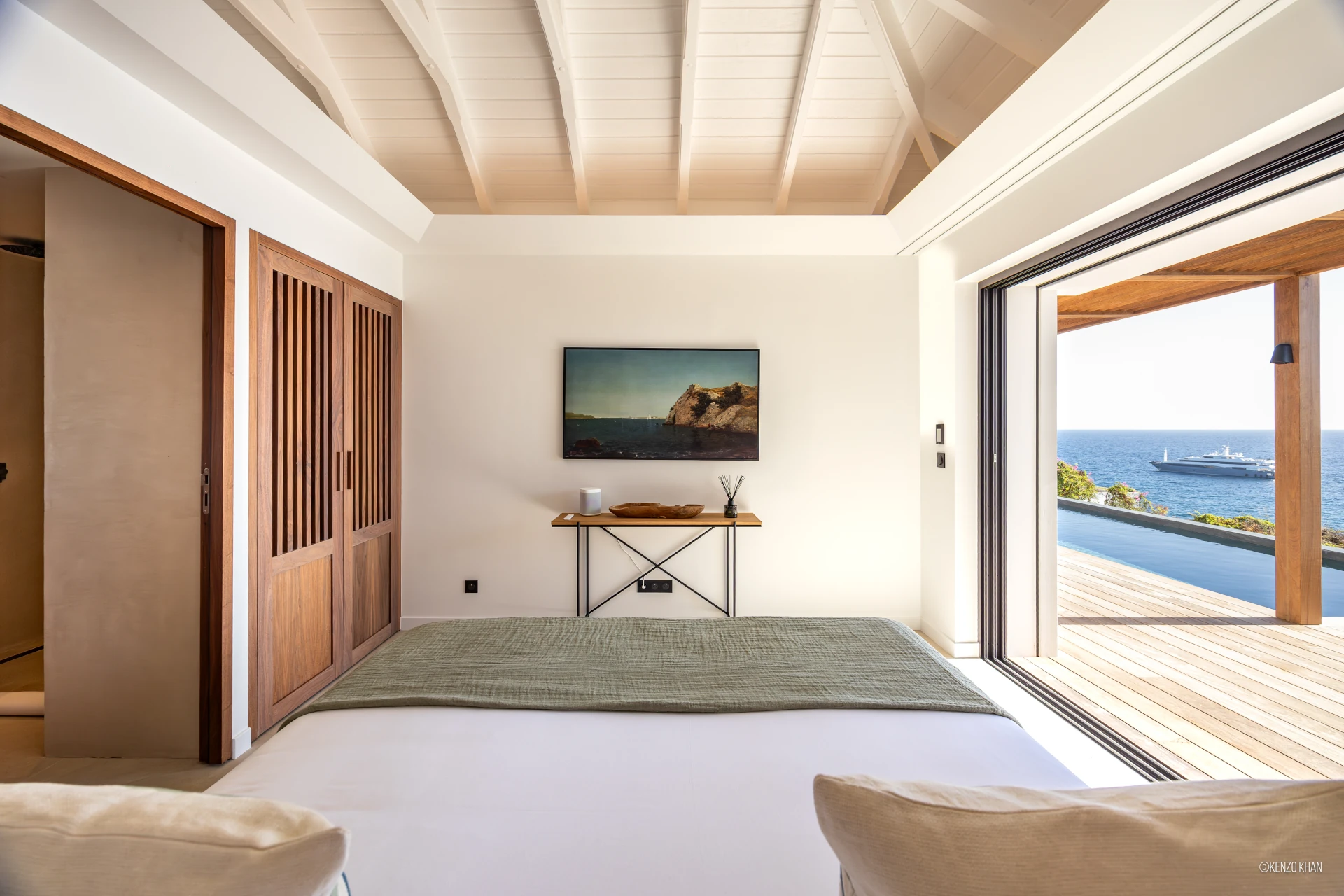 The villa features two equal-size bedrooms, one with a king bed and the other with a king or 2 twin beds, and each have their own ensuite bathroom, both facing the ocean. Each bedroom has an independent exterior access, ensuring comfort and privacy for every guest. Fully air-conditioned throughout, the living spaces include a bright living/TV room open to the kitchen, creating a warm and convivial setting ideal for sharing relaxed moments together.
