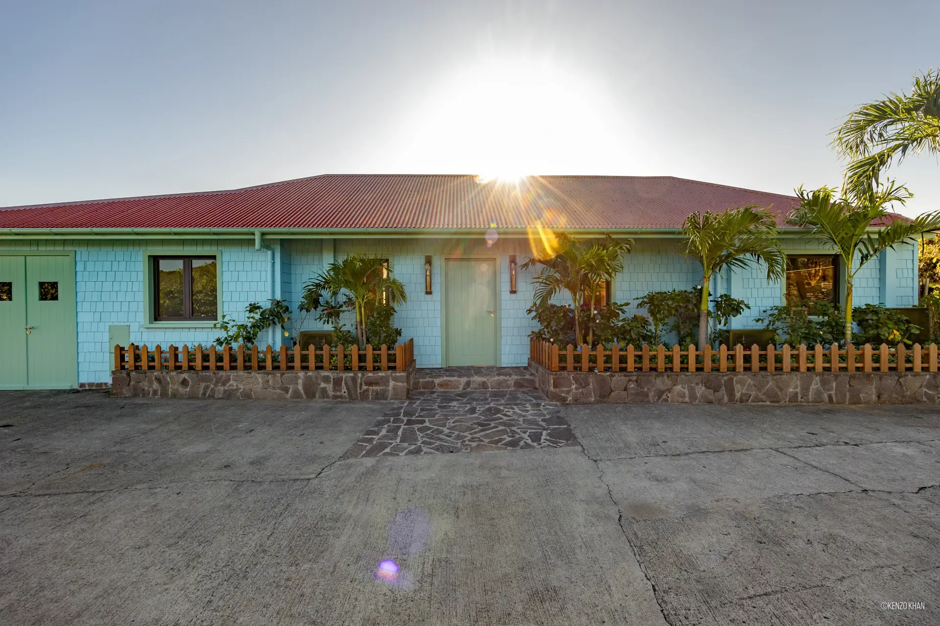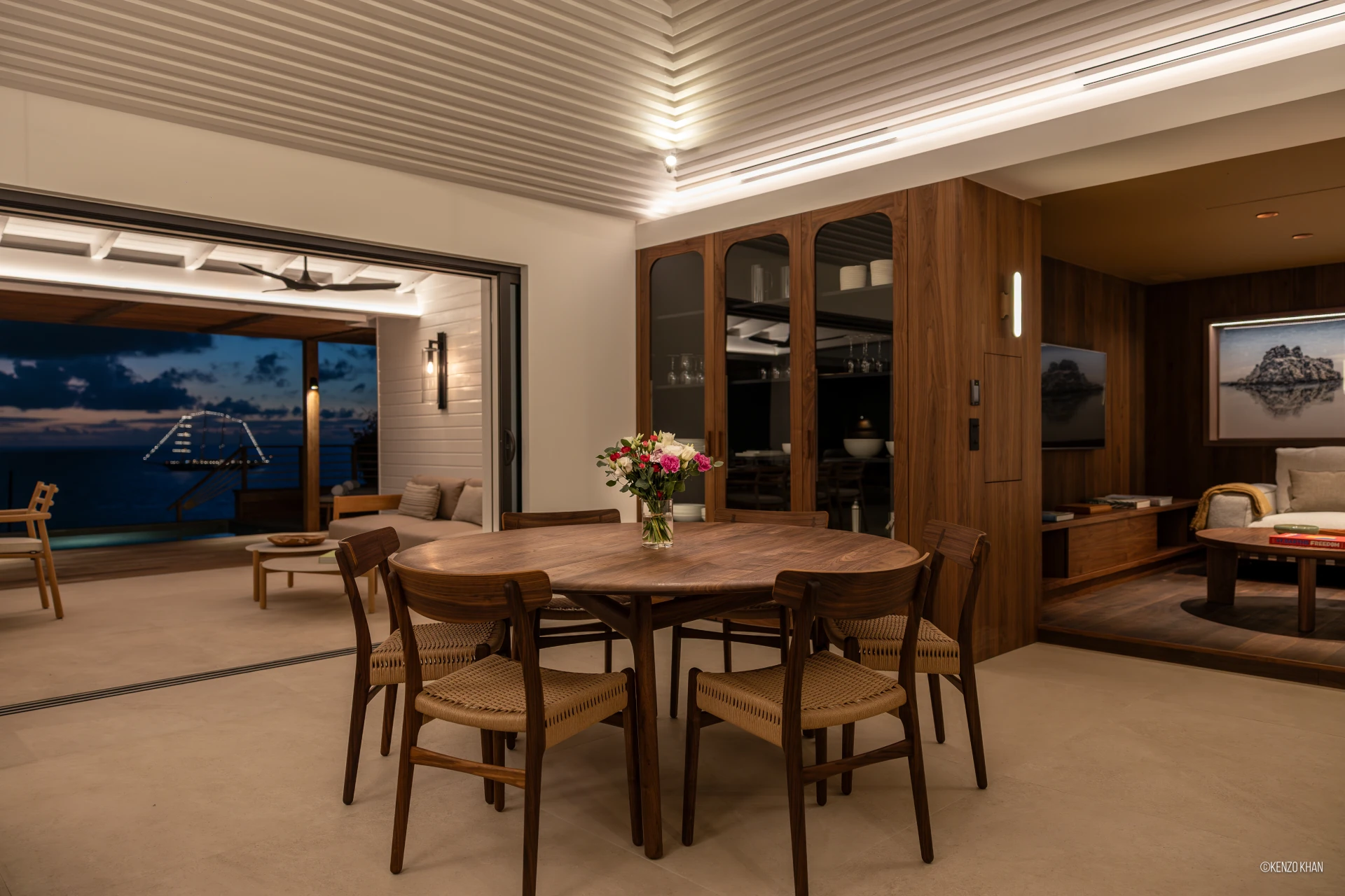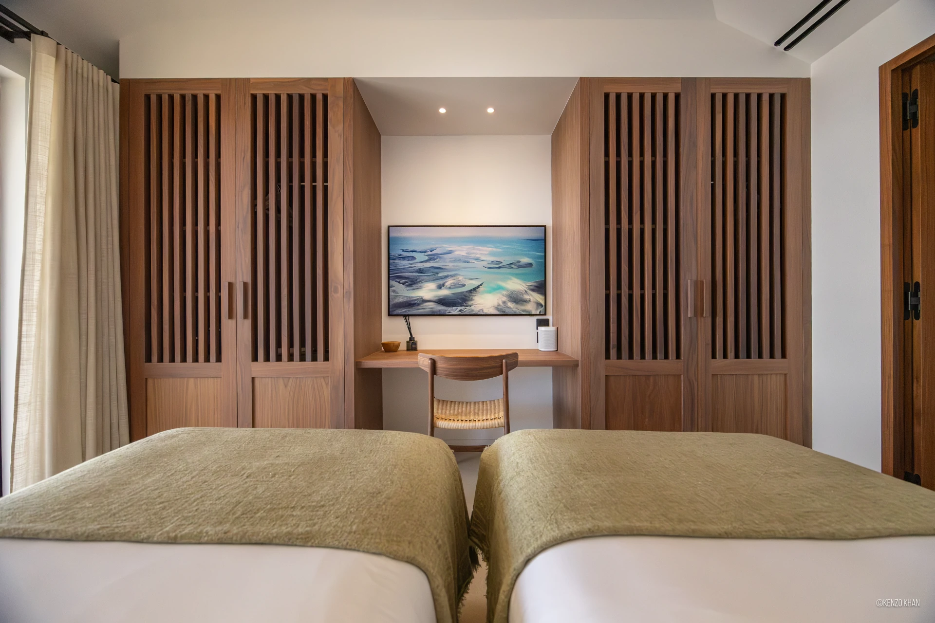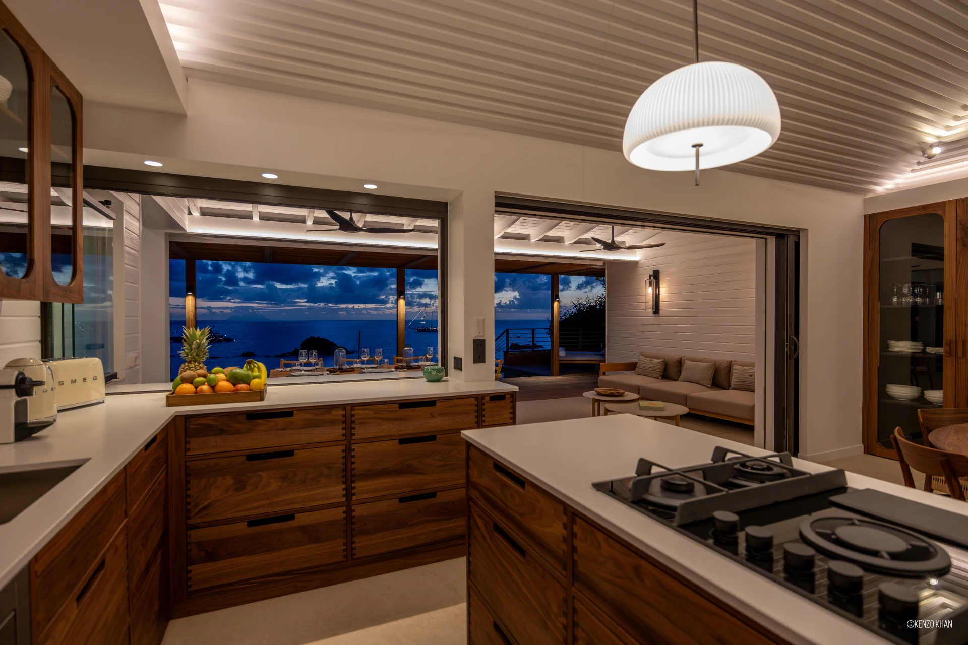 The villa features two equal-size bedrooms, one with a king bed and the other with a king or 2 twin beds, and each have their own ensuite bathroom, both facing the ocean. Each bedroom has an independent exterior access, ensuring comfort and privacy for every guest. Fully air-conditioned throughout, the living spaces include a bright living/TV room open to the kitchen, creating a warm and convivial setting ideal for sharing relaxed moments together.