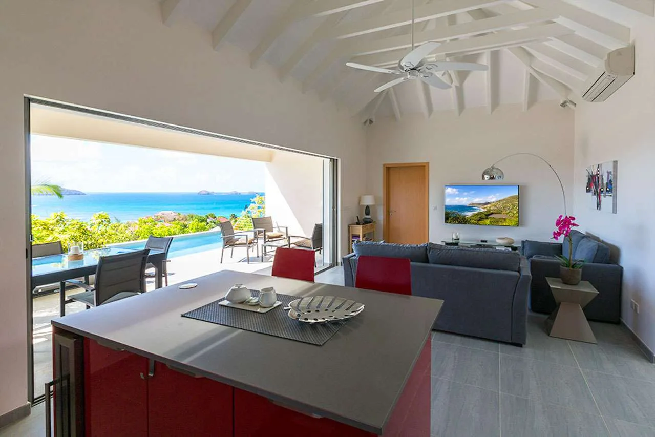 The bright living spaces inside Villa Suite Acajous encourage relaxed days spent lounging around, soaking up the enticing breeze. The central great room features the living room and kitchen, with a huge door that slides open to reveal the incredible island views.