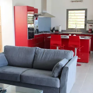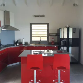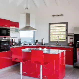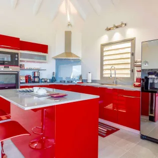 The modern kitchen is the eye-catcher in the main room, chic in bold red. Stainless steel appliances make this space feel updated and modern, an ideal spot to experiment with local island ingredients. Our concierge even has a few tricks up their sleeves, from grocery delivery to organizing a private chef for a romantic evening meal.