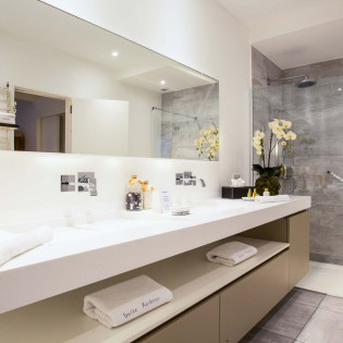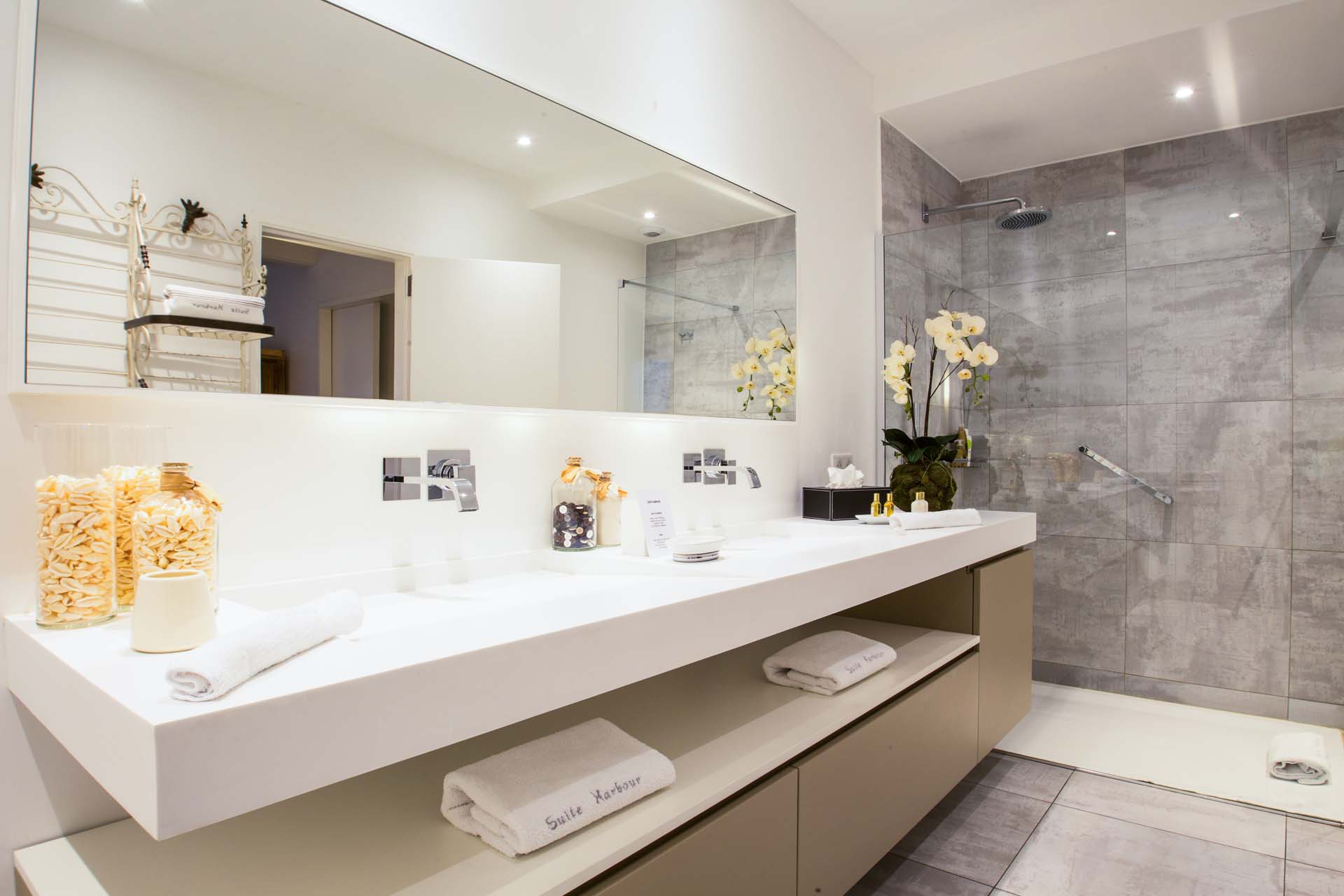 Between the living area and the kitchen is Suite Harbour’s dining table. Offering space for up to six guests, it’s a classic spot to gather with family and friends, enjoy a meal that lasts long into the evening.