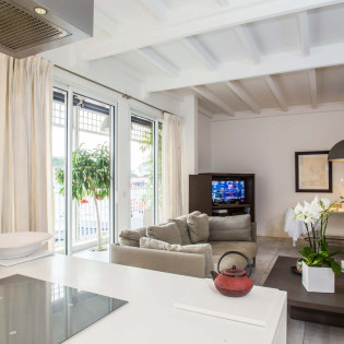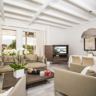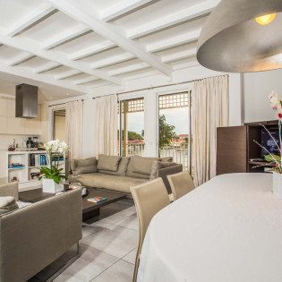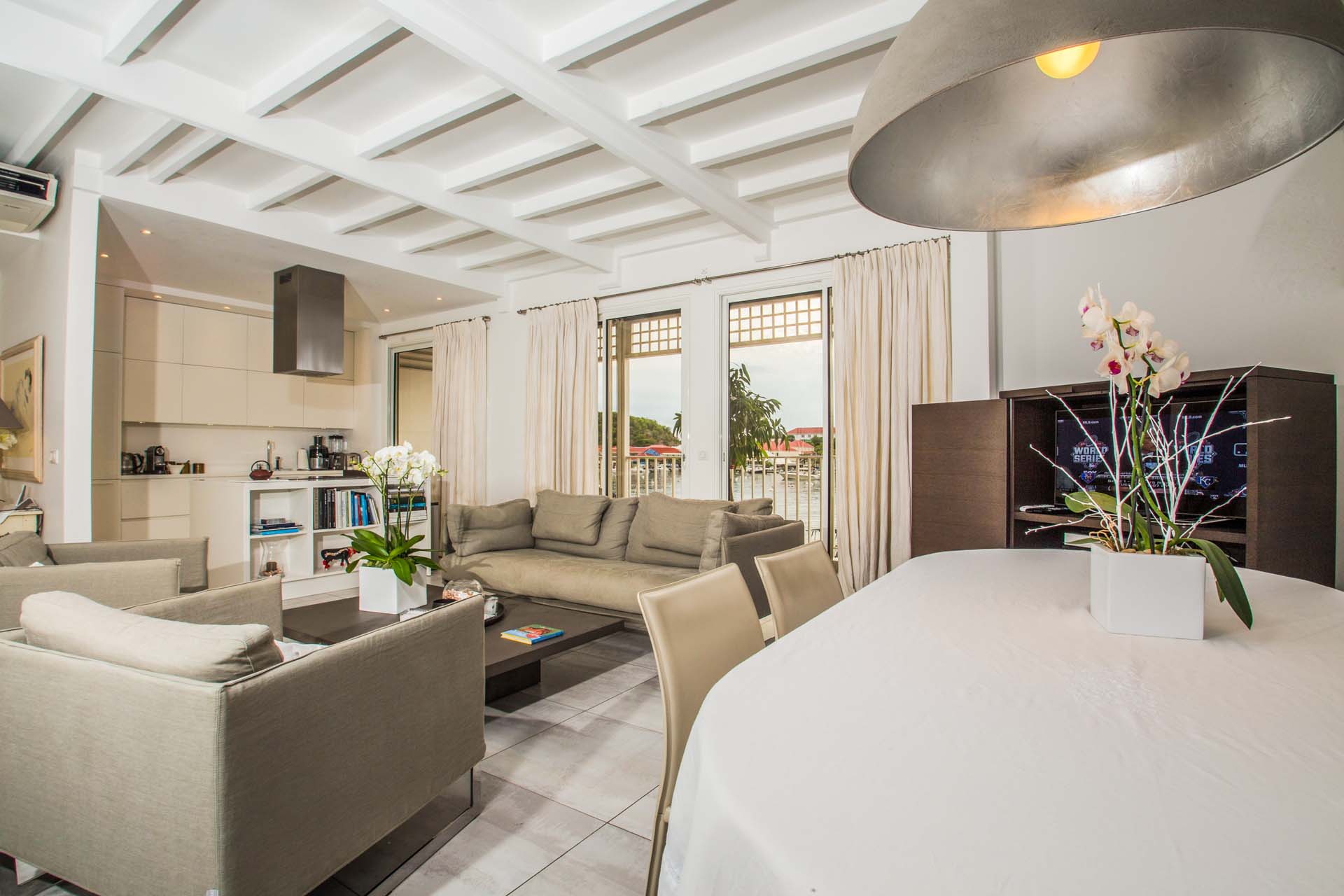 The open-plan layout inside Apartment Suite Harbour ensures that the island light and tropical breezes are as much a part of the home as the furnishings and décor. The style is a mix of modern and classic. The main great room is at the heart of the home, offering a living room, dining area, and kitchen in one.