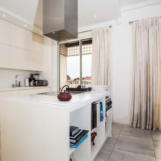 Sharing the space with the living room is the kitchen at Suite Harbour. Sleek in white with contemporary cabinetry, this is a well-equipped space for preparing meals during your stay. Doors open wide to the balcony, welcoming the island breeze for inspiration.