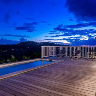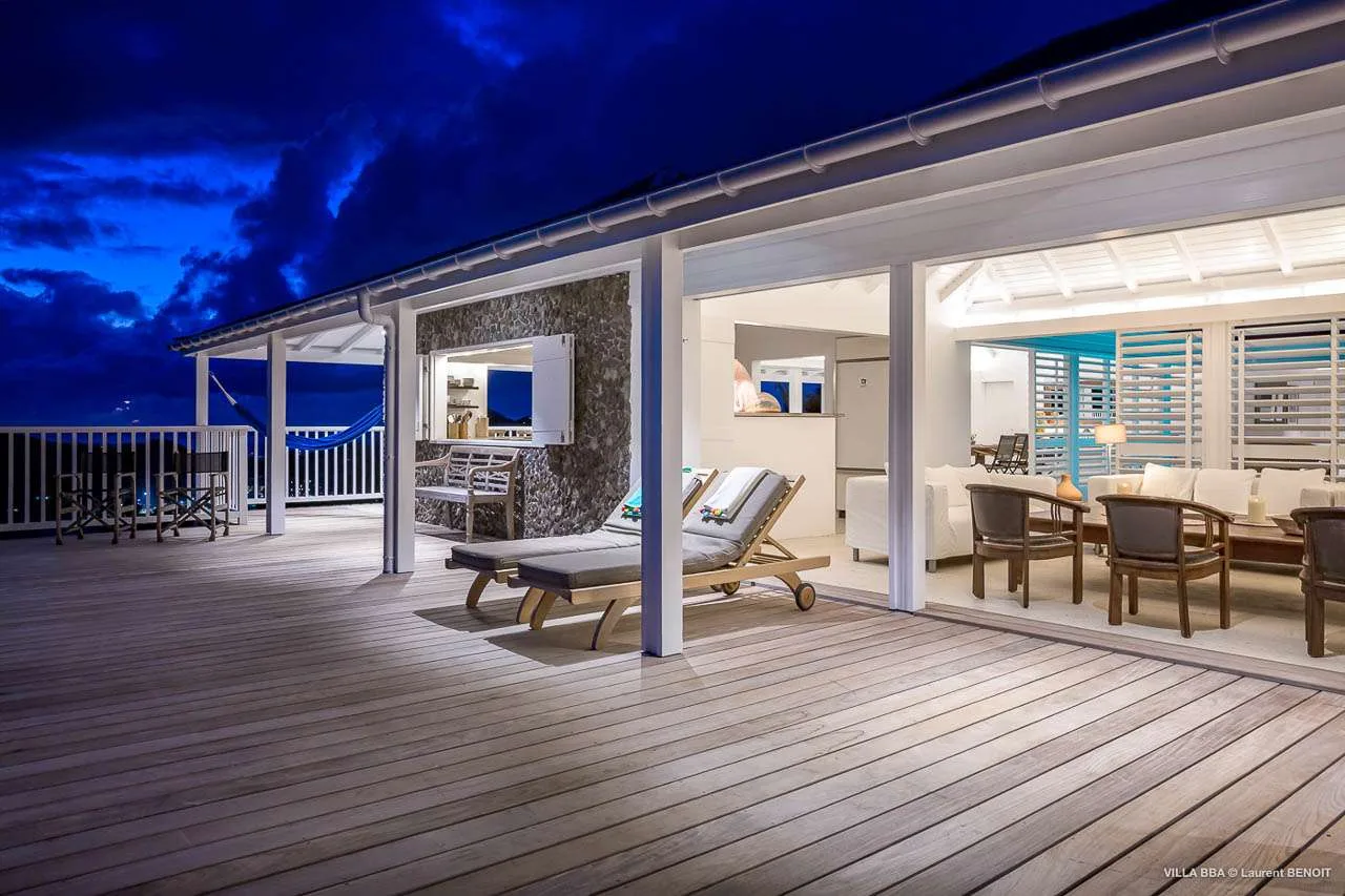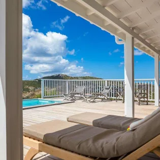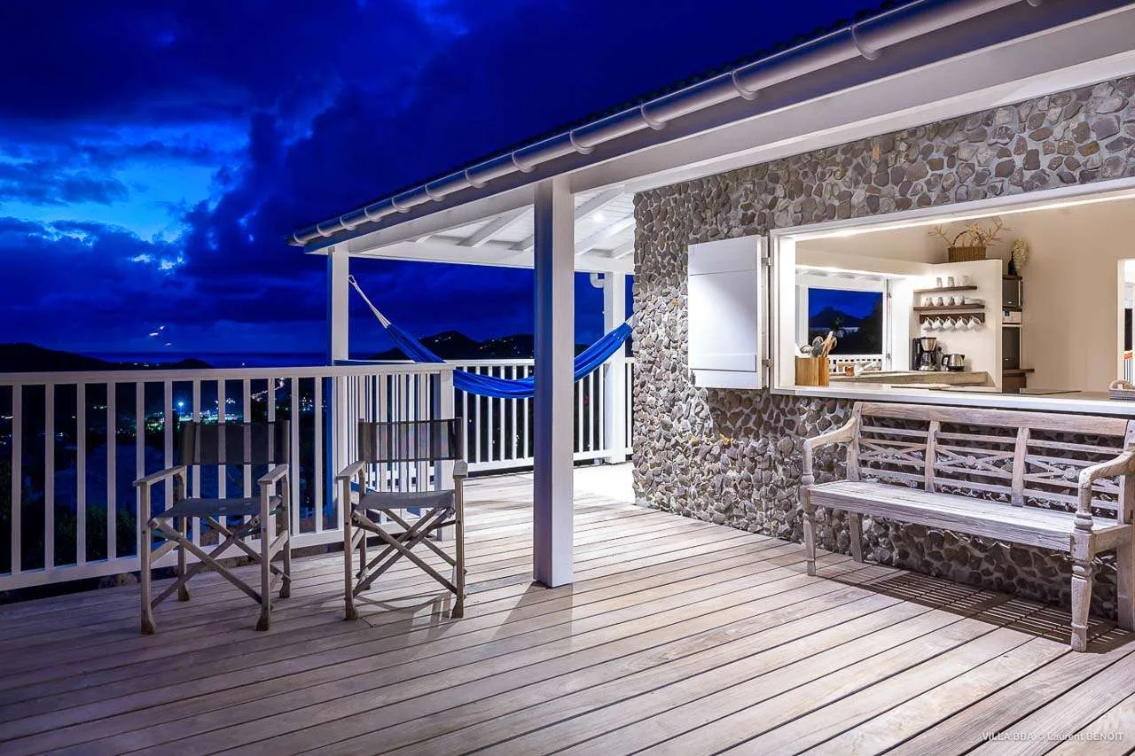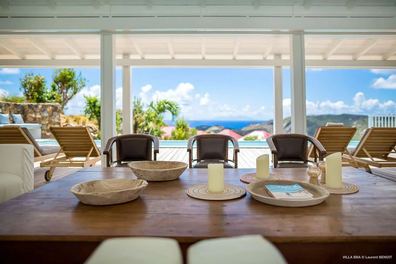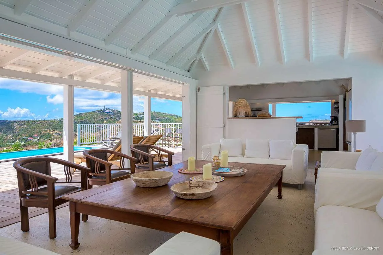 On the other side of the living room is the villa’s lap pool, overlooking the lush hills of St. Barts. Loungers lining the water let you bask in the island sun. From this vantage point high in the hills, the sunsets are stunning. A large terrace has an extended covered lounge area, which is ideal for either sunbathing or relaxing in the shade.