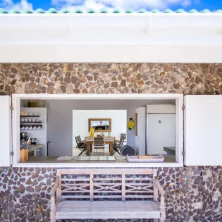 Flowing on from the kitchen is the dining room, with a beautiful and rustic wooden table that seats 8 guests. Opening to a covered terrace, the views over the rolling hills from here are stunning, the ideal accompaniment to an island feast.