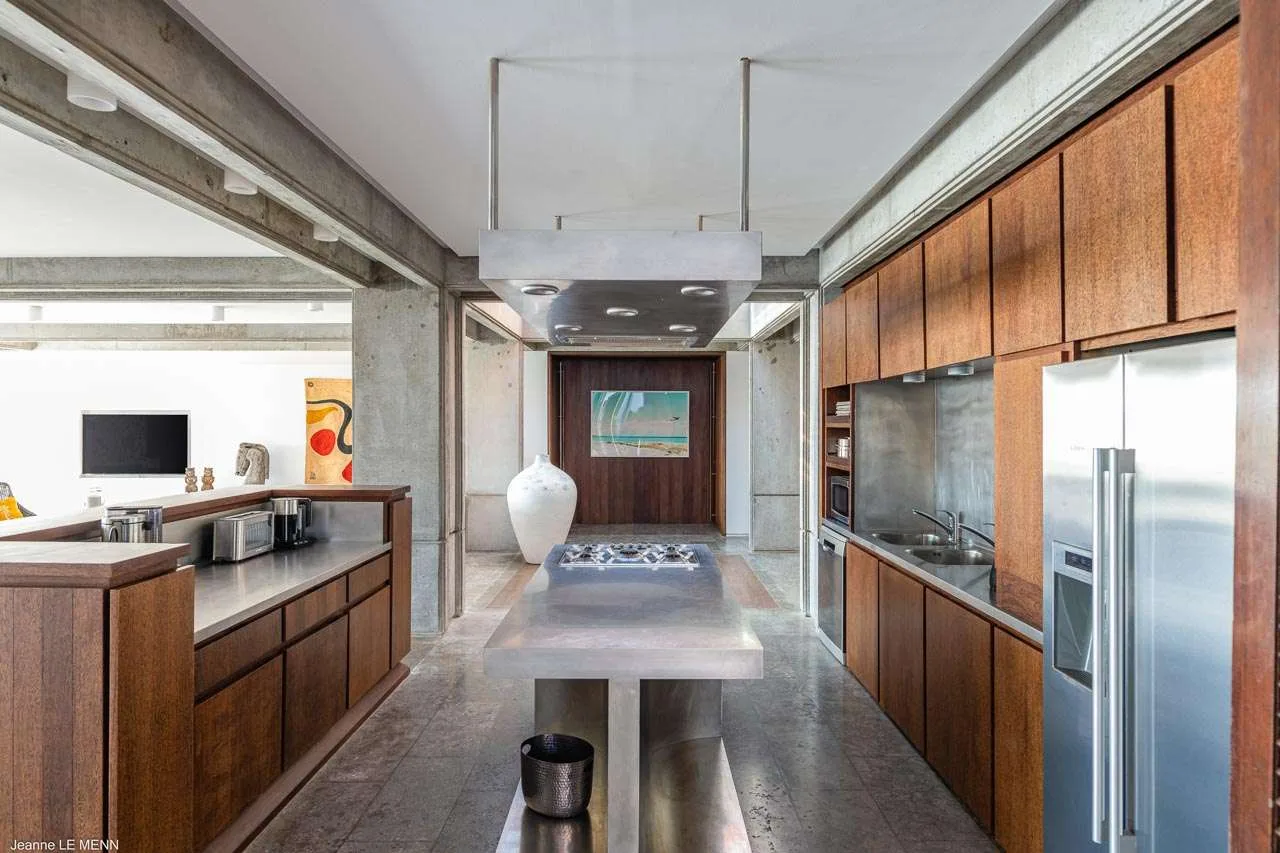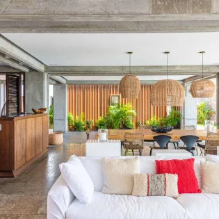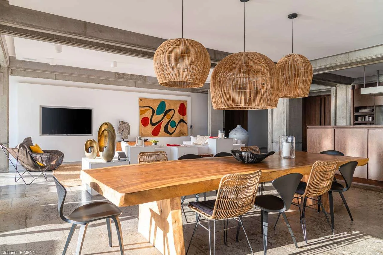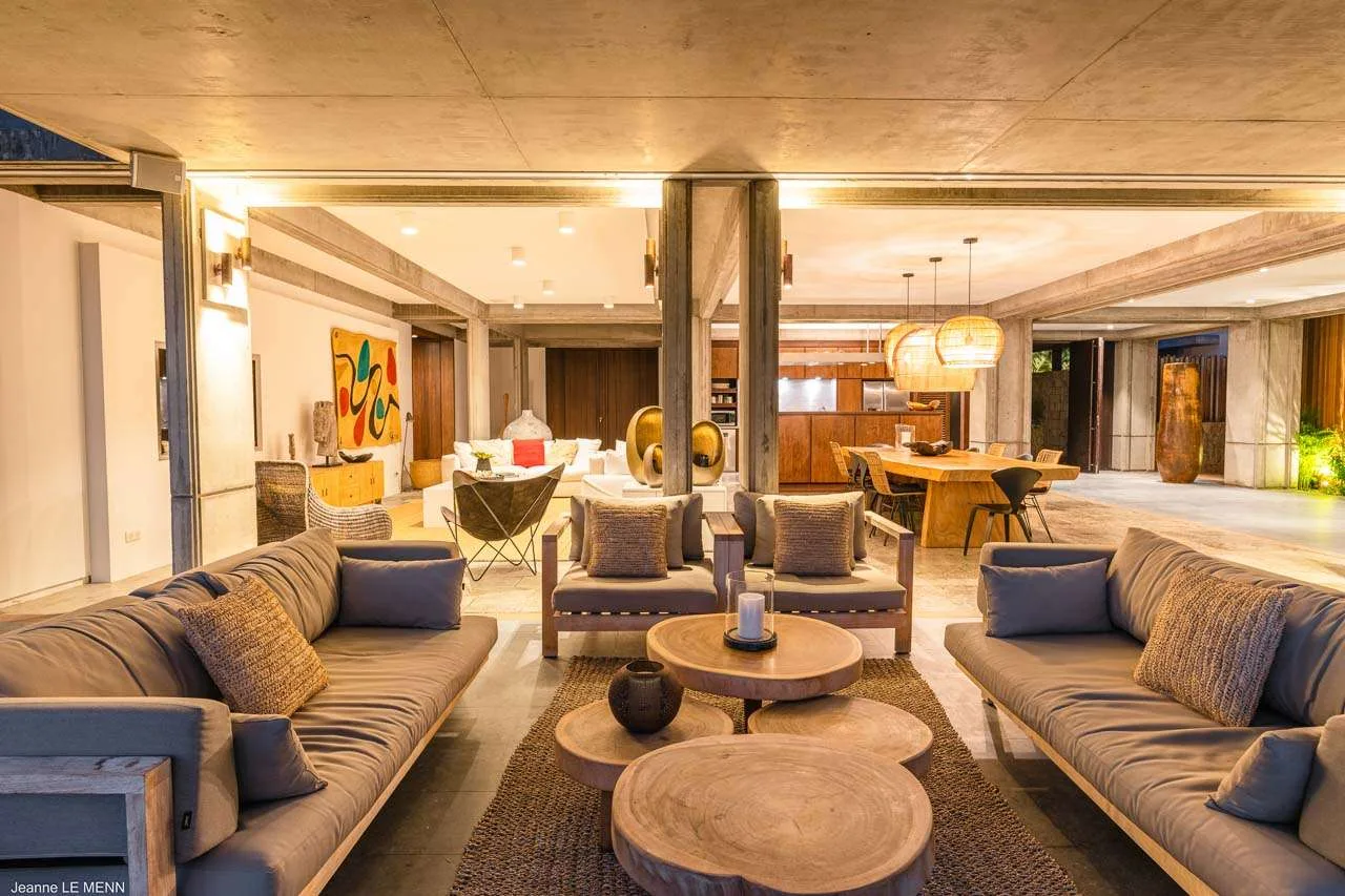 The living room is a beautiful space, with large abstract artwork on the wall setting the tone. Vibrant and unique, this room is equally suited for a quiet day reading or entertaining family and friends. Exposed concrete beams in the ceiling give the great room an industrial-chic feel, tempered by a warm tropical décor.