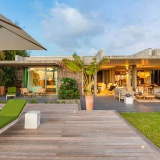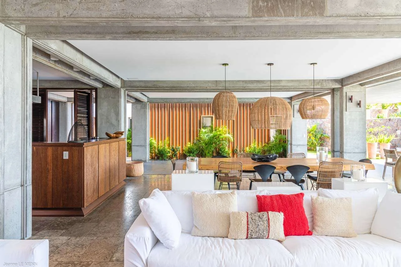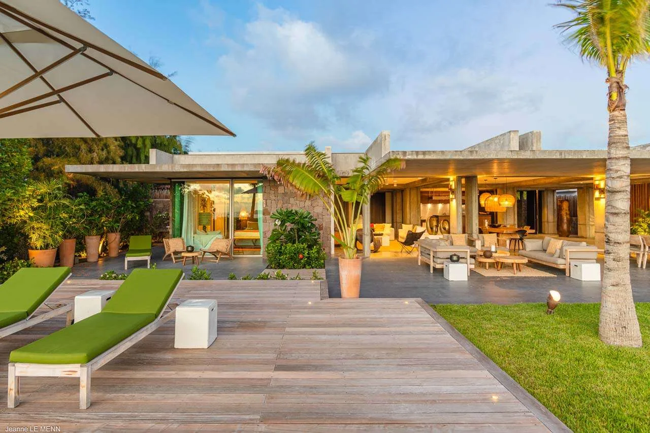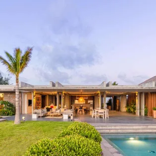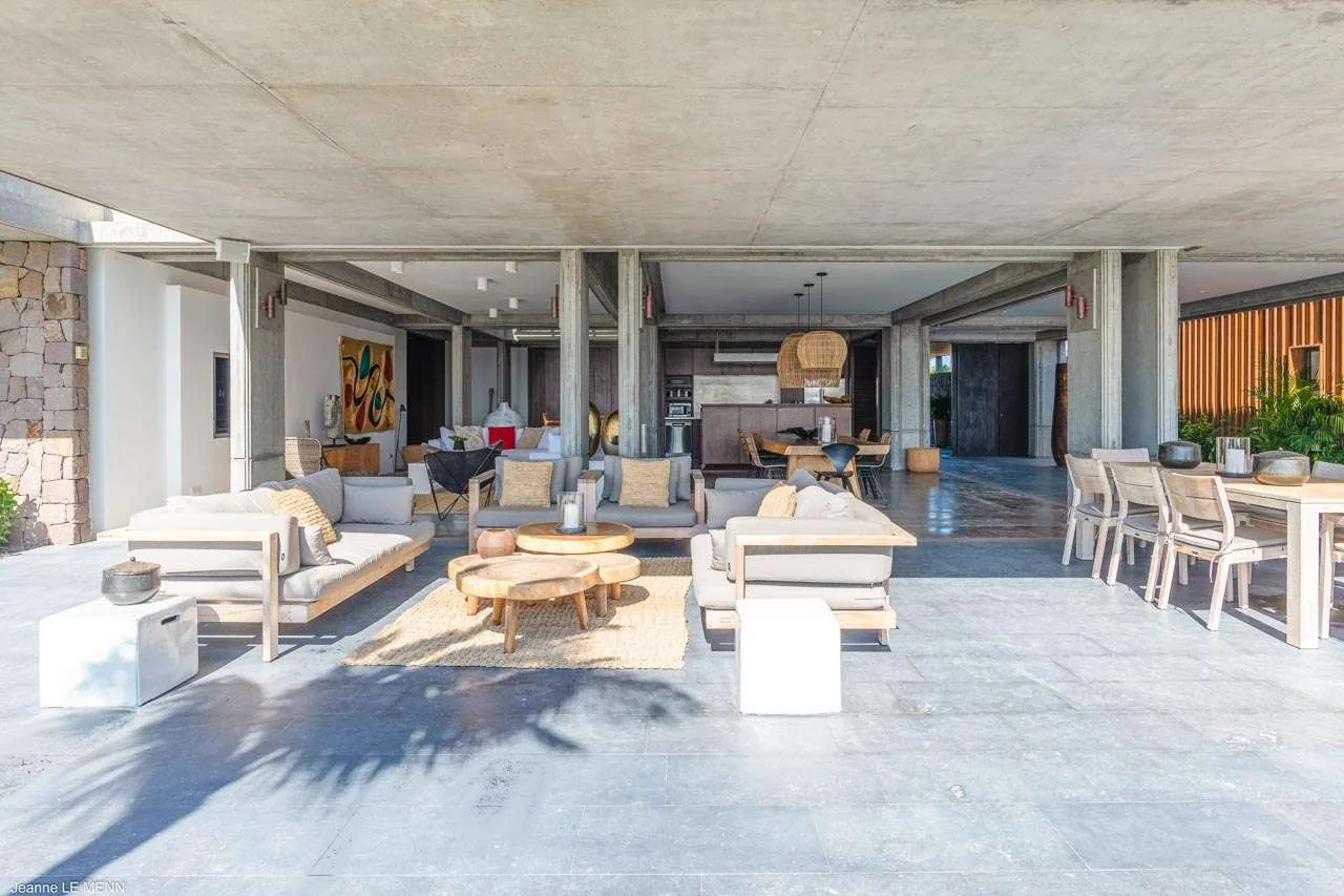 The indoor spaces flow elegantly into the outdoor living areas, creating a large and spacious area awash with the island breezes. There’s a low-slung sofa here, ideal for lazy days reading or an indulgent afternoon nap while the palm trees rustle in the gentle wind.