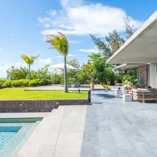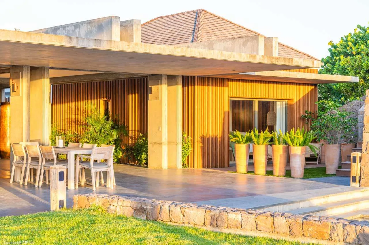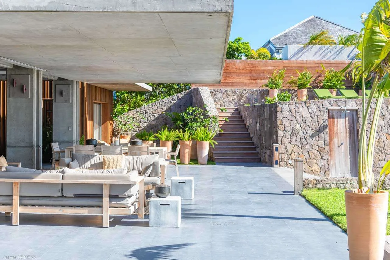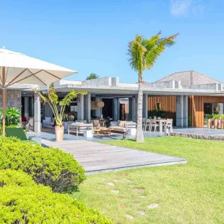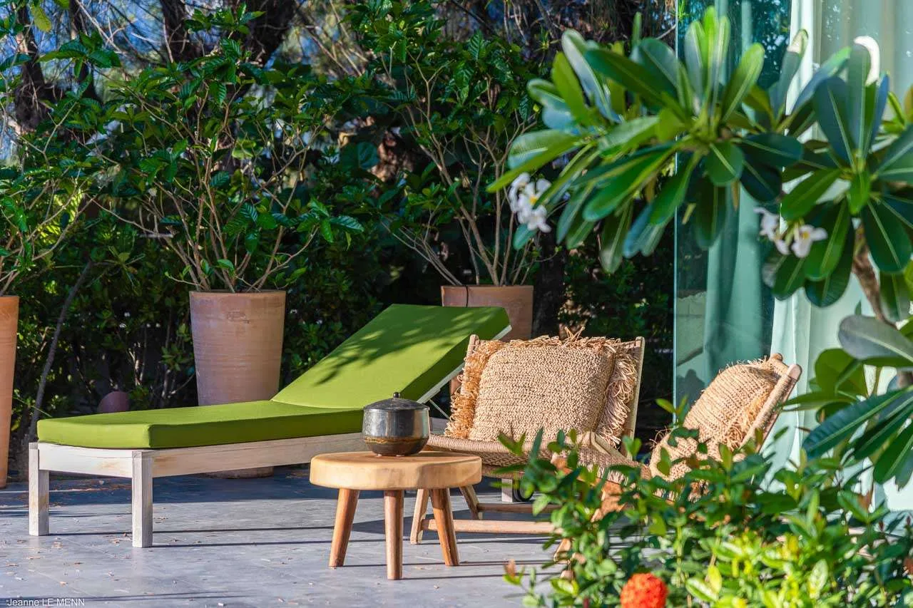 The indoor spaces flow elegantly into the outdoor living areas, creating a large and spacious area awash with the island breezes. There’s a low-slung sofa here, ideal for lazy days reading or an indulgent afternoon nap while the palm trees rustle in the gentle wind.