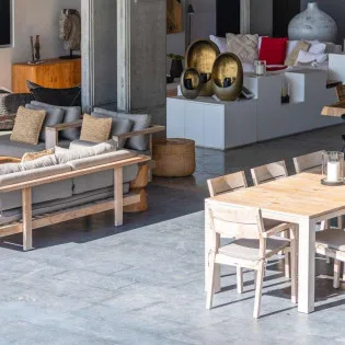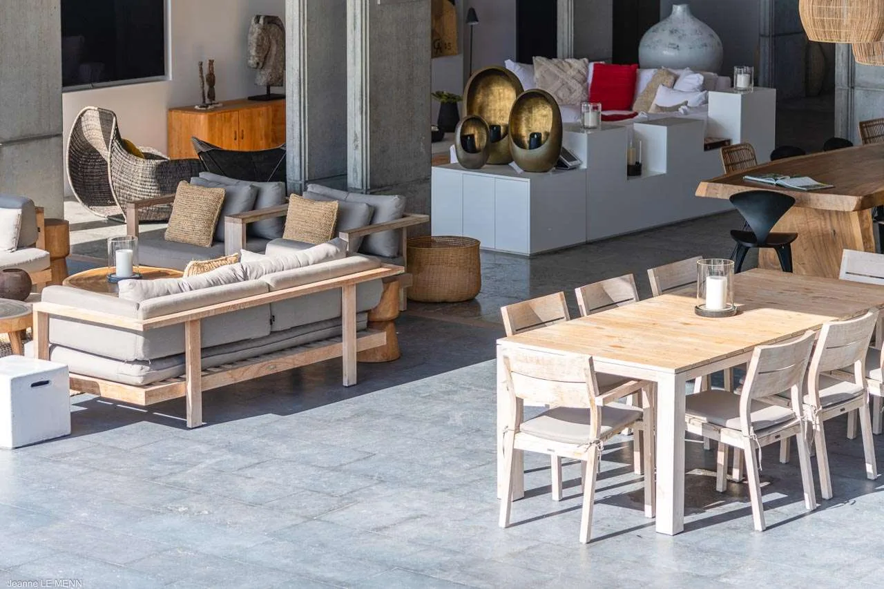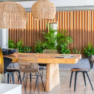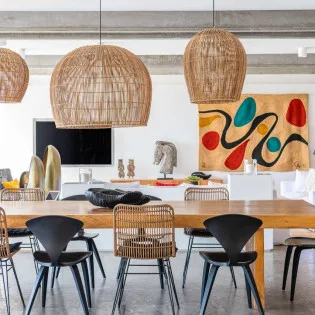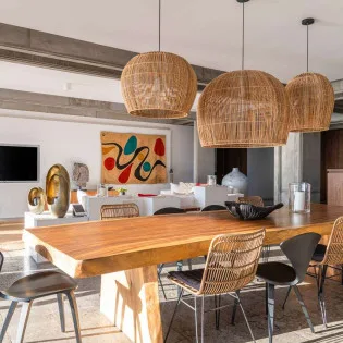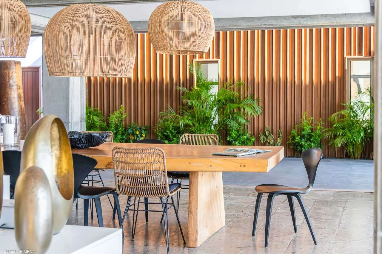 The indoor dining table is elegant, made from beautiful wood, and with large, woven light fixtures overhead. Rustic, luxurious, and contemporary, it’s a fabulous setting for meals with family and friends.