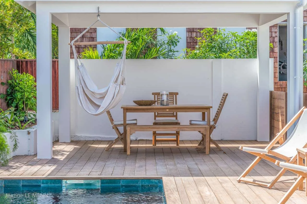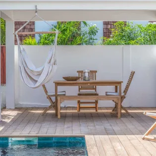 The plunge pool is an inviting spot to spend the day, lounging in the water with a cool drink. Loungers lining the water let you dry off and sunbathe. Next to the dining gazebo is a hammock, an ideal spot for reading or dozing off in the cool island breeze.