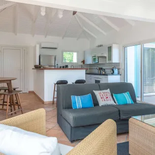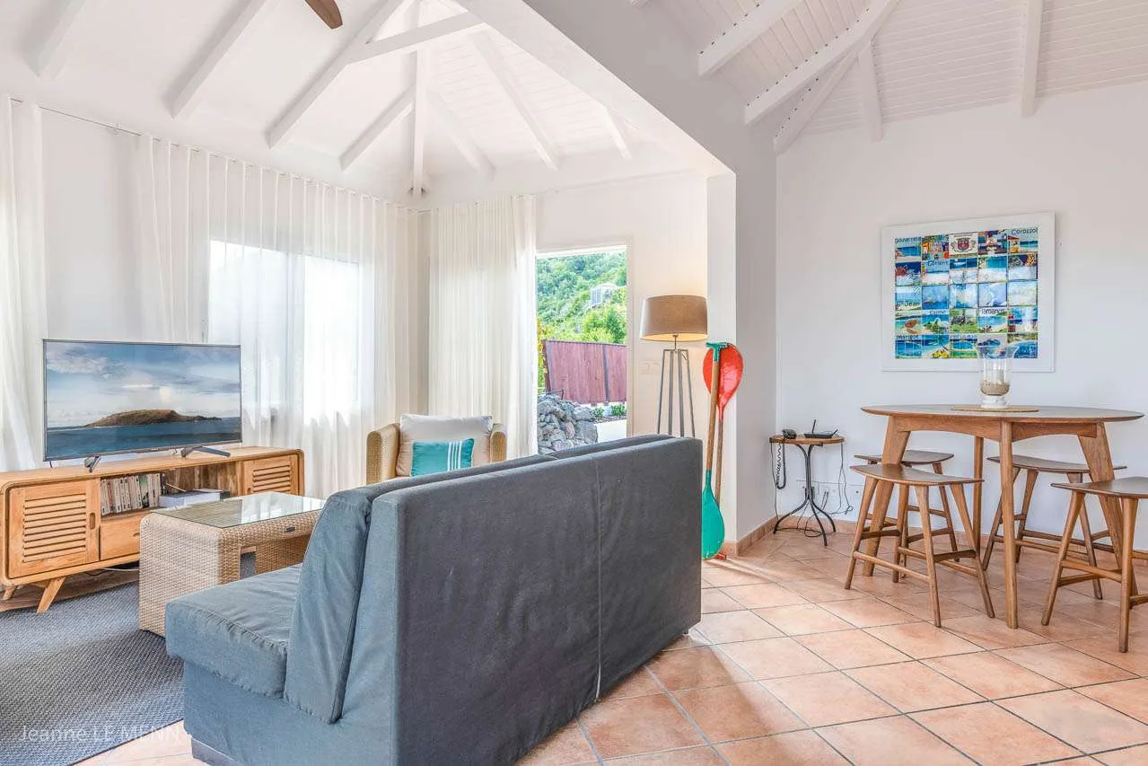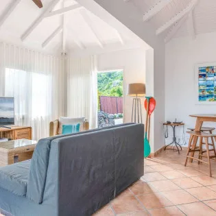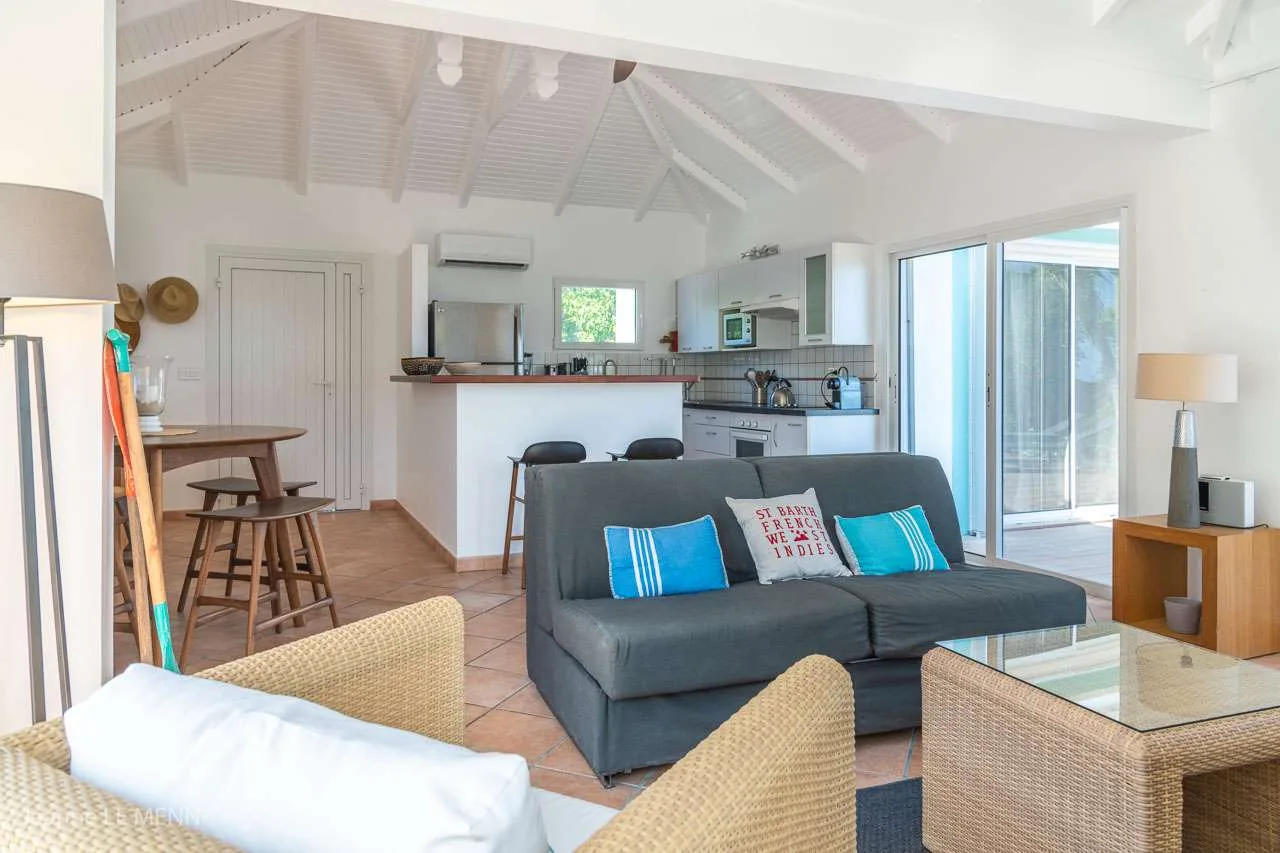 The cozy, air-conditioned main room at Villa Telemaque is home to the living room, dining area, and kitchen. Doors open to two separate terraces on both sides, letting you bathe the room in natural light and the cool island breeze.