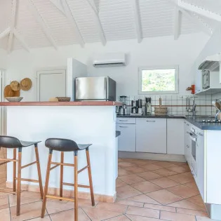 Behind the living room is Villa Telemaque’s modern kitchen. The high-end appliances here will make cooking a breeze. Our concierge can even organize grocery pre-stocking or delivery, catered meals, or arrange private chef service for a special occasion.