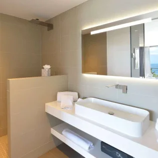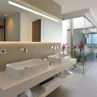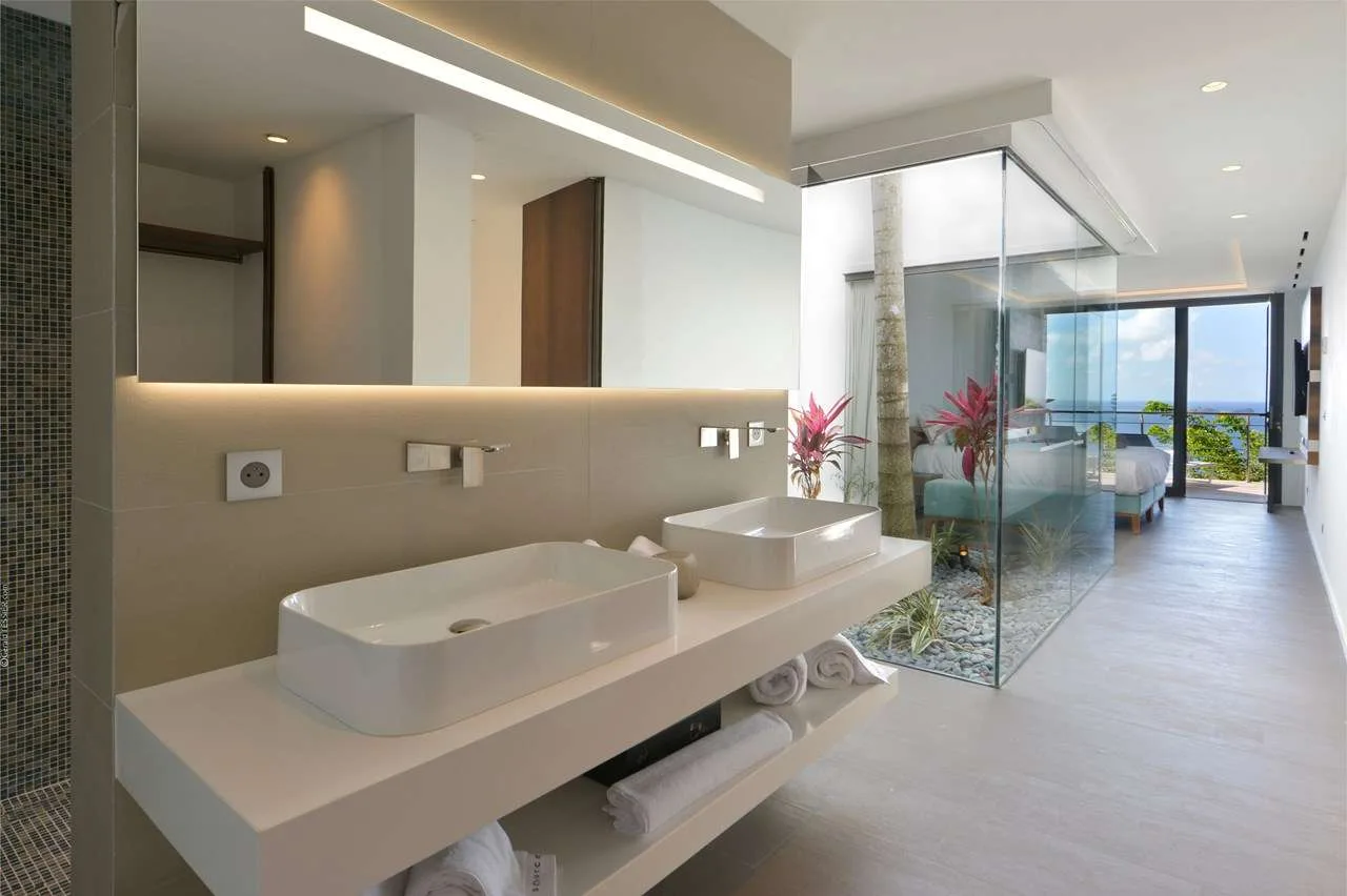 The fourth bedroom is slightly larger and has a walk-in closet, and a glass feature between the bedroom and bathroom, allowing for ocean views while taking a shower.