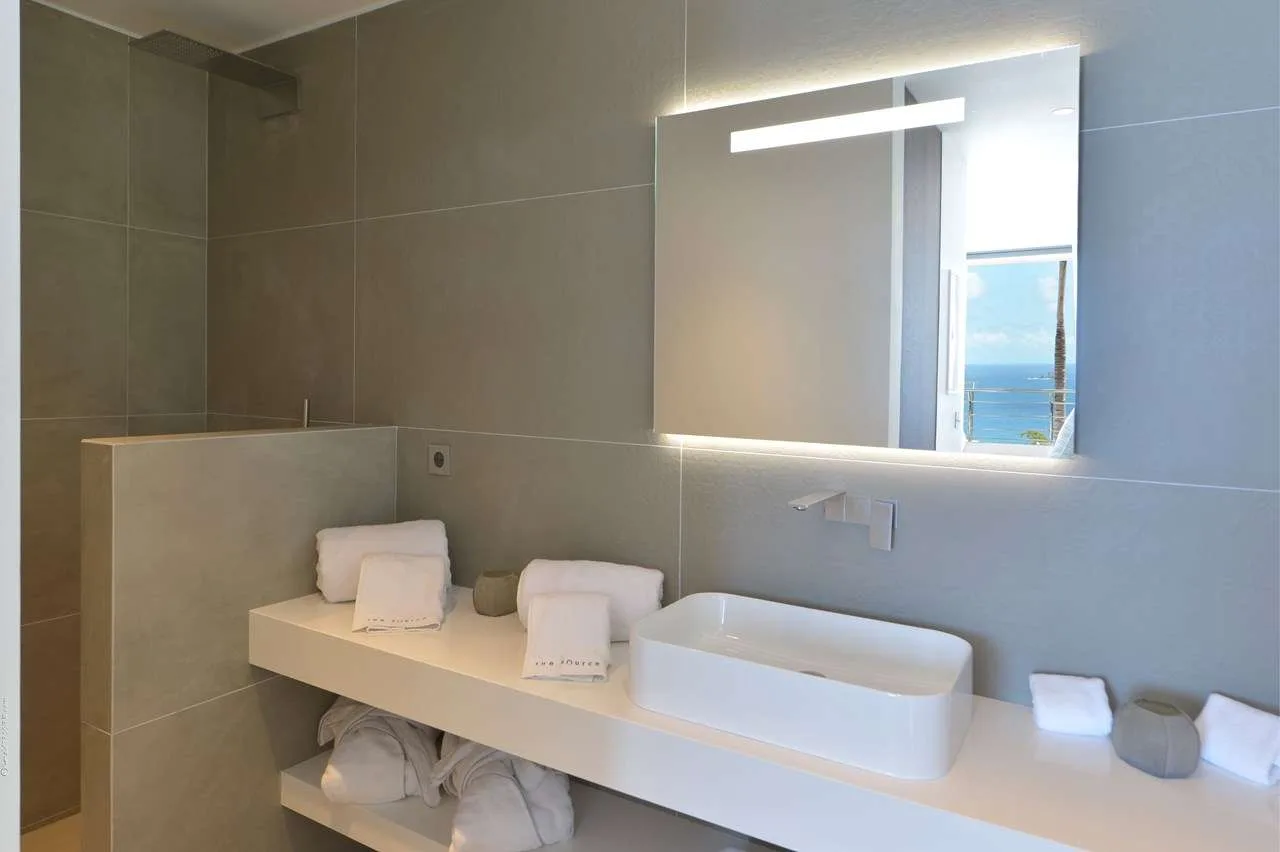 Outdoor living spaces at Villa The Source offers ample room to spend your days lounging in sun and shade, as a group or by yourself. The views from both decks are incredible, with the striking turquoise water sparkling underneath the island sun.