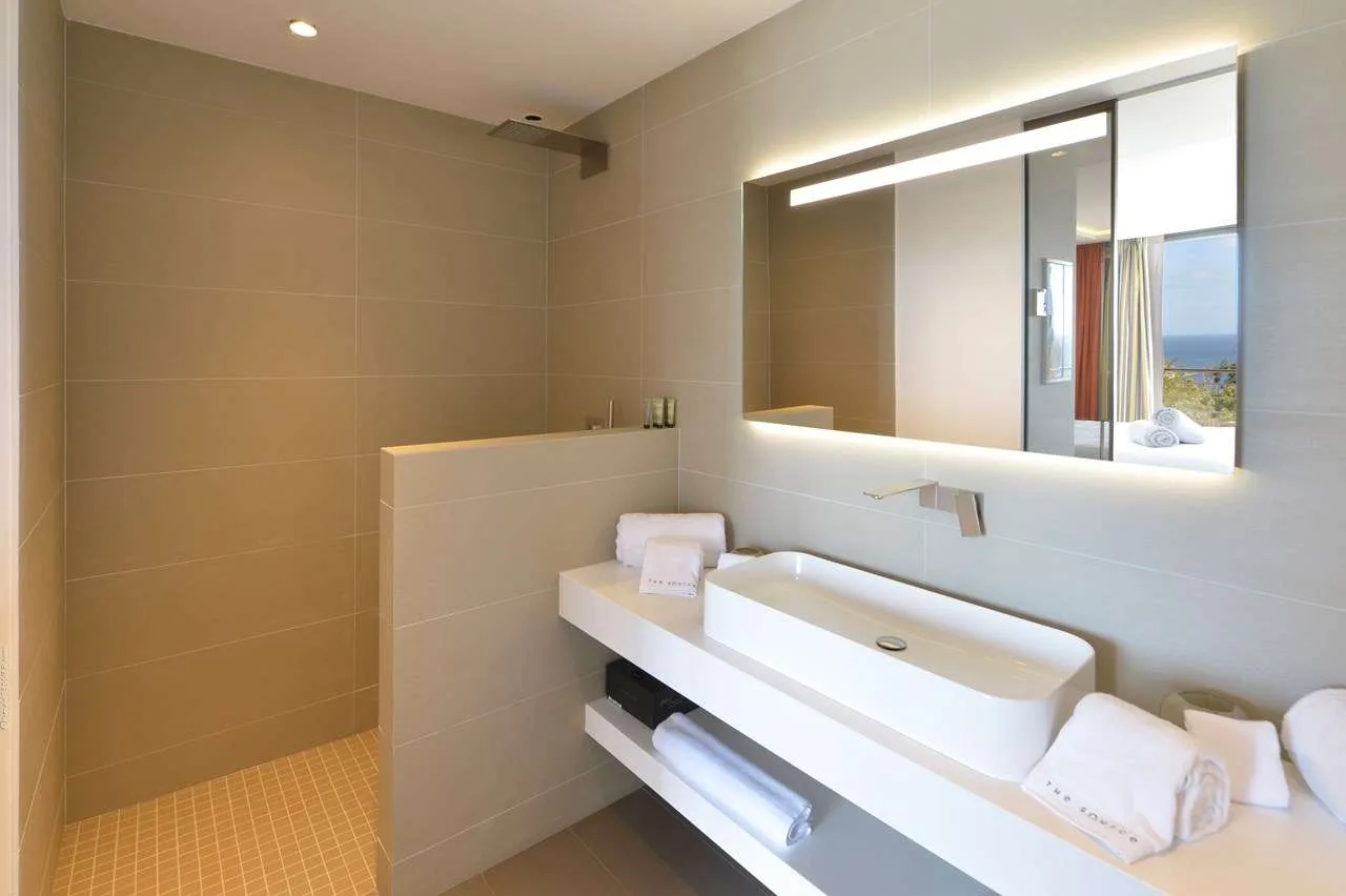 The covered terrace area features a beautiful outdoor lounge, letting you host cocktail hours or entertain guests. From here, loungers line the villa’s swimming pool, with a beautiful infinity edge blurring the line between the edge of the terrace and the ocean below. The lower-level terrace completes the home, with a beautiful hot tub sheltered by swaying palms.