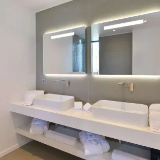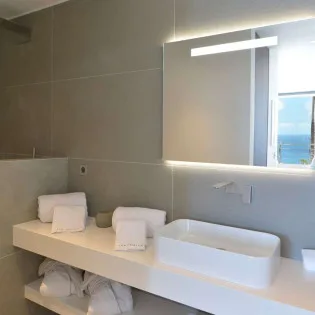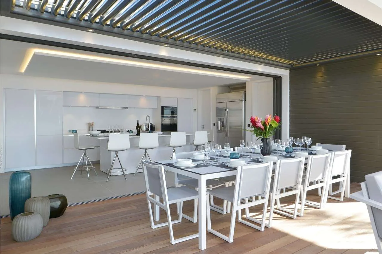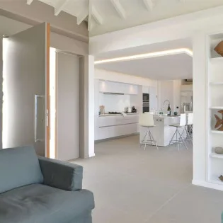 The generous living room features comfortable couches for relaxing, gazing out at the shimmering sea, and forgetting the ruses of modern life. An eye-catching feature is the framed, in-wall wine cellar, with a tempting and tasteful selection – ideal for gourmet dinners with family and friends.
